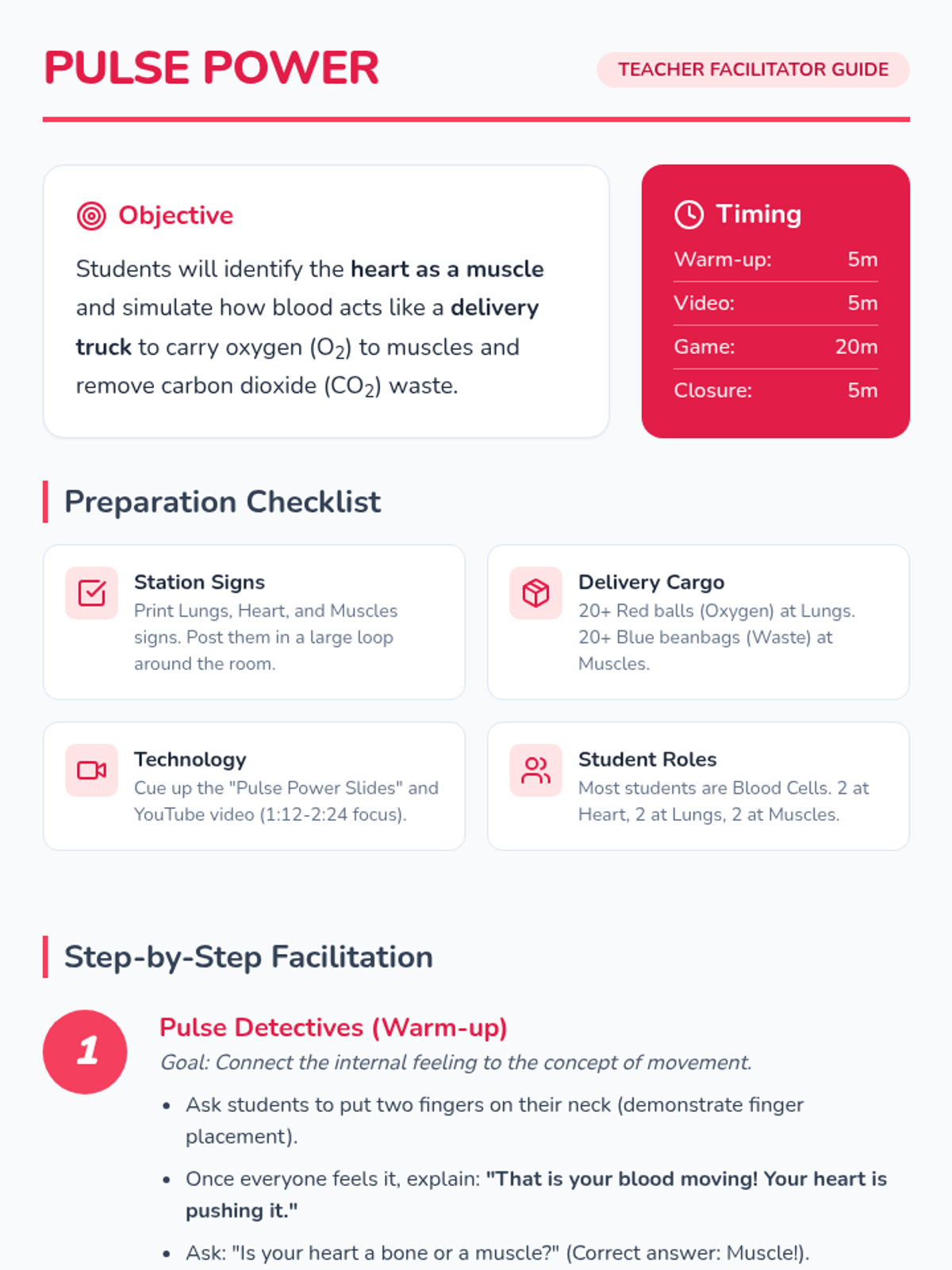 Students will discover the heart's role as a powerful muscle and simulate the circulatory system's delivery of oxygen and removal of waste through a high-energy role-play game.