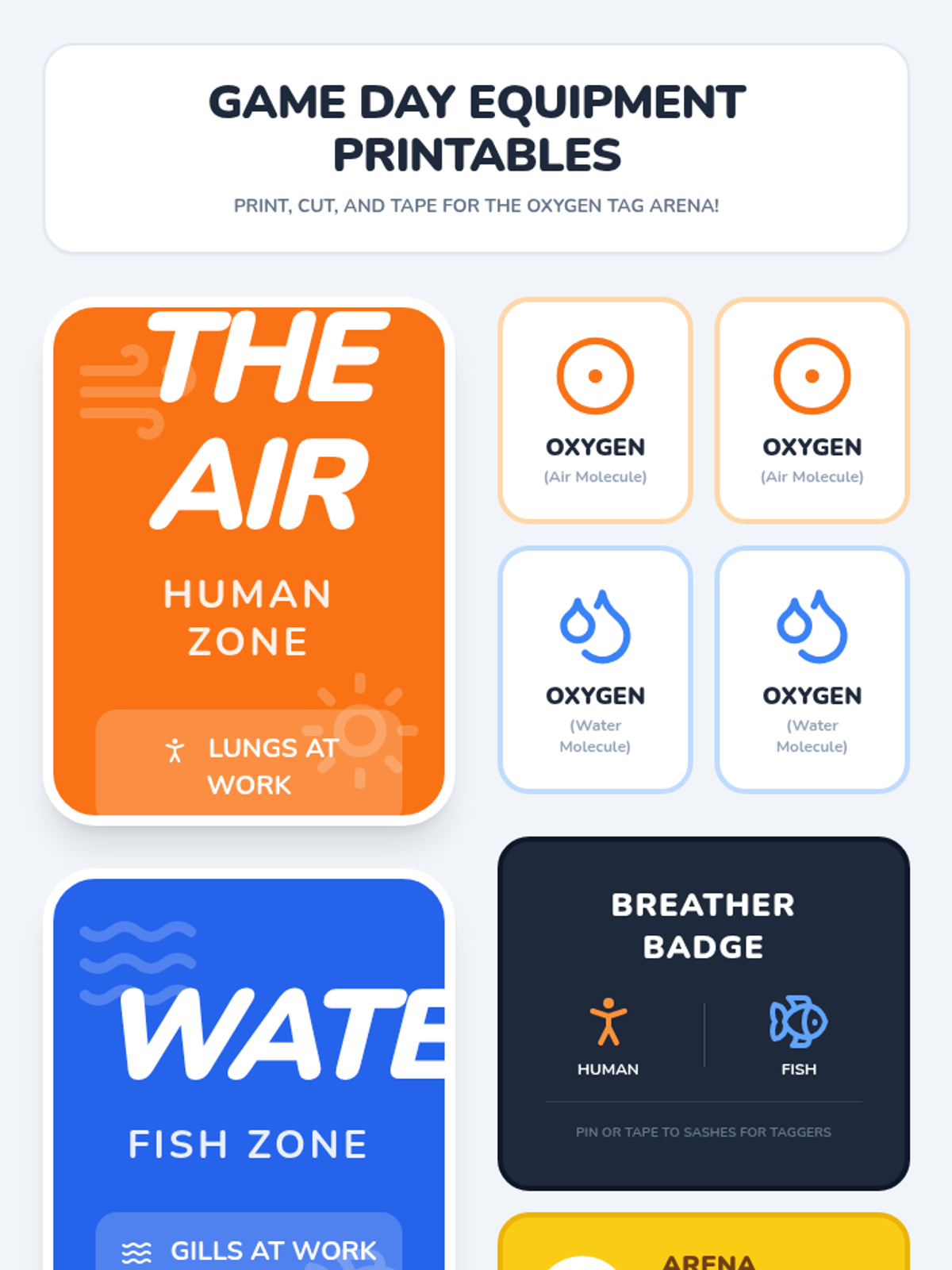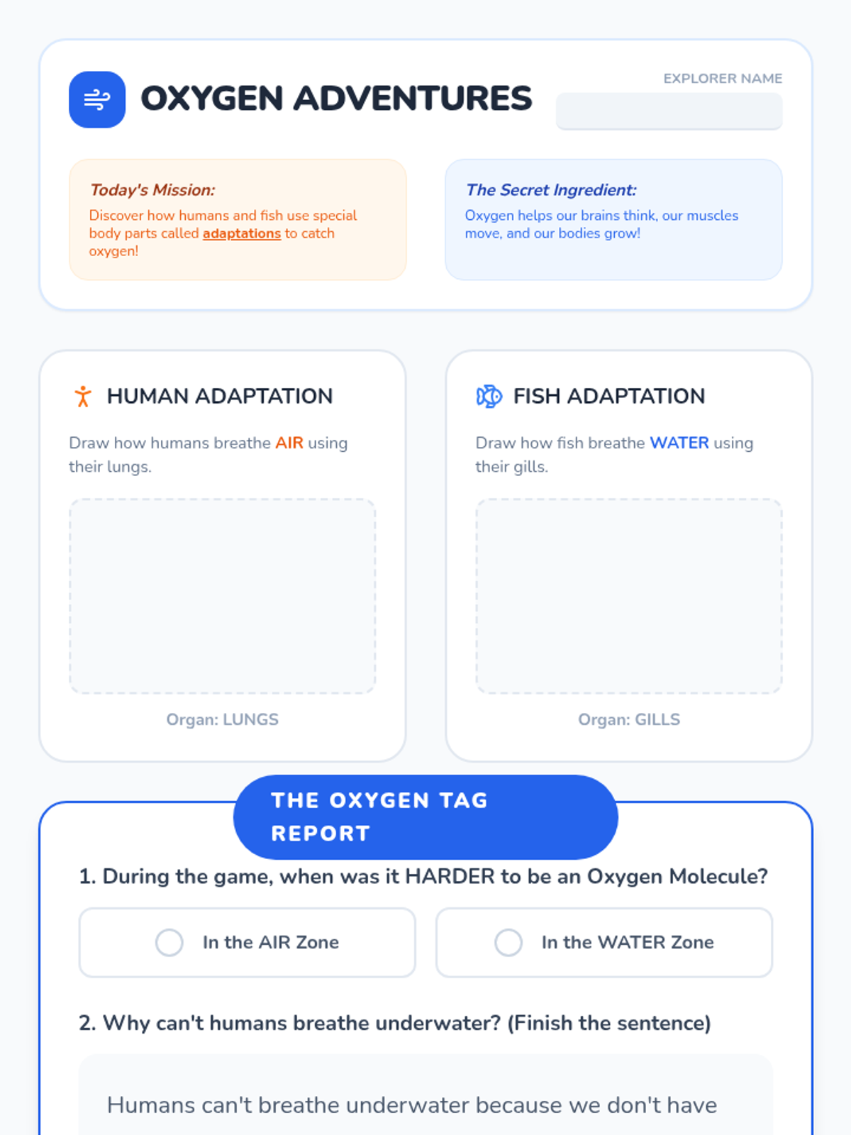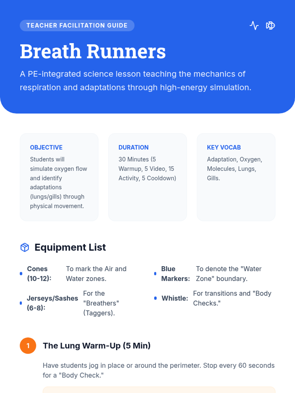A high-energy physical education lesson where students simulate the respiratory systems of humans and fish through a fast-paced game of tag, exploring adaptations like lungs and gills.
