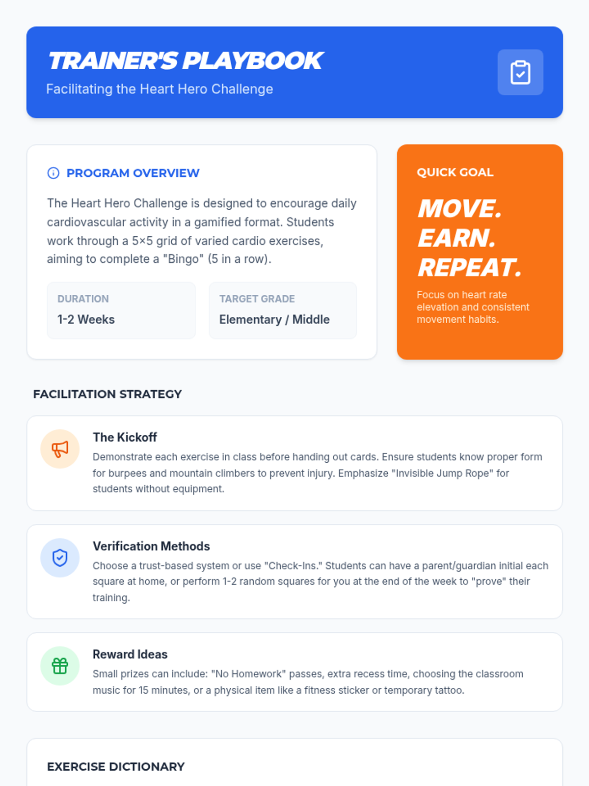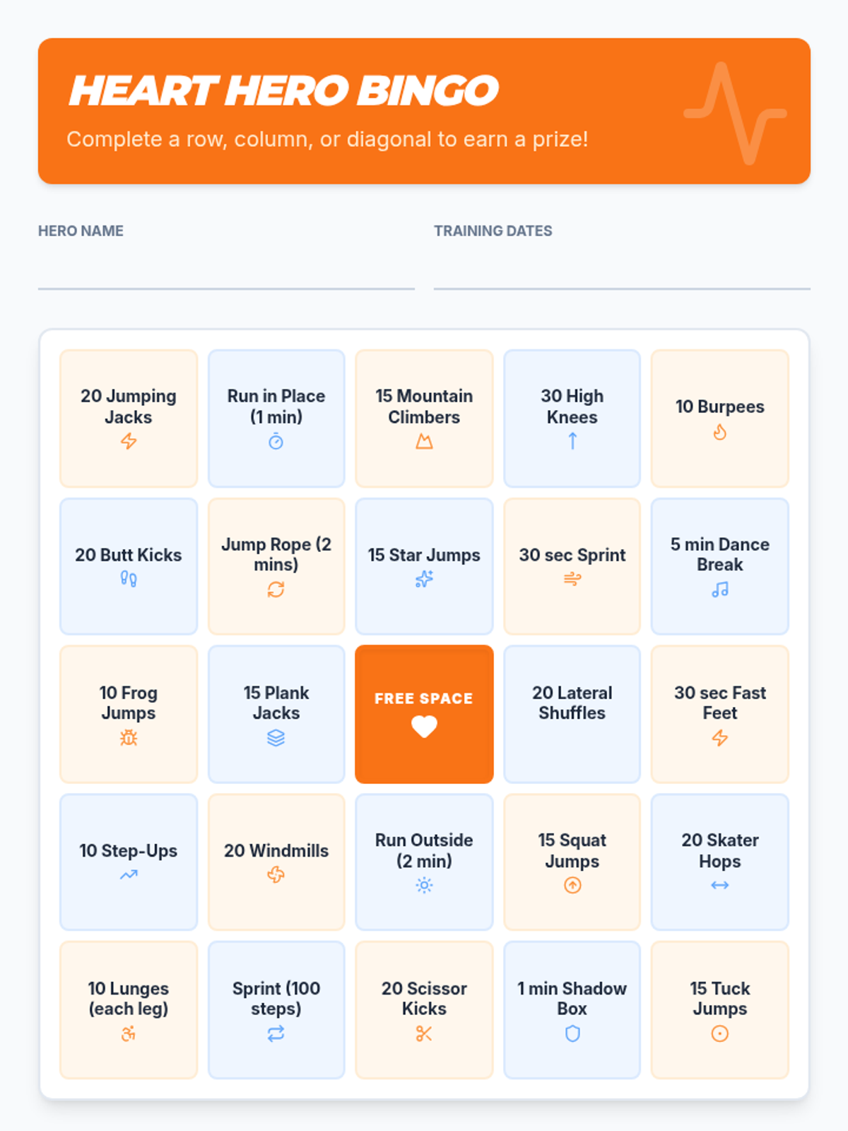 A fun, active challenge to get students moving through a cardio-focused bingo game. Students track their progress and earn rewards for staying active.