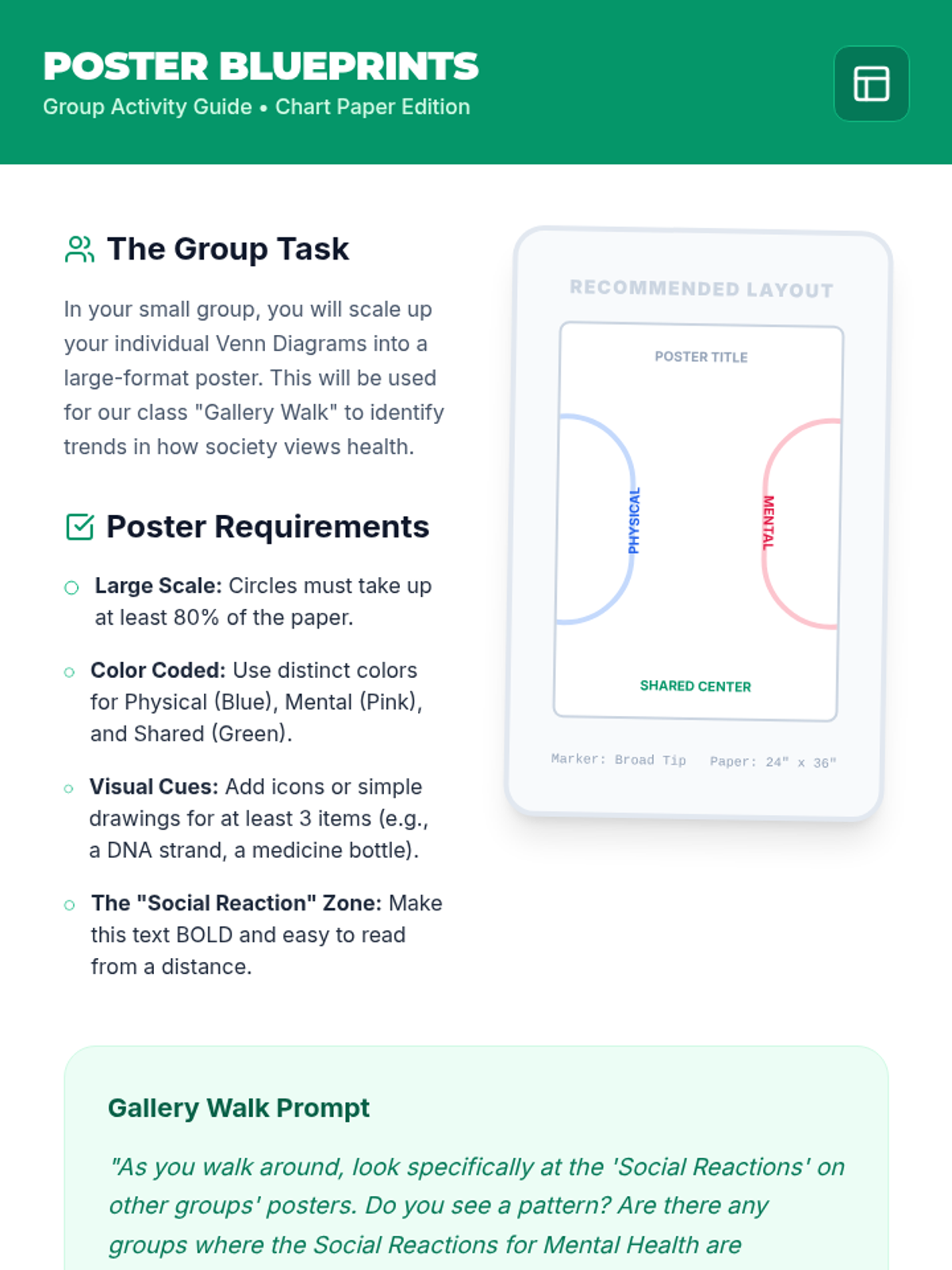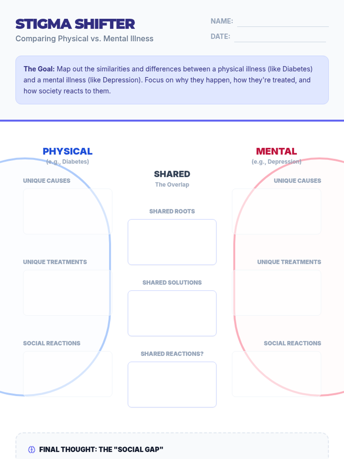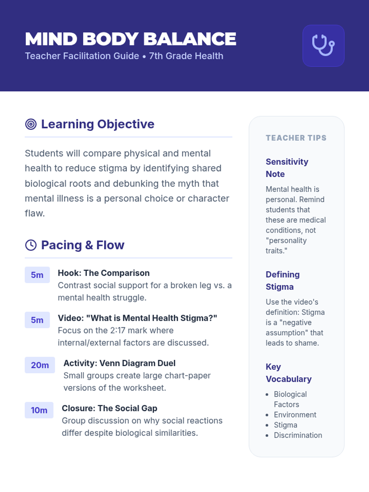 A 7th-grade Health lesson focused on reducing mental health stigma by comparing the causes and treatments of mental illnesses to physical health conditions like diabetes. Students analyze a video and create a Venn Diagram to identify shared biological roots while highlighting the disparity in social reactions.
