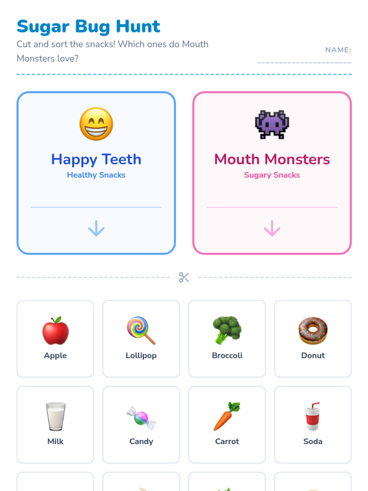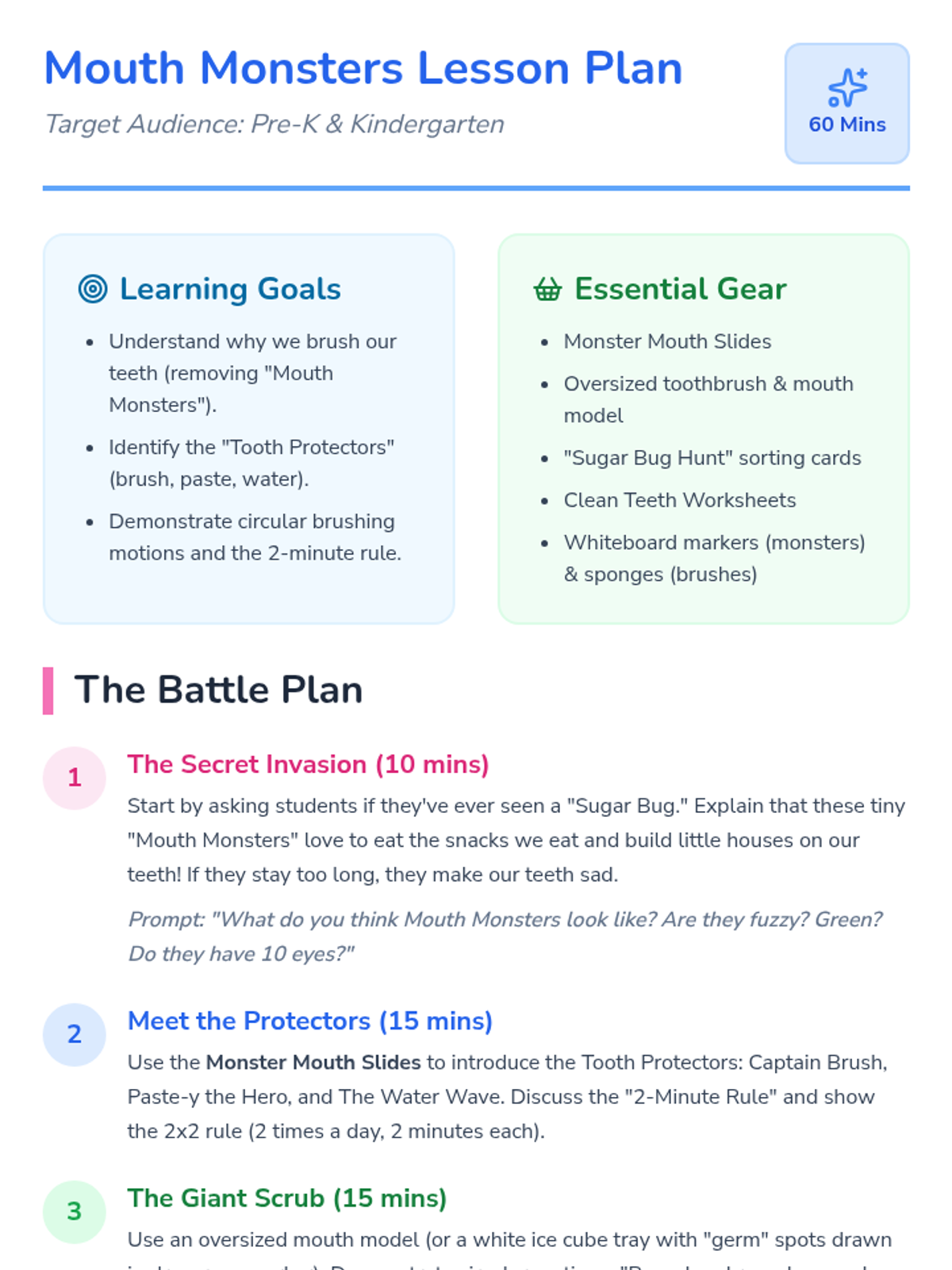 A fun, interactive dental hygiene lesson for Pre-K and Kindergarten students that uses the 'Mouth Monsters' concept to teach the importance of brushing and proper technique. Students will learn through a story, a catchy song, and hands-on practice.