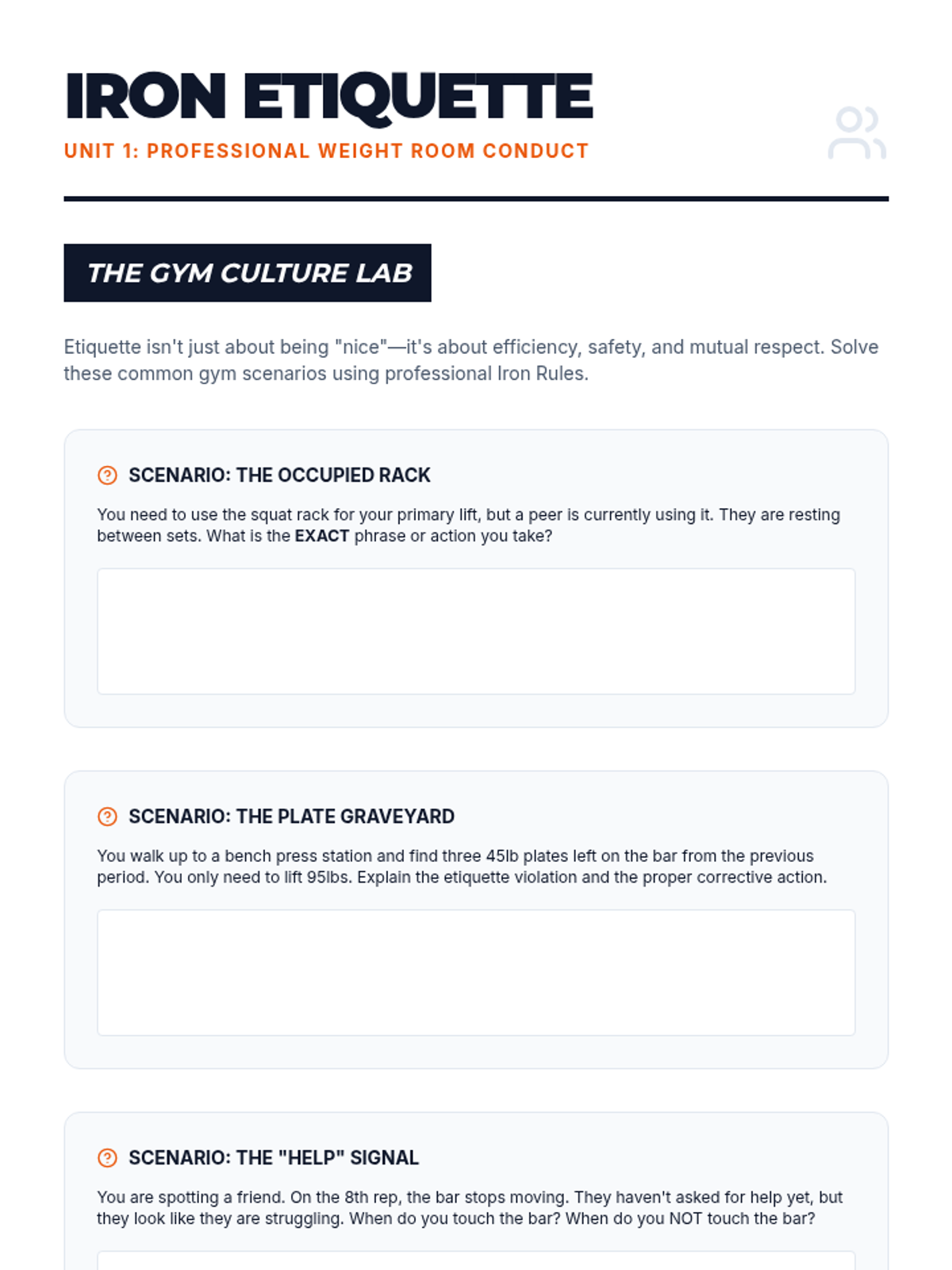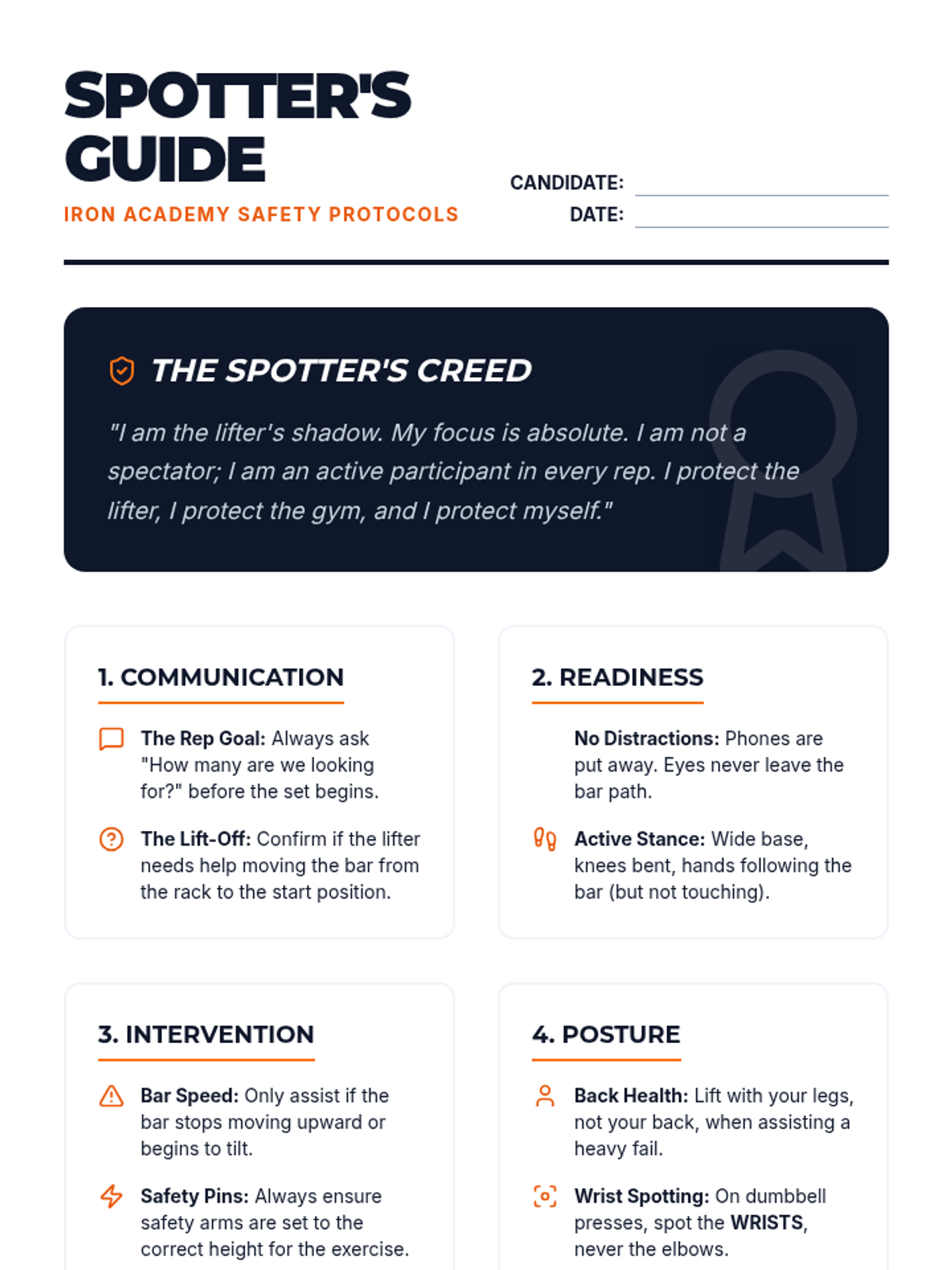 Focuses on weight room safety, professional etiquette, and the critical mechanics of spotting to ensure a safe training environment.
