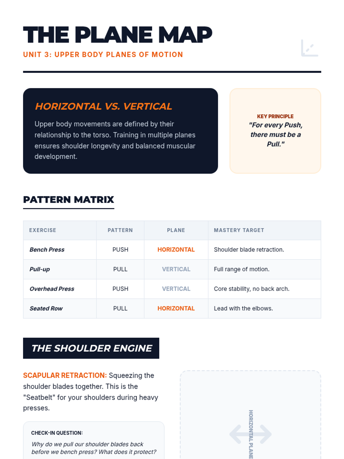 Covers the mechanics of the Push, Pull, Lunge, and Carry patterns, focusing on postural integrity and multi-planar movement.