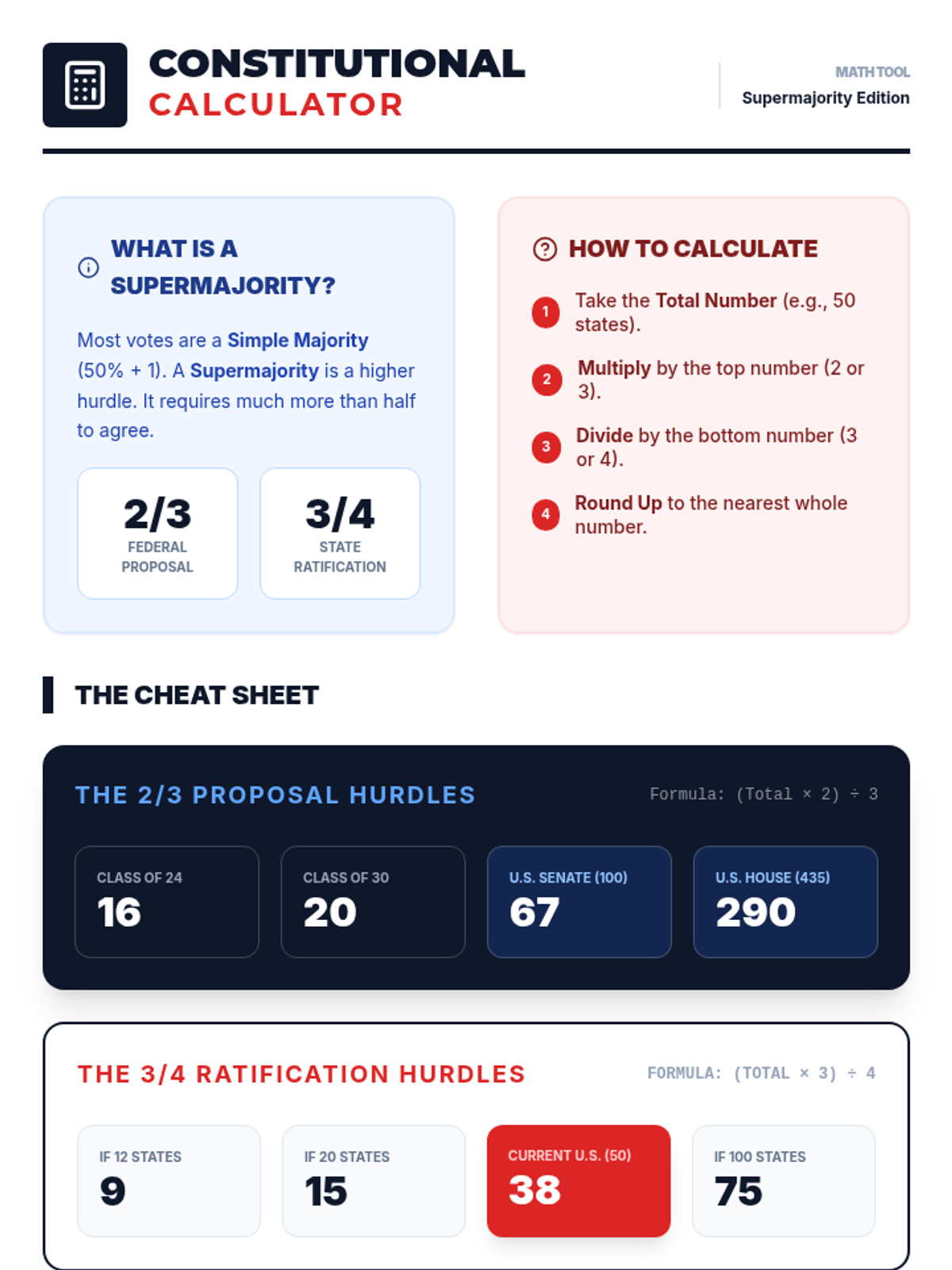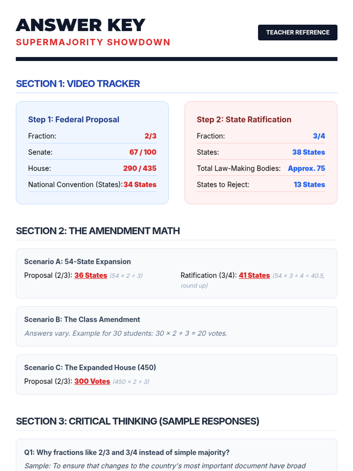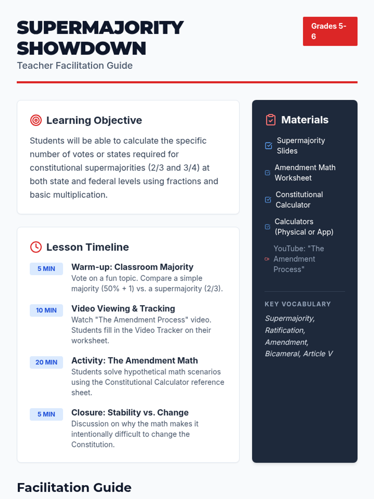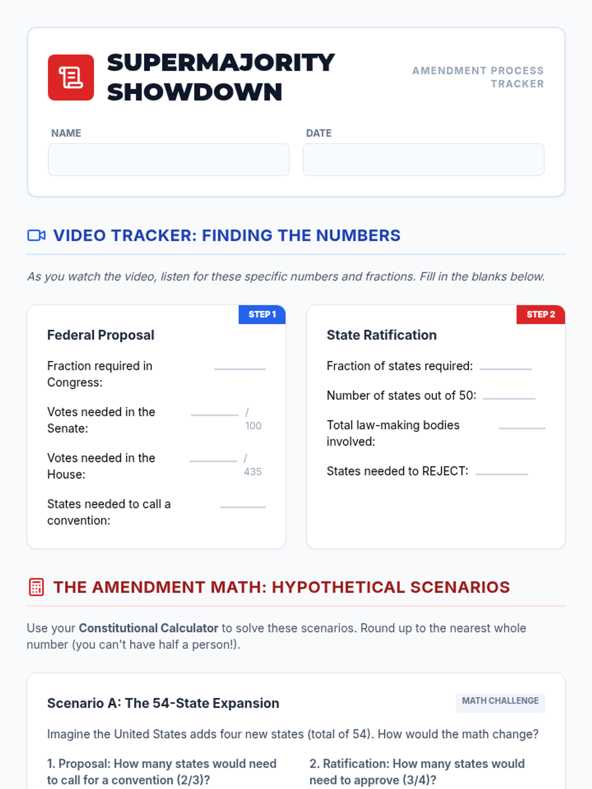 A lesson focusing on the mathematical requirements of the U.S. Constitutional amendment process, requiring students to calculate supermajorities at both state and federal levels.