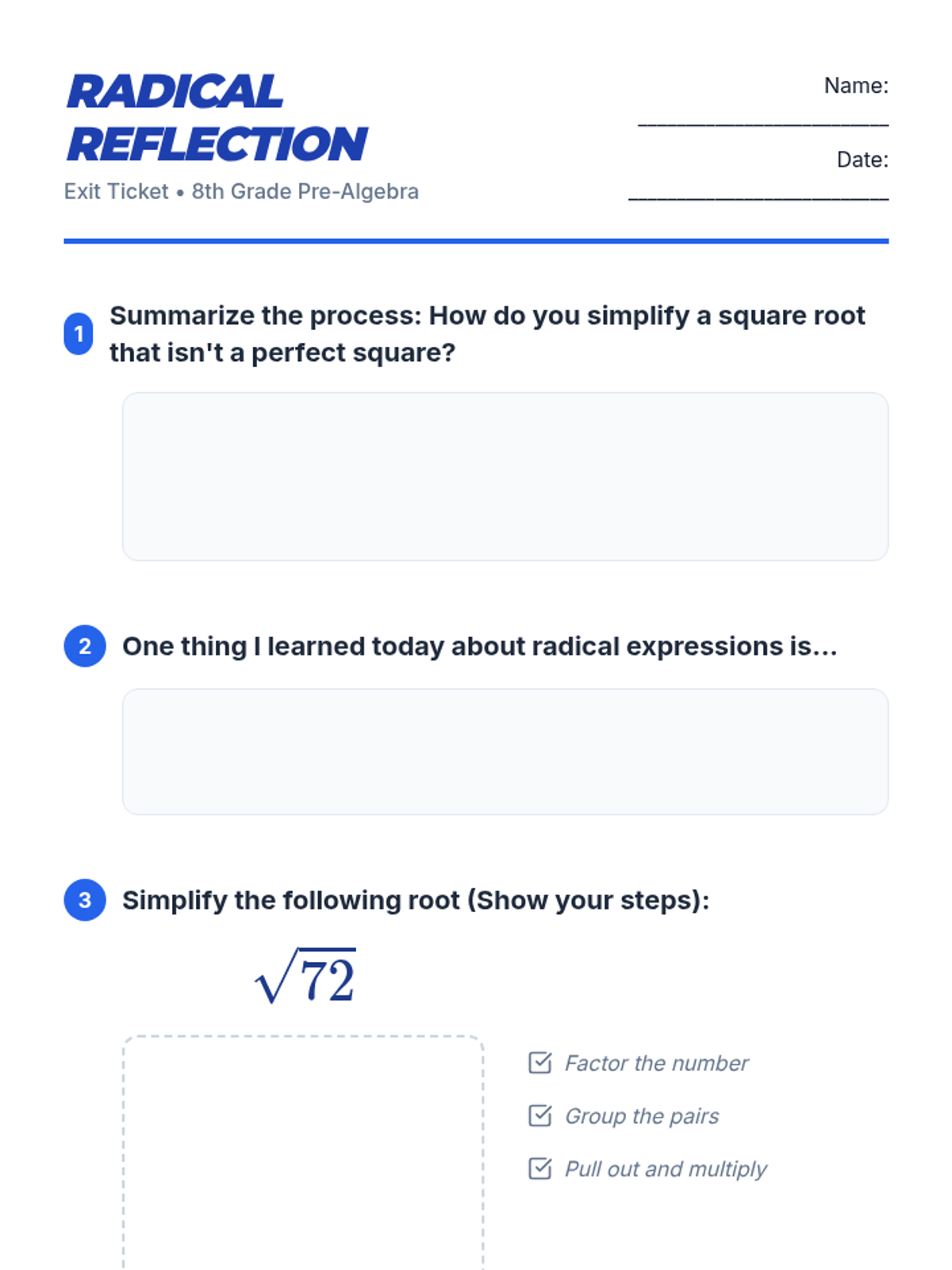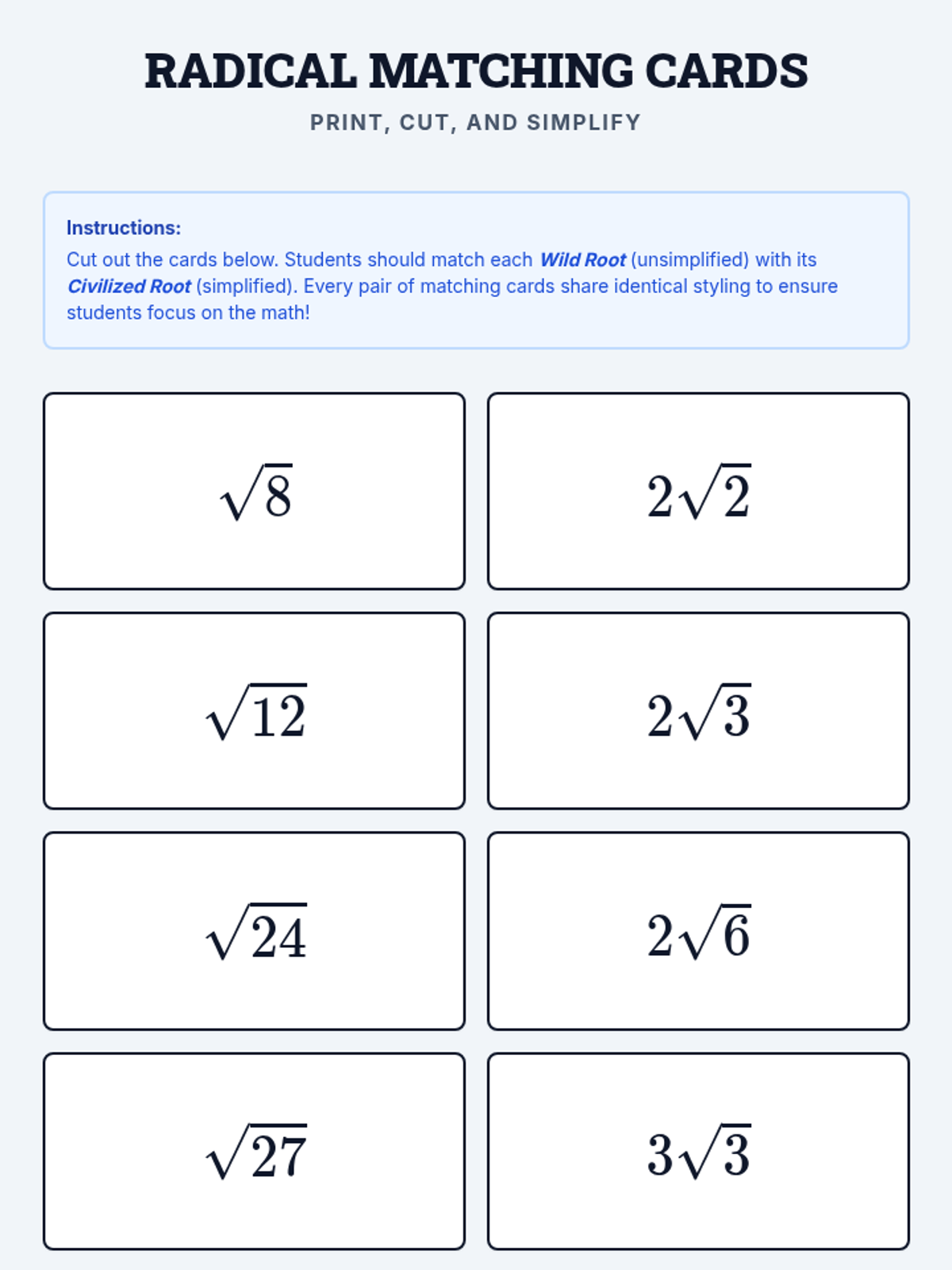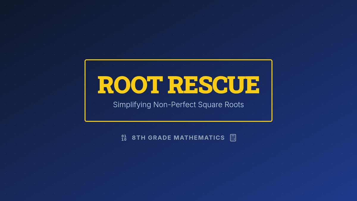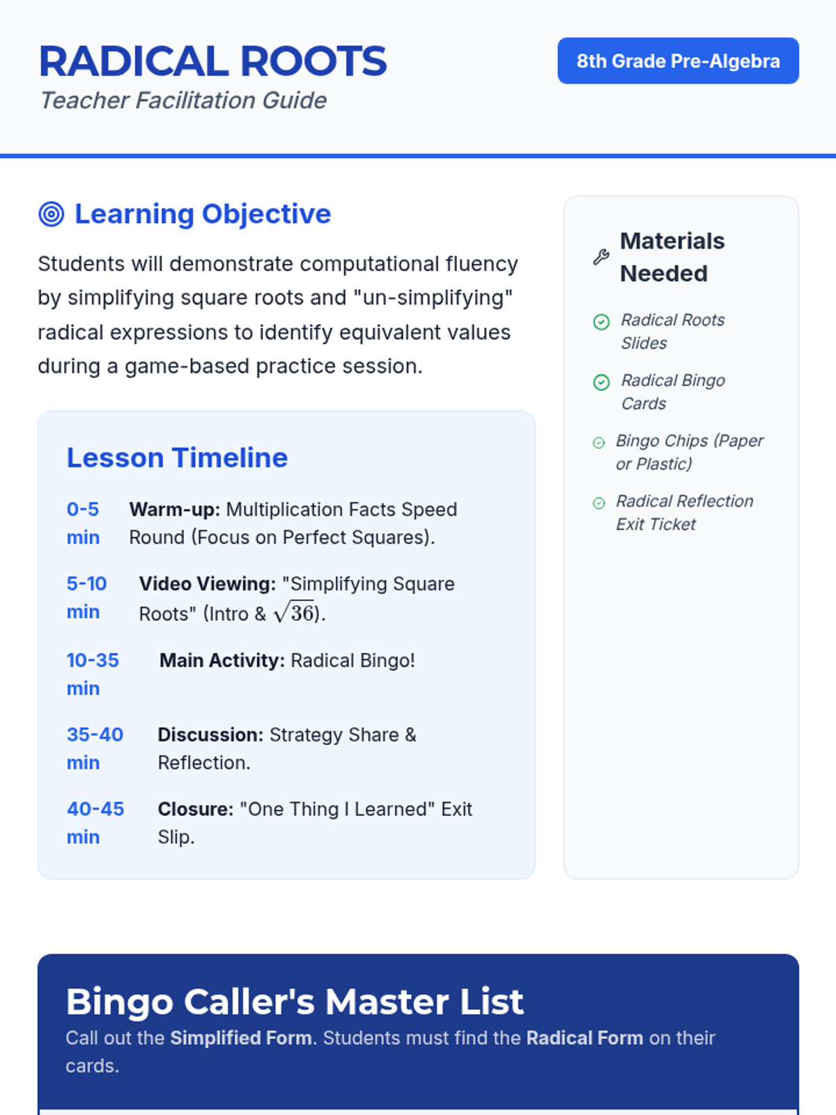 A high-energy 8th-grade lesson focusing on radical simplification through visual instruction and a competitive 'Radical Bingo' game. Students practice converting between simplified and unsimplified radical forms to build computational fluency.