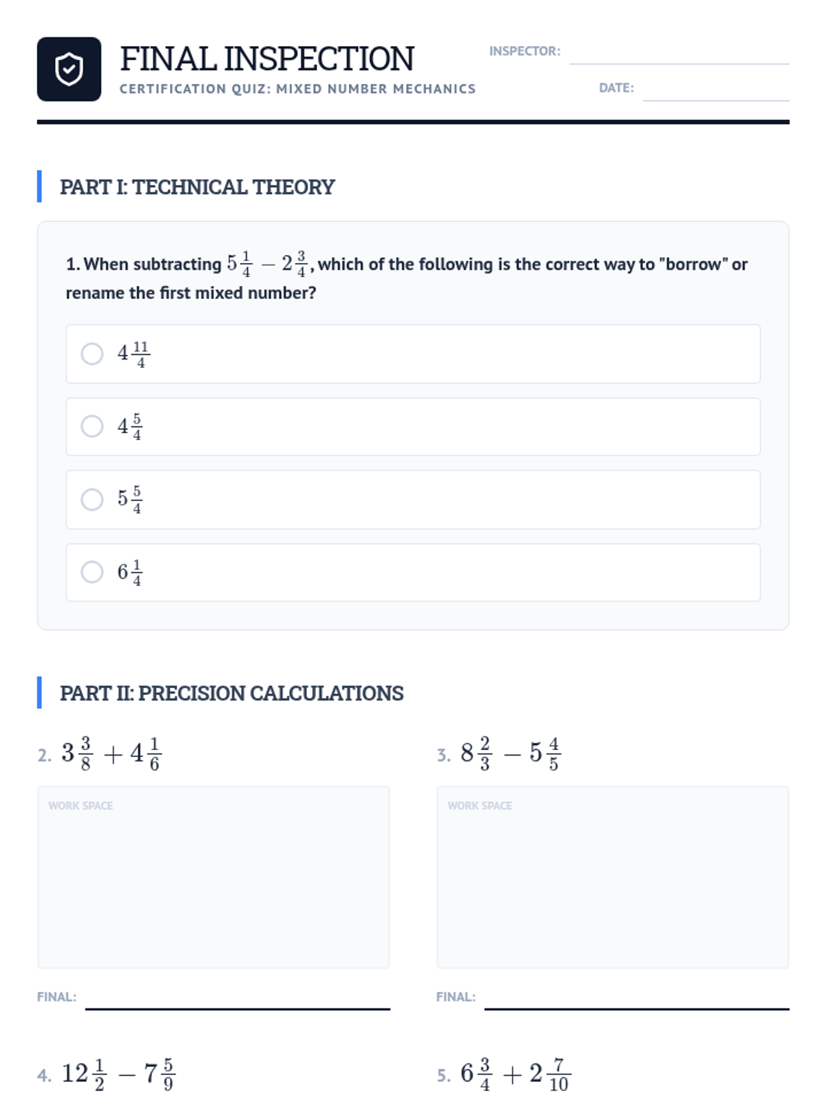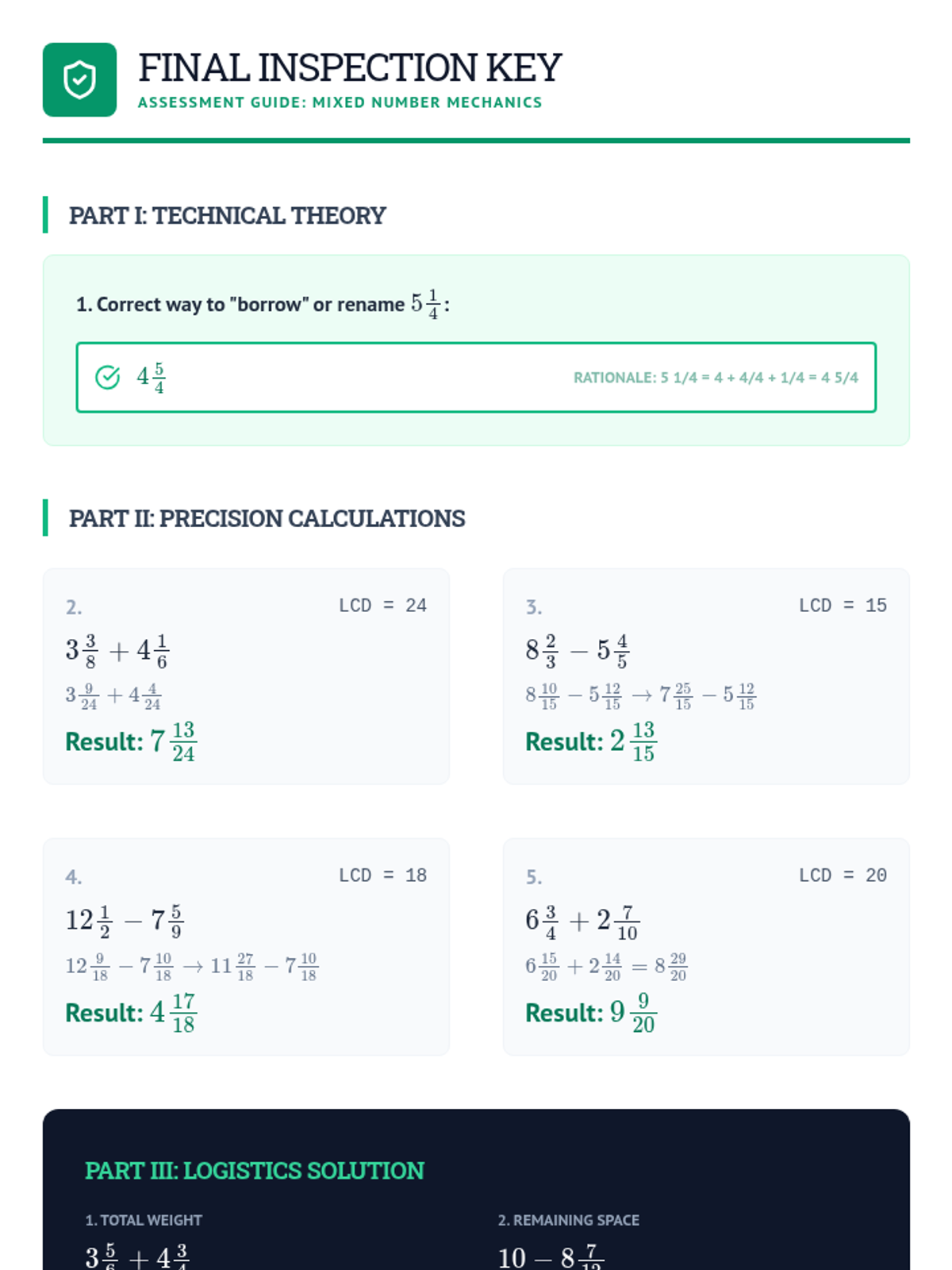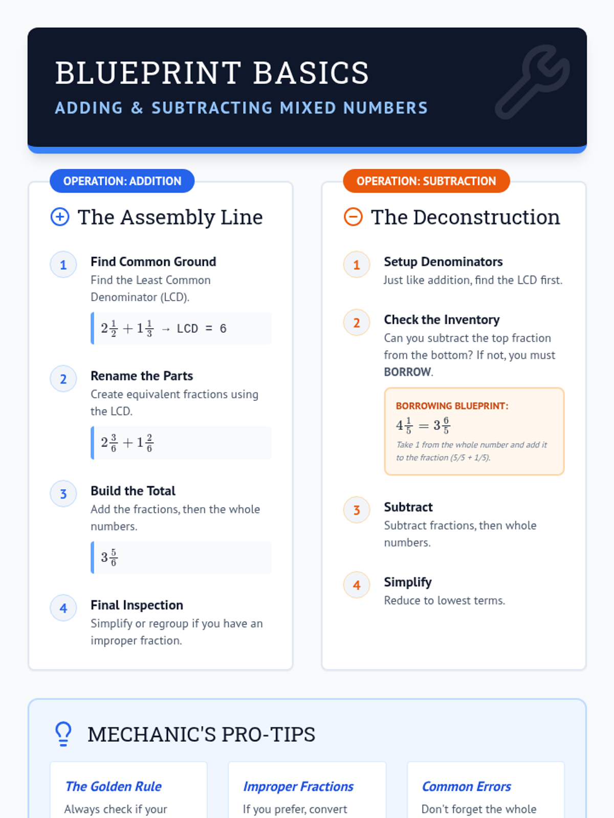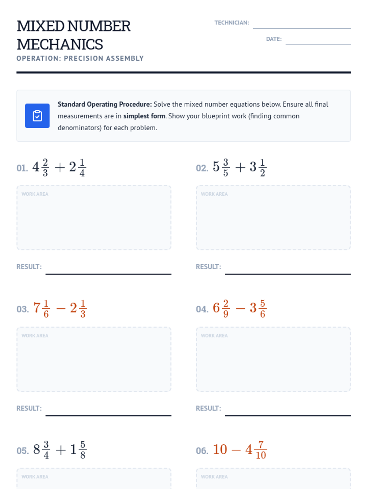 A comprehensive lesson on adding and subtracting mixed numbers with unlike denominators, featuring step-by-step guides and rigorous practice.