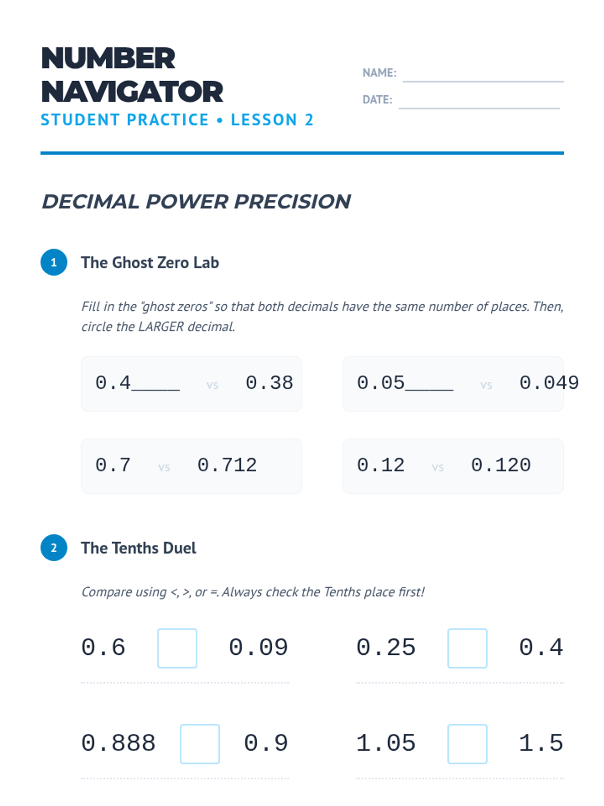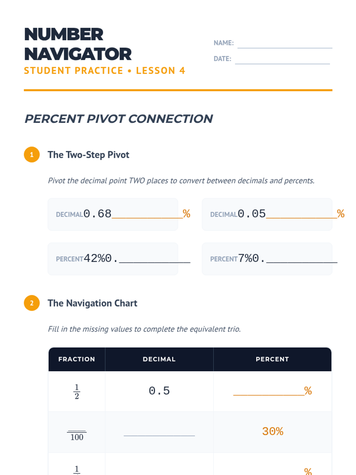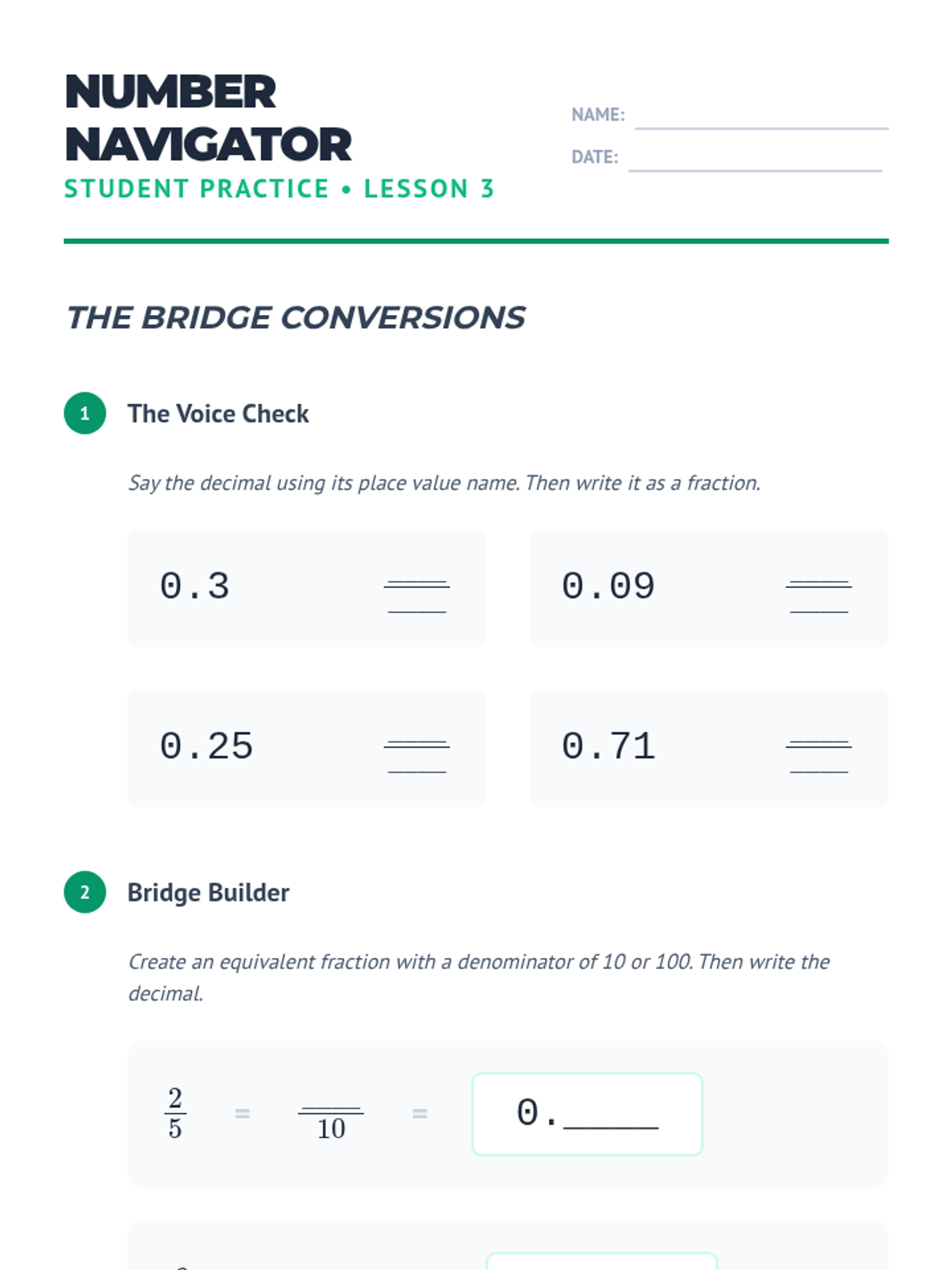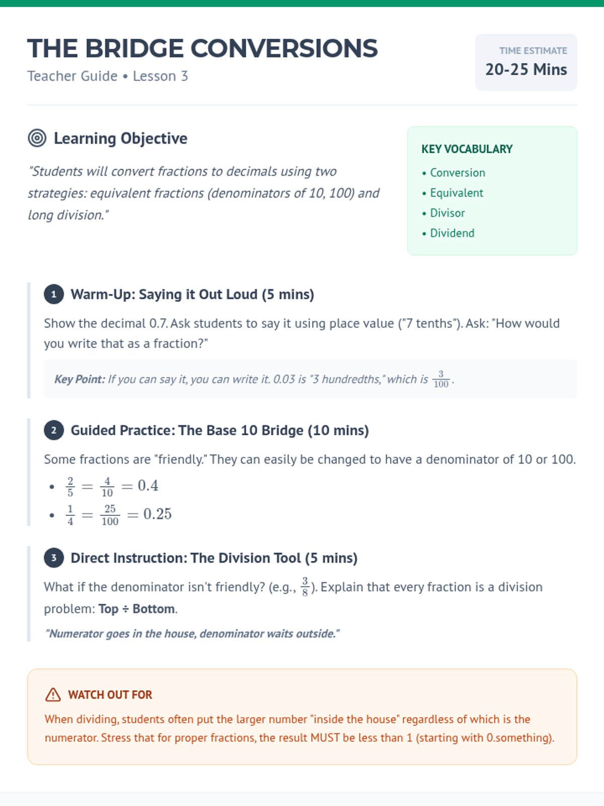 A comprehensive lesson on converting fractions to terminating decimals using long division and equivalent fractions with denominators of 10, 100, or 1,000. Students will act as 'Decimal Architects' to rebuild fractions into their decimal equivalents.