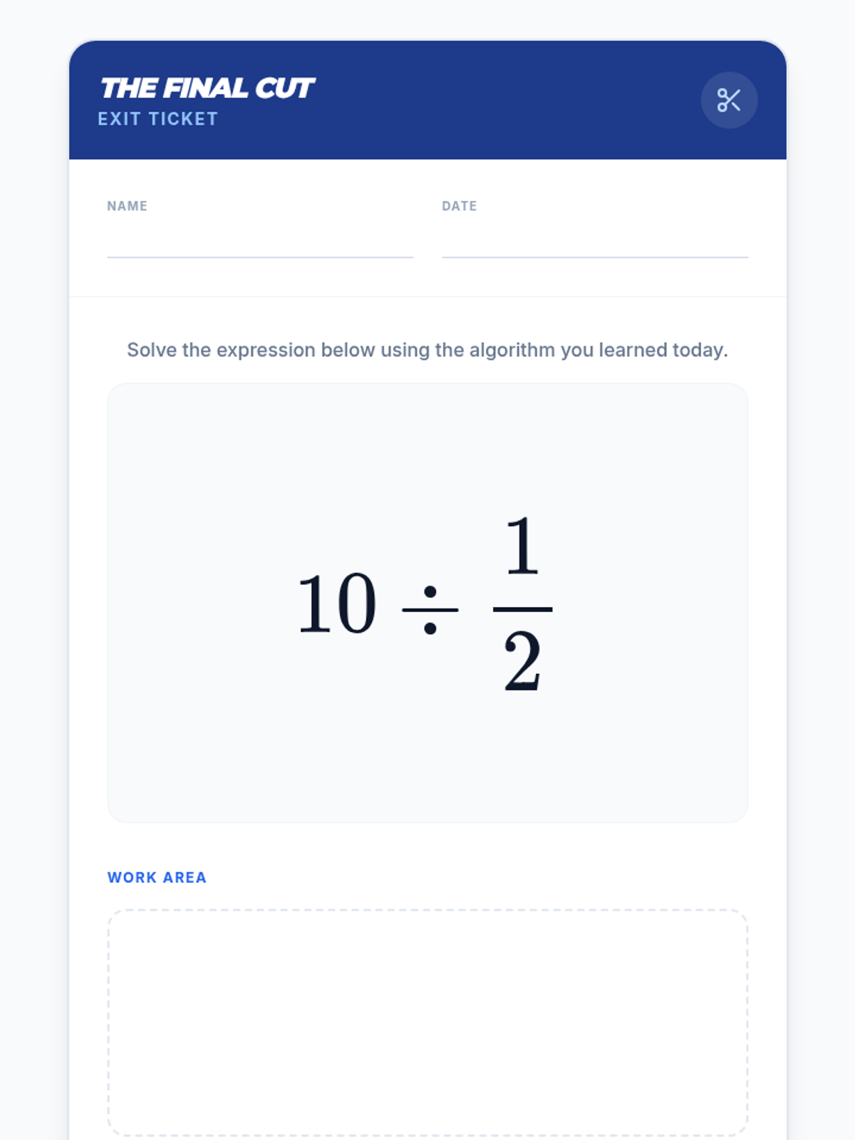 Students develop number sense by estimating whether a quotient will be greater than or less than 1 before solving.