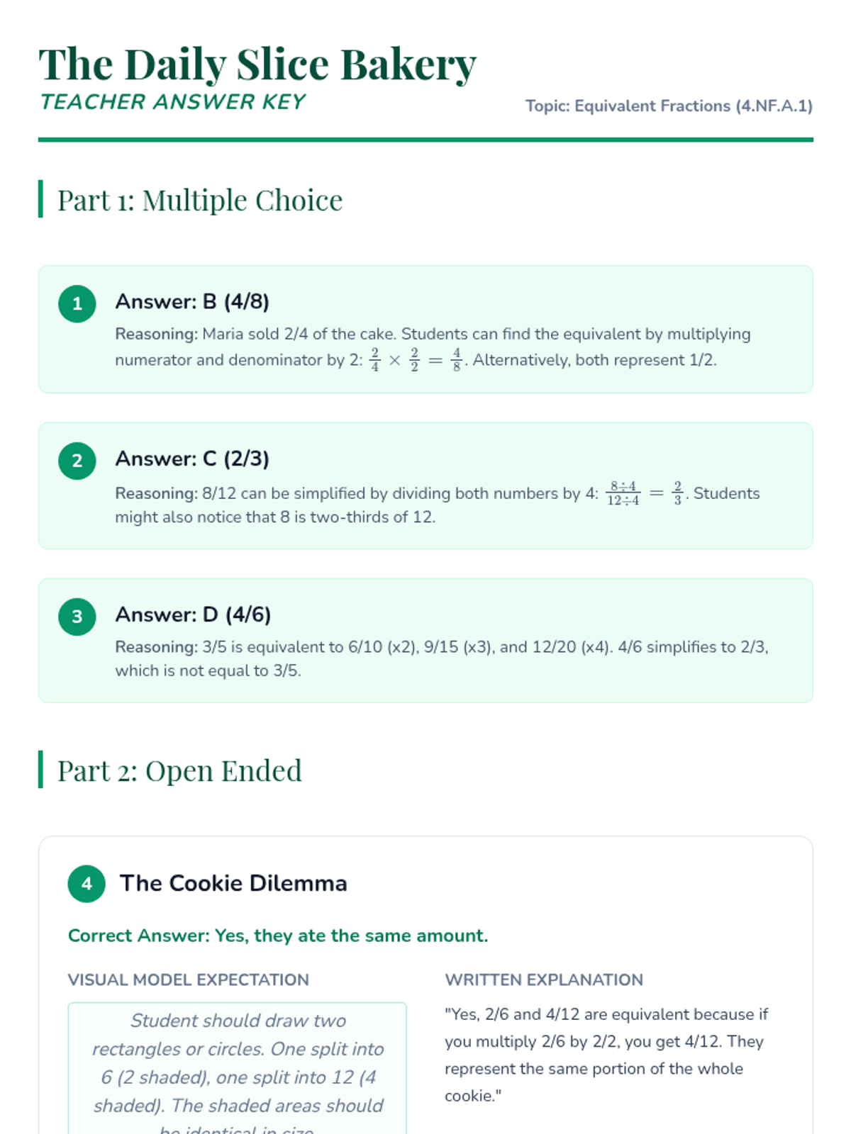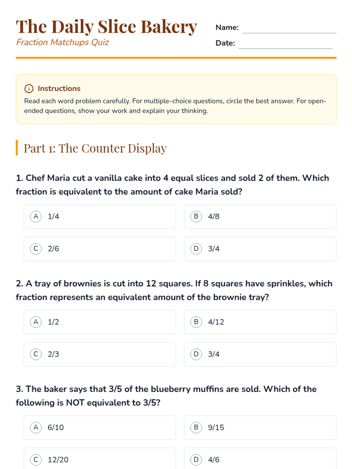 A lesson focused on identifying and creating equivalent fractions through real-world word problems and visual models. Students will apply their knowledge in a bakery-themed quiz.