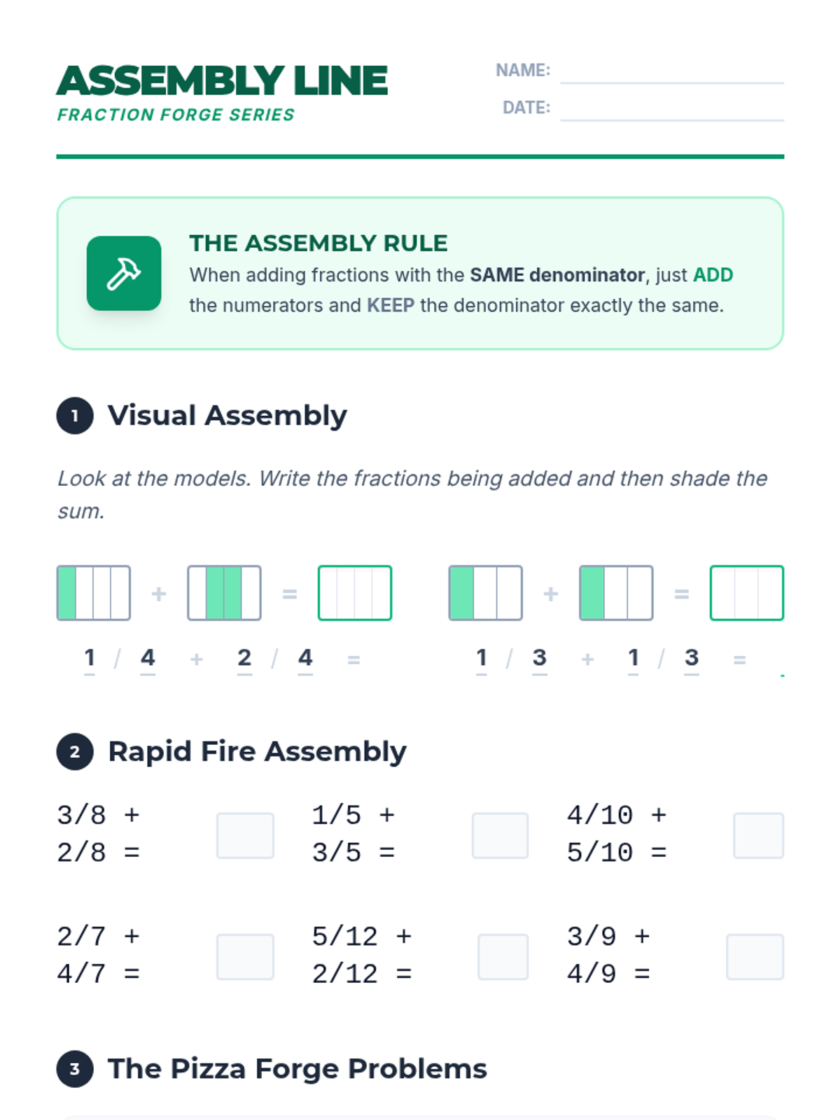 A lesson focused on identifying and representing fractions using visual models like area models (shapes) and linear models (number lines) with denominators 2, 3, 4, 6, and 8.