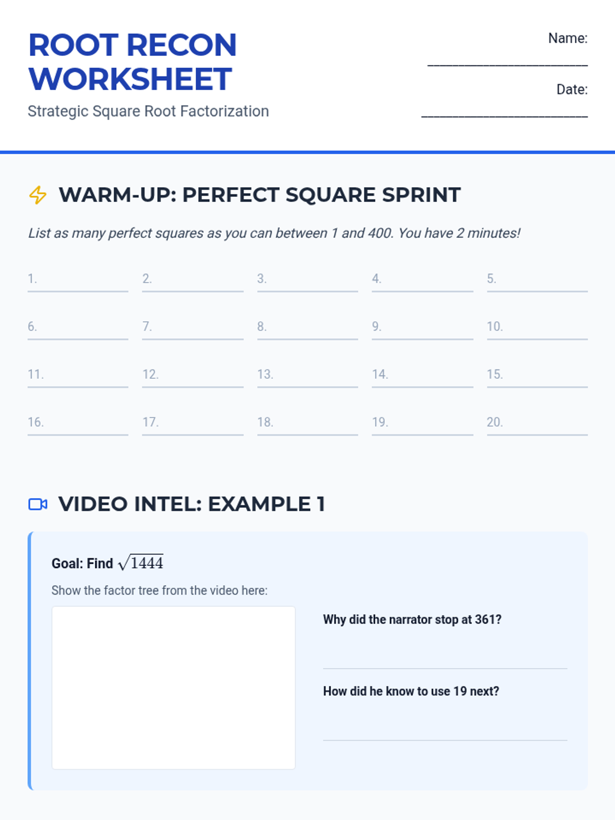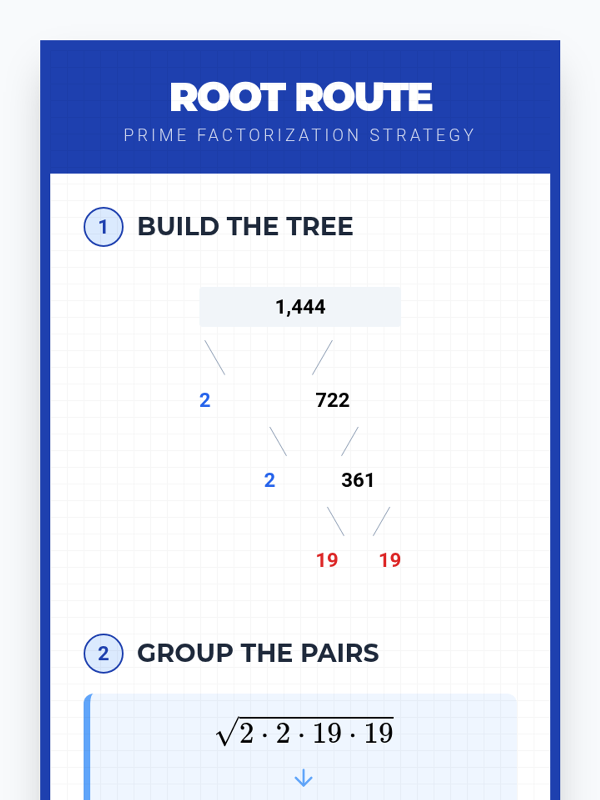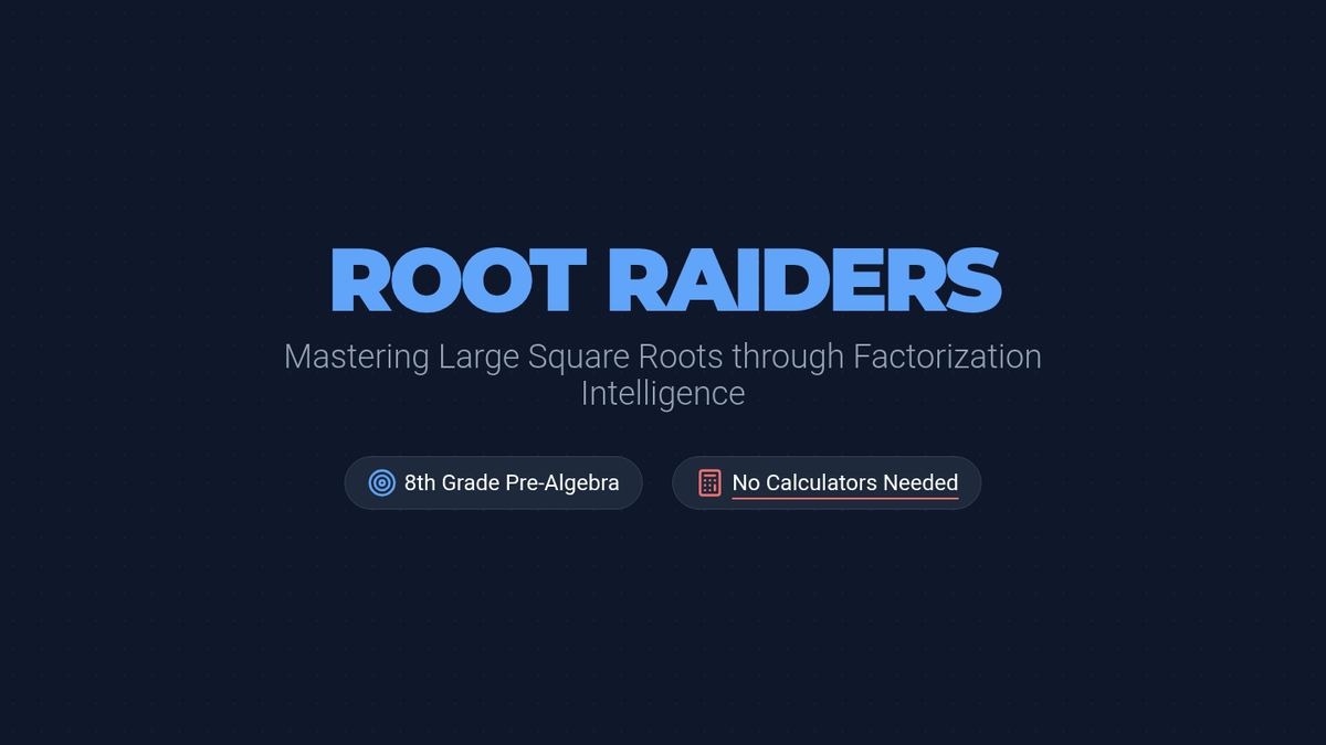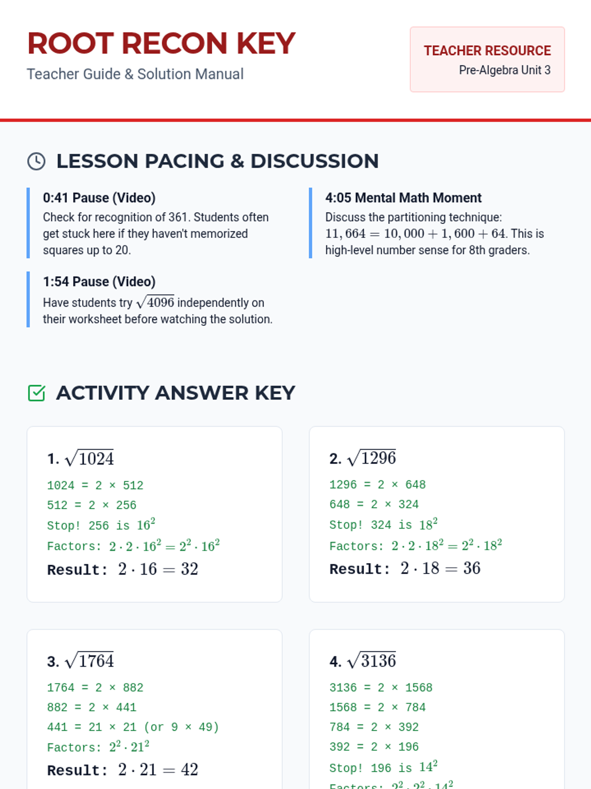 Students will master the technique of finding square roots for large perfect squares using prime factorization and factor trees, building mental math efficiency and understanding of radical properties.