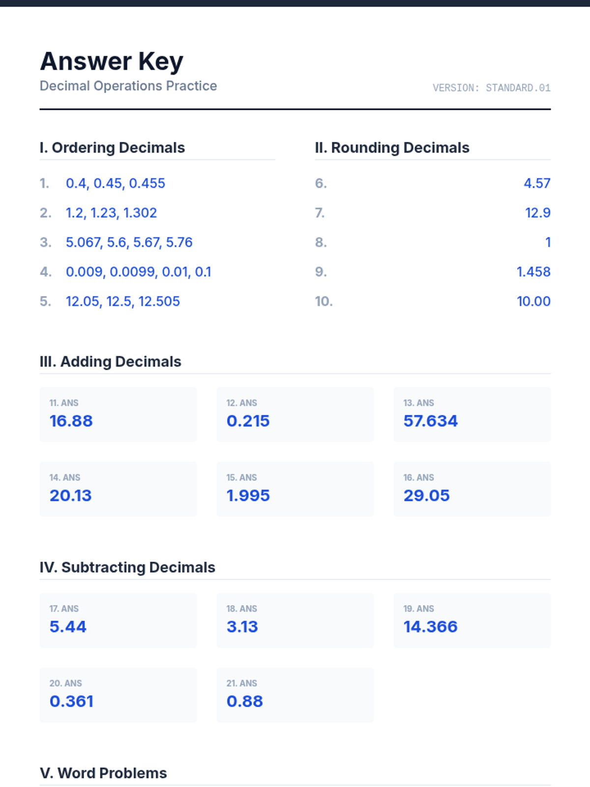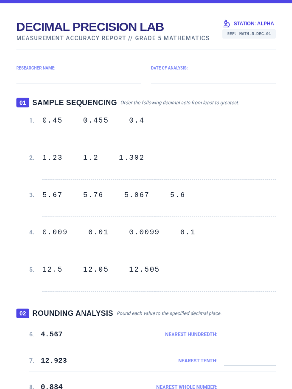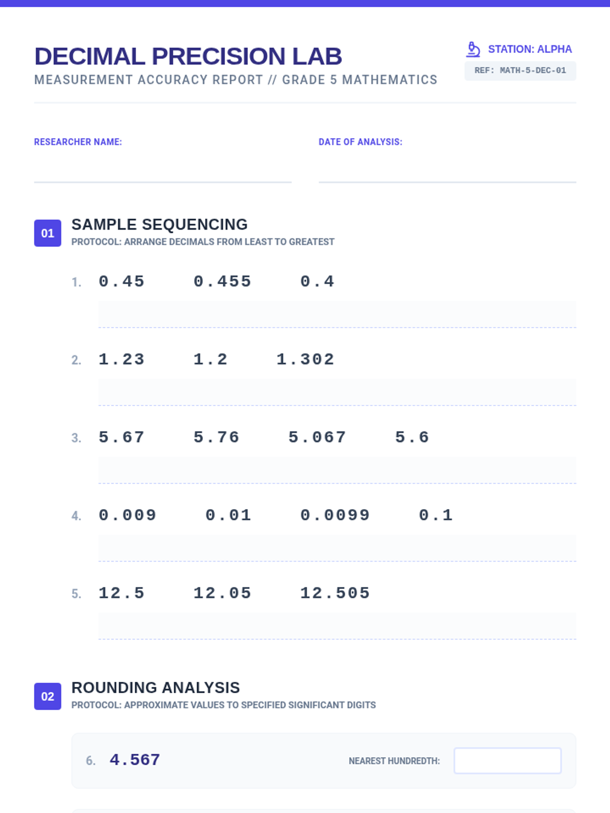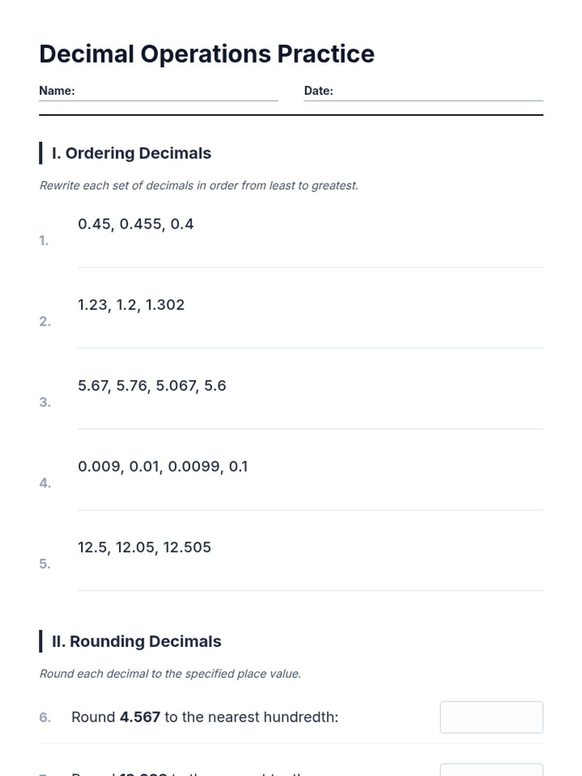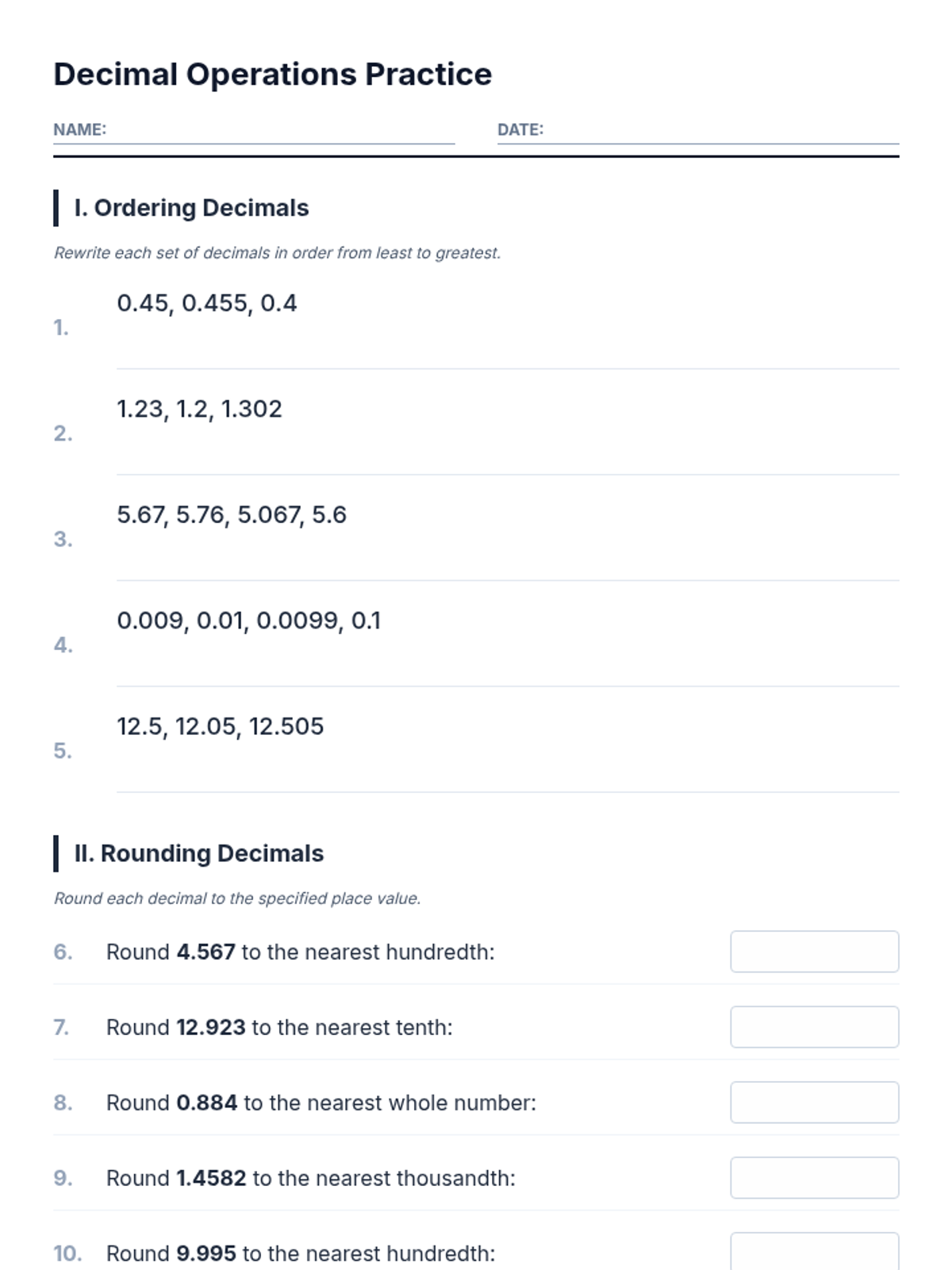 A comprehensive practice set for fifth-grade students to master decimal operations, including ordering, rounding, addition, and subtraction.