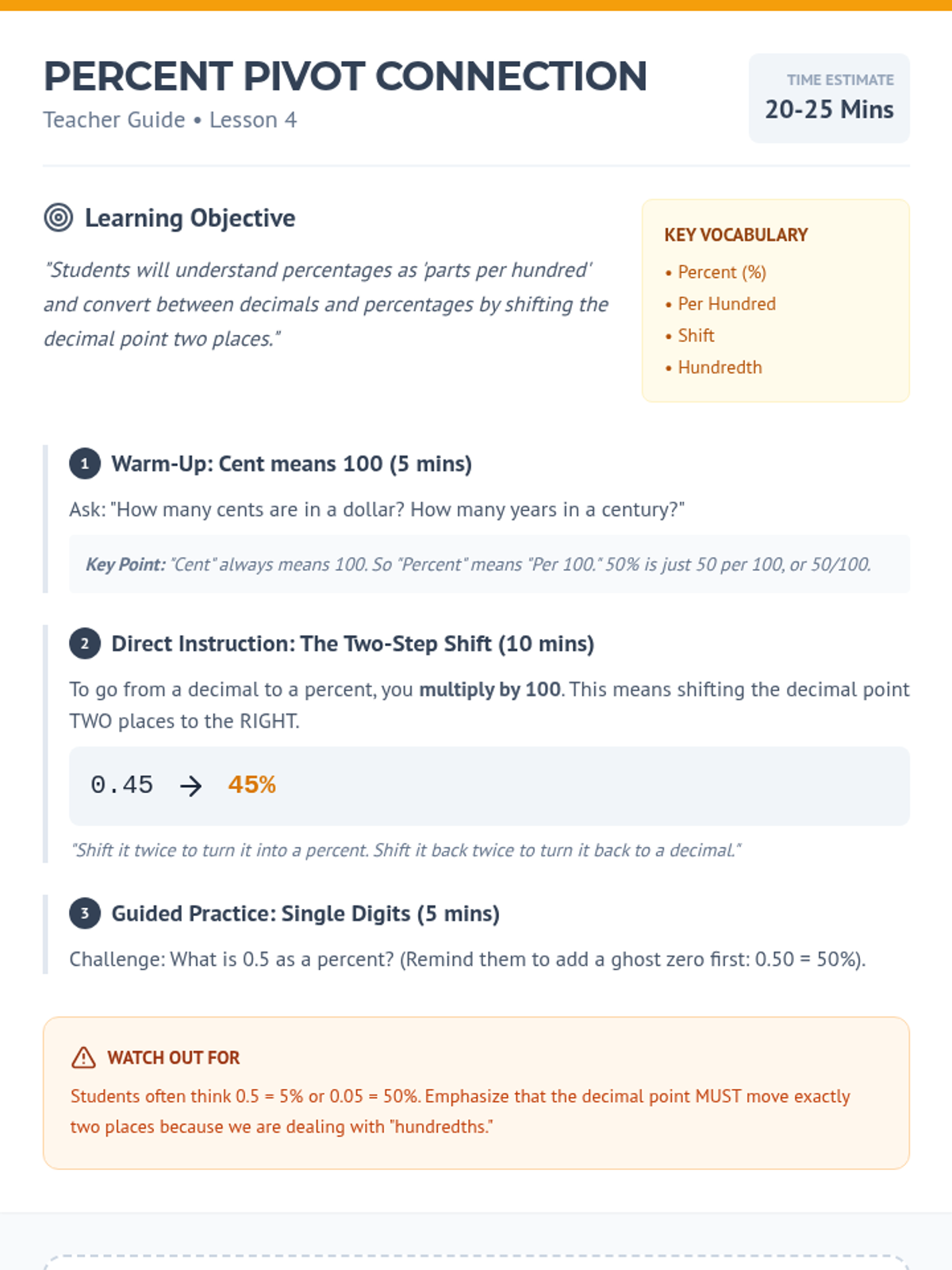 Introduces the concept of percentages as parts per hundred and provides strategies for converting between decimals, fractions, and percentages by shifting decimal points and using equivalent fractions.
