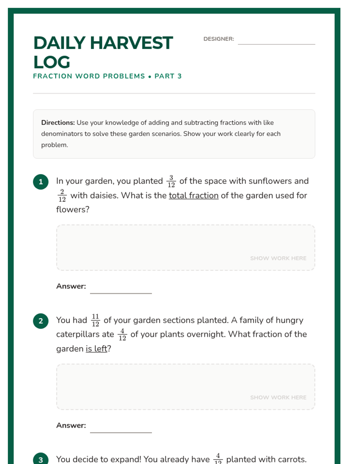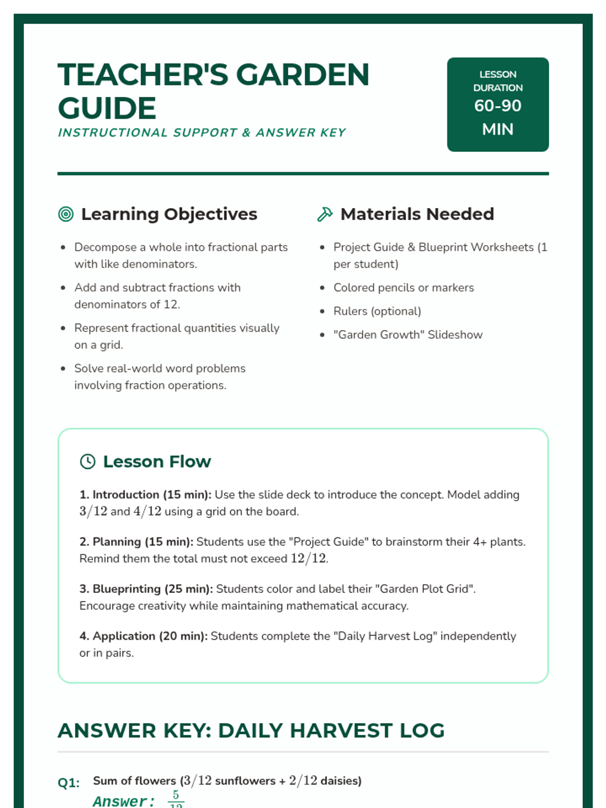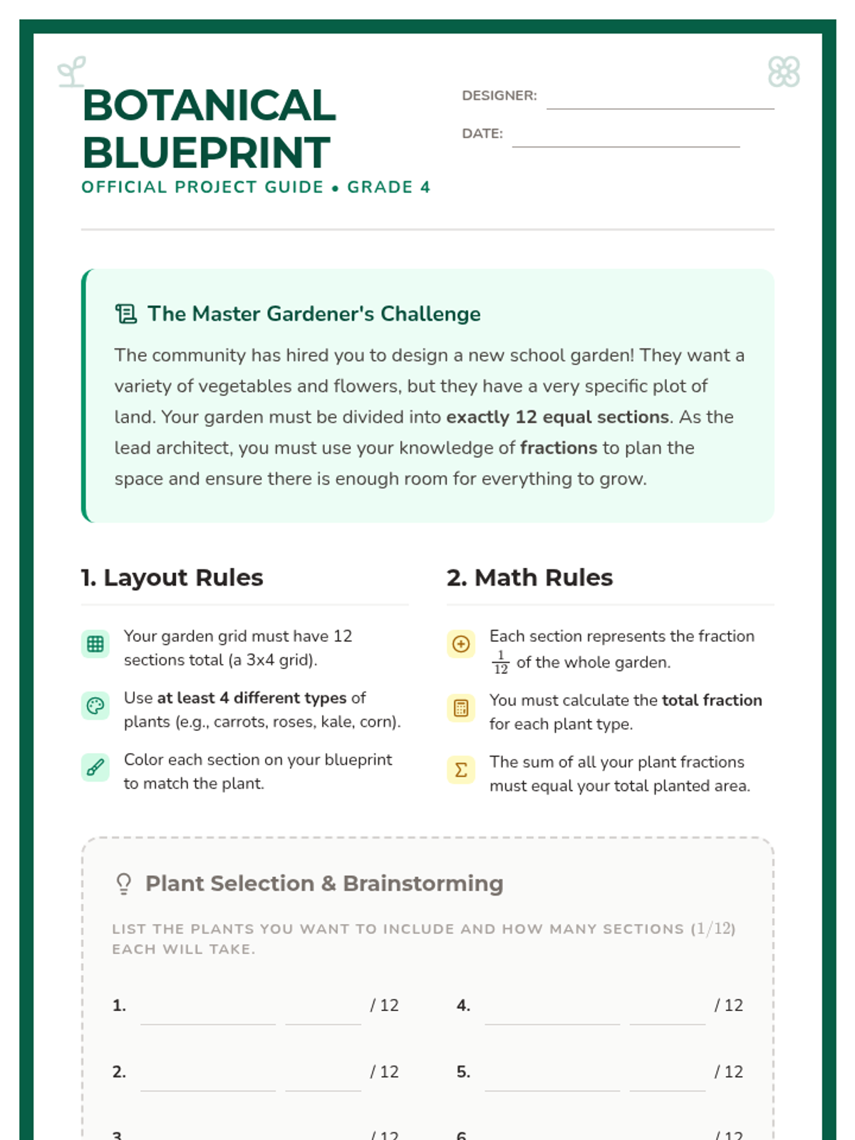 A project-based lesson where students design a garden divided into fractional sections, practicing addition and subtraction of fractions with like denominators.