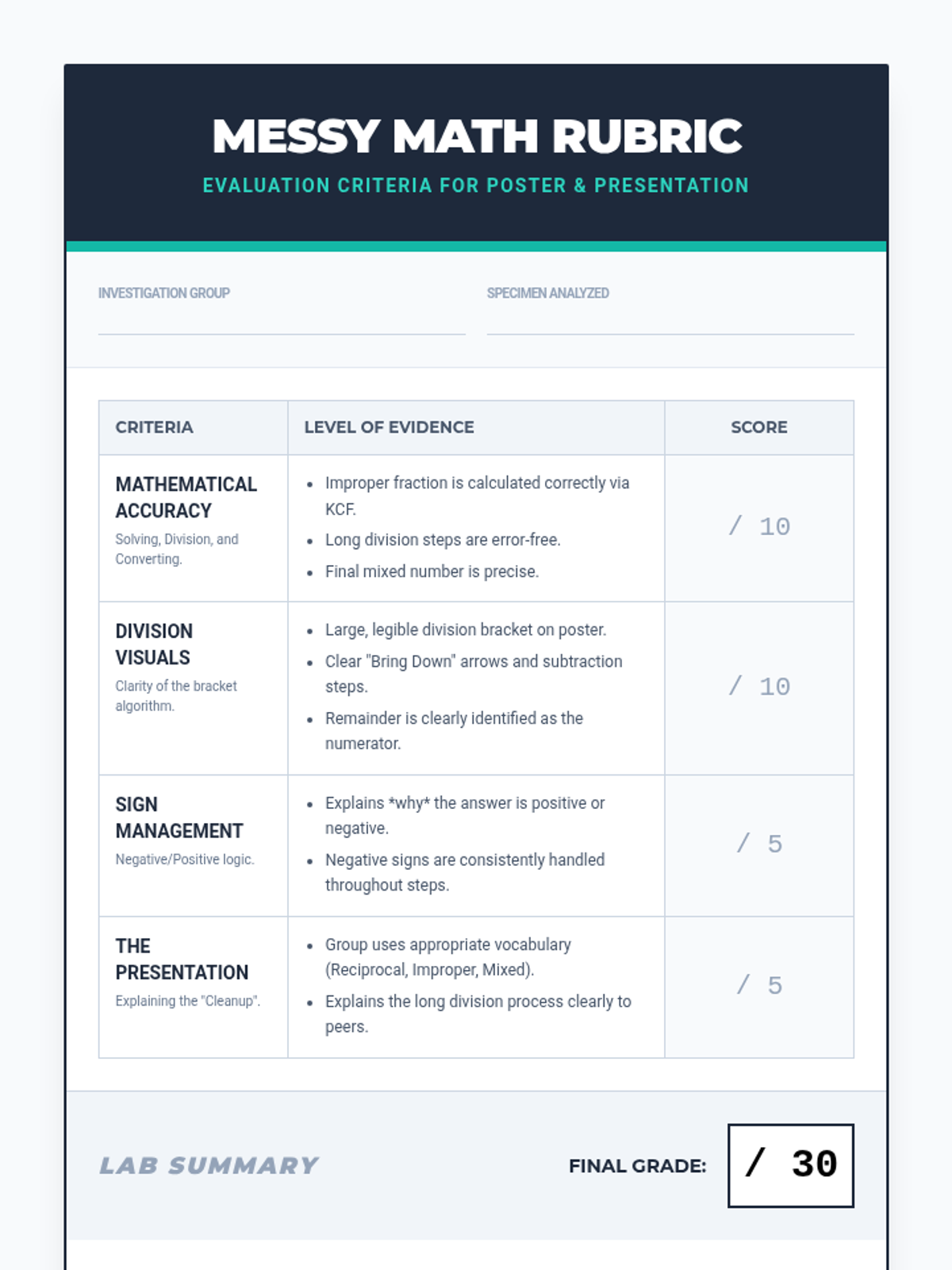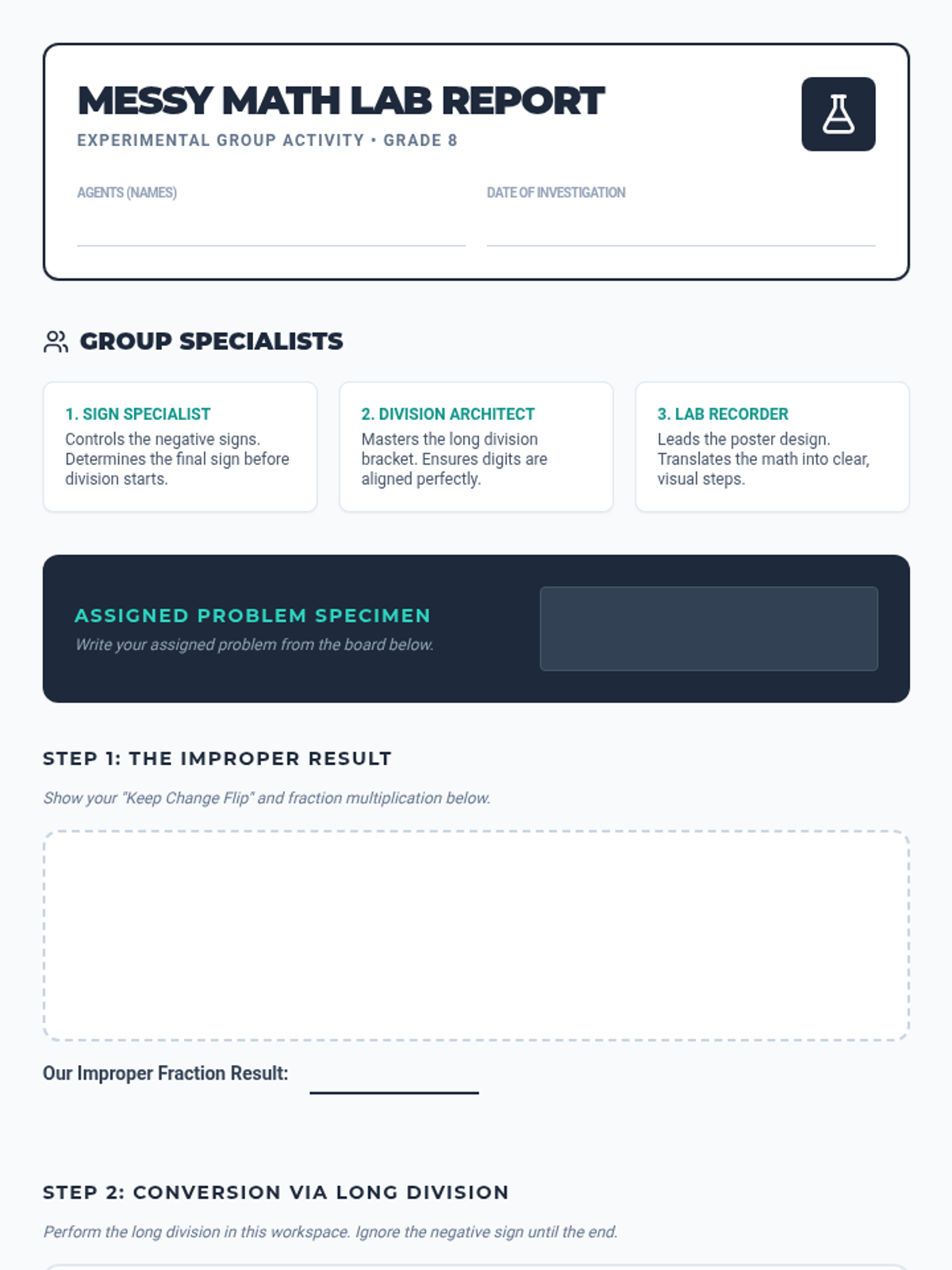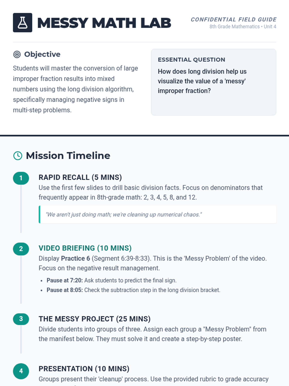 A high-energy math lesson where students tackle 'messy' division problems, converting large improper fractions into mixed numbers using long division. Includes a video analysis of complex negative integer division and a collaborative poster project.