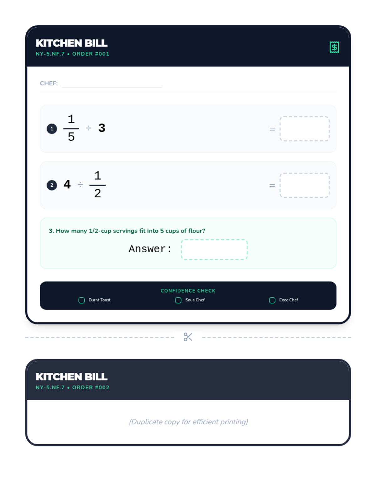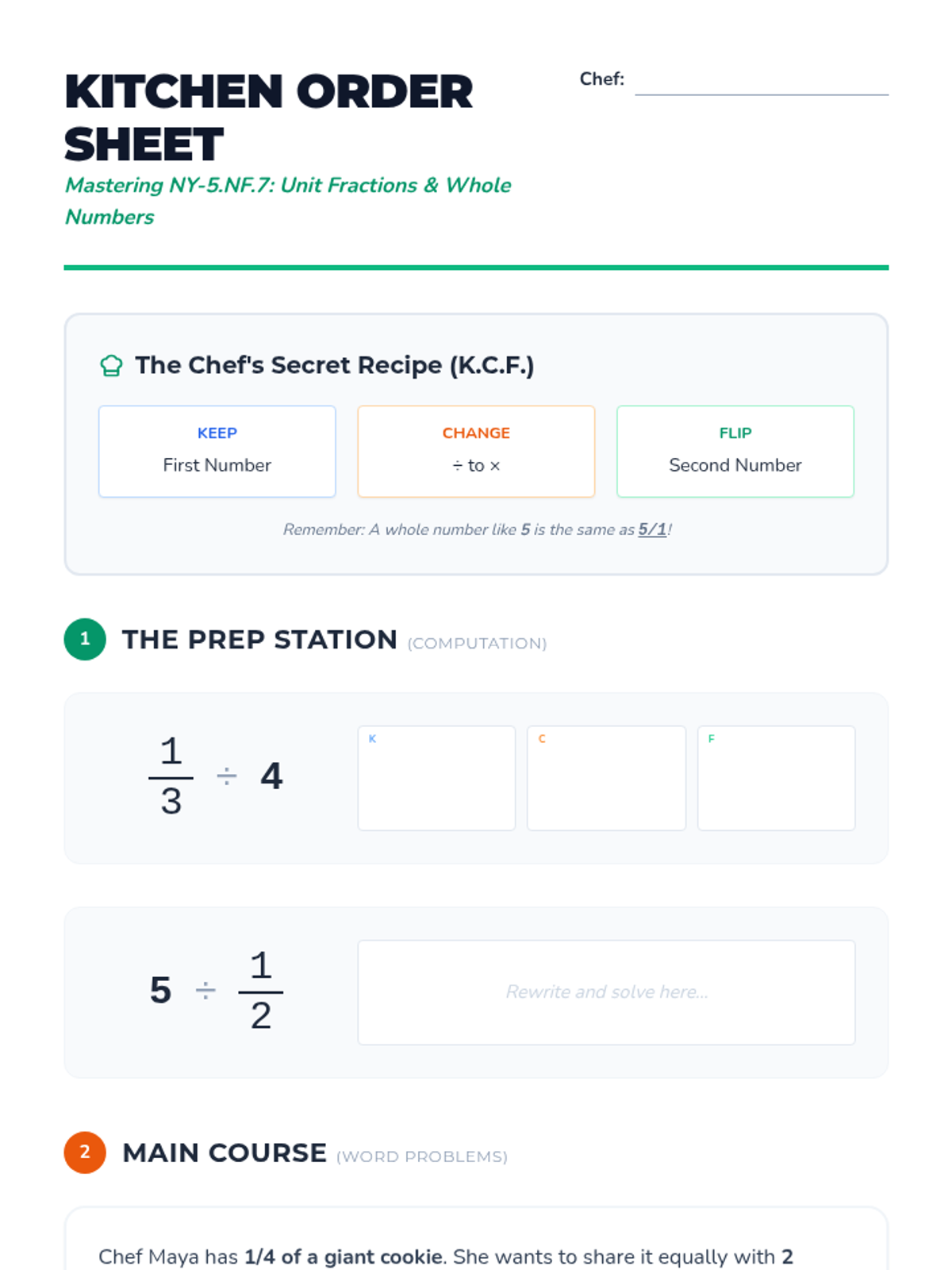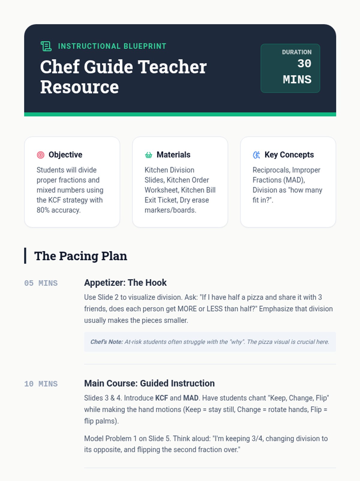 A high-engagement, 30-minute small group lesson focusing on dividing fractions and mixed numbers using a culinary theme. Includes visual modeling and the Keep-Change-Flip strategy to support at-risk 5th graders.