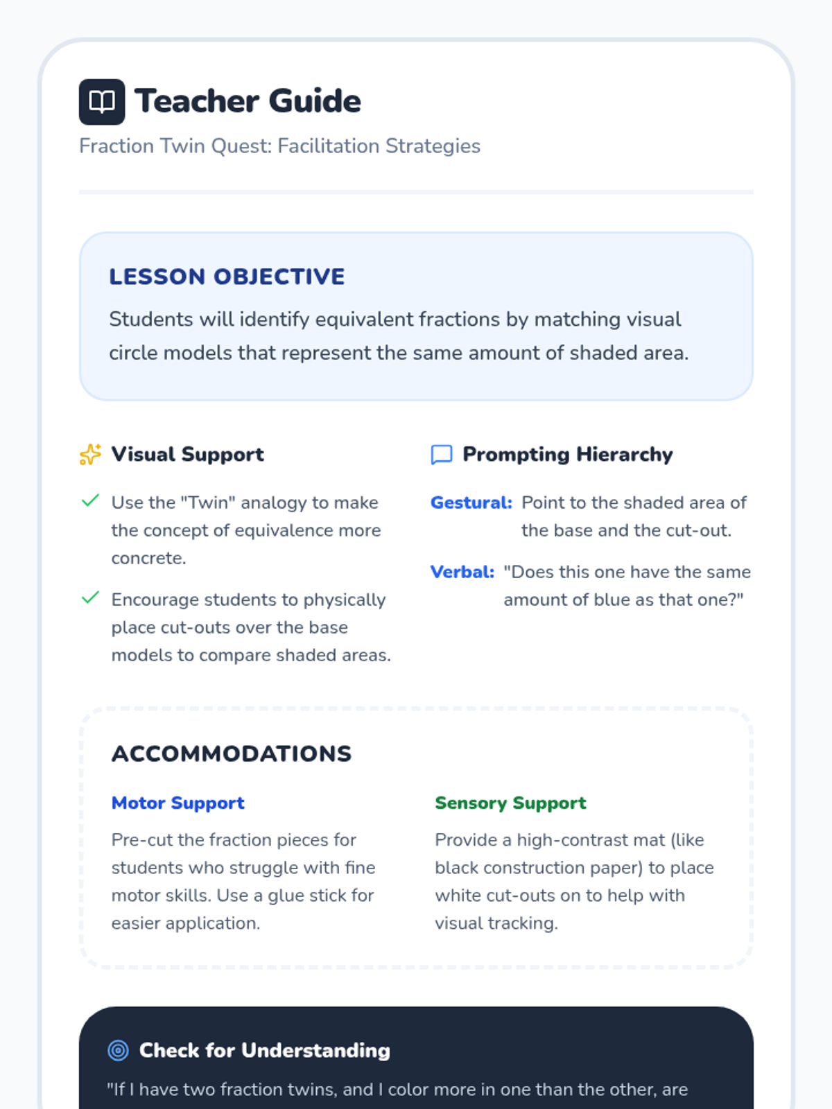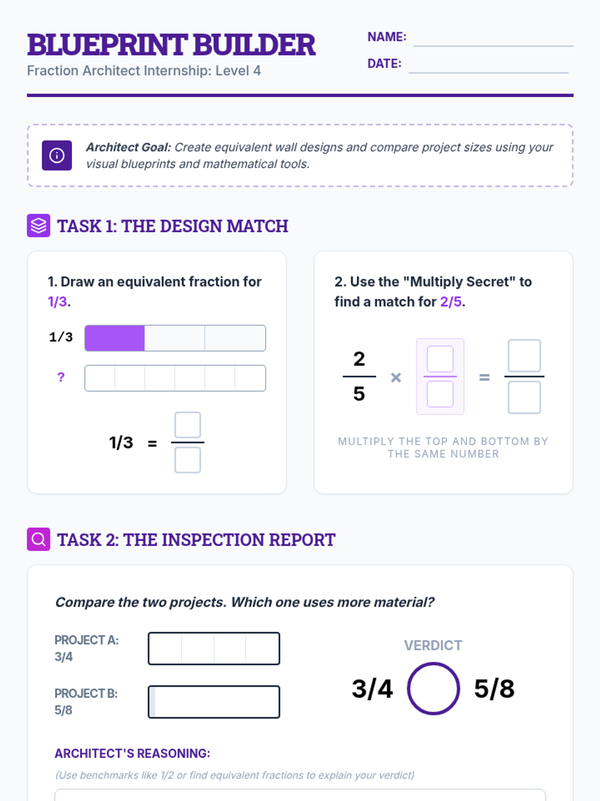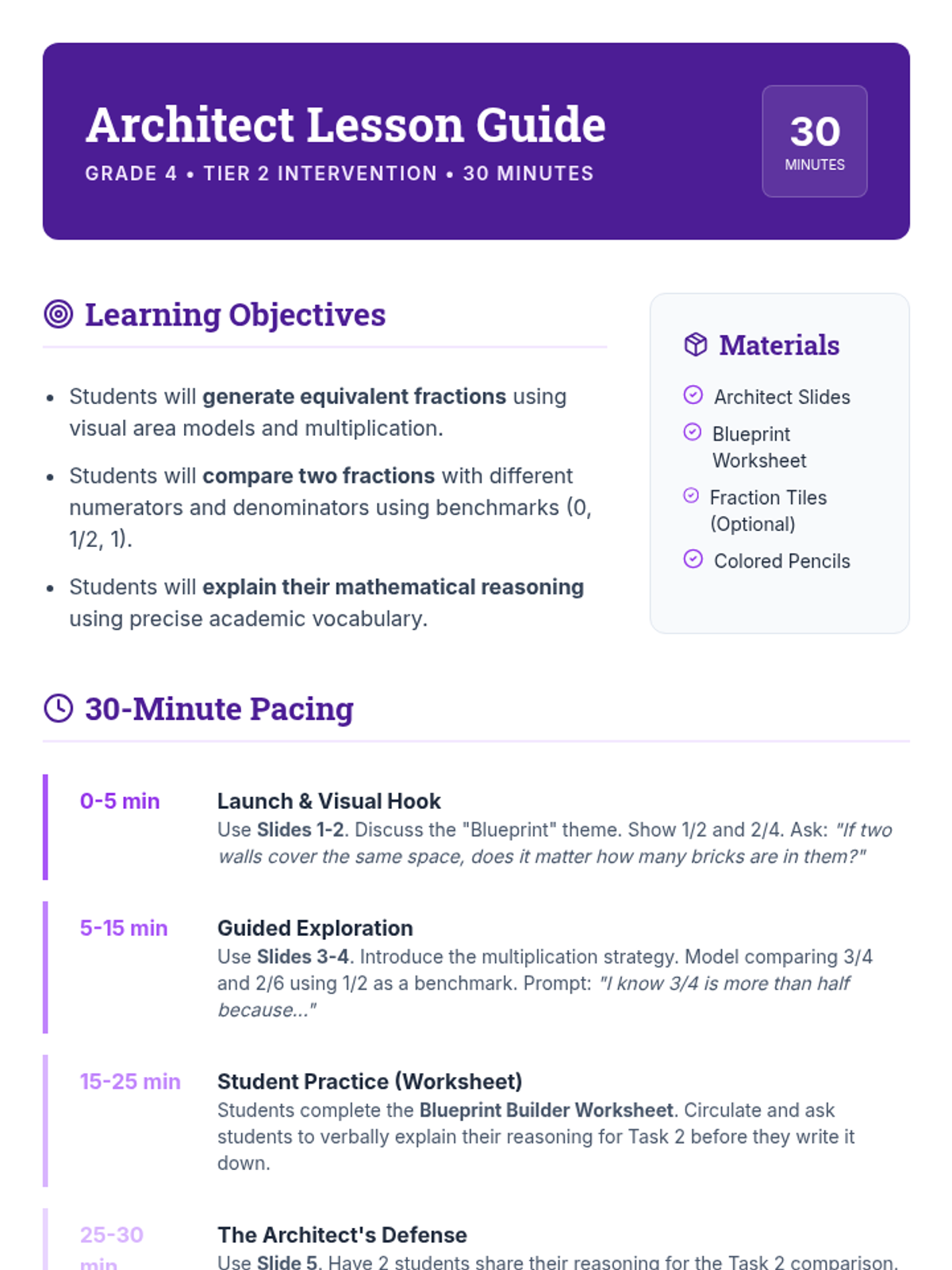 A targeted 30-minute intervention lesson helping Grade 4 students master equivalent fractions and comparison through visual blueprint modeling and mathematical reasoning.
