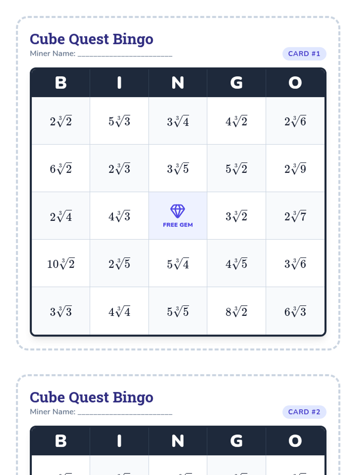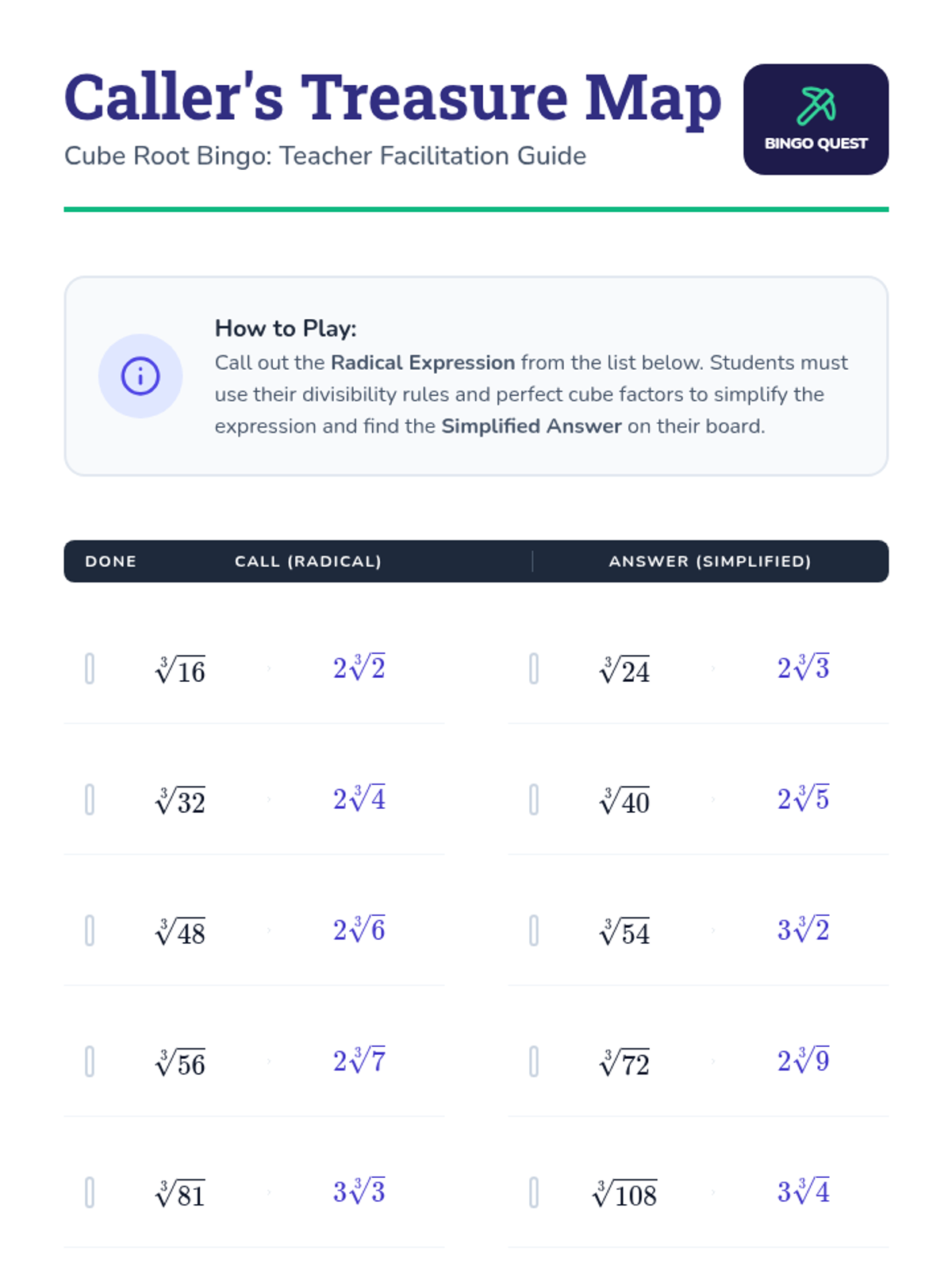 A small-group intervention lesson focused on simplifying cube roots using divisibility rules and perfect cube factors. Students will use visual modeling and a Bingo game to reinforce their understanding.