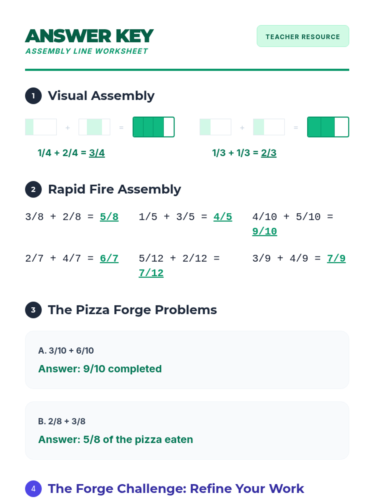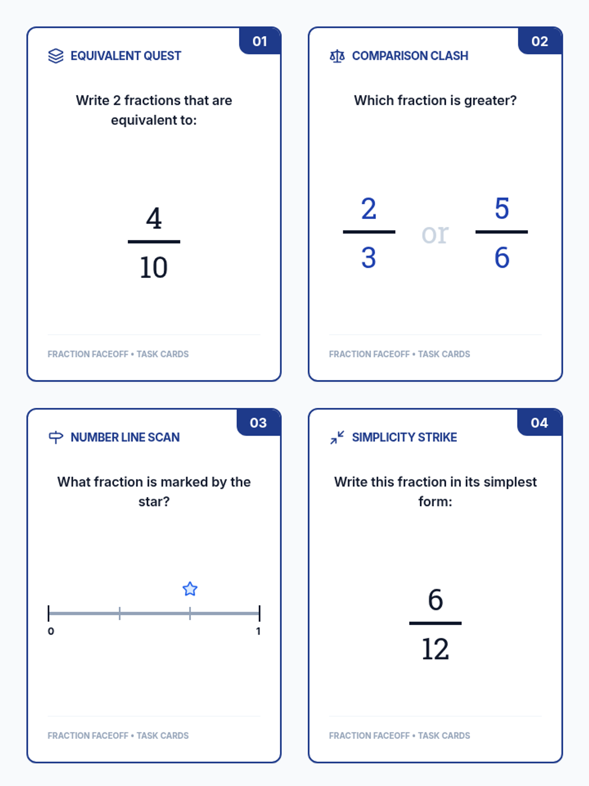 A comprehensive practice set for 4th-grade fraction standards, focusing on number lines, comparison, and equivalence through various classroom formats.