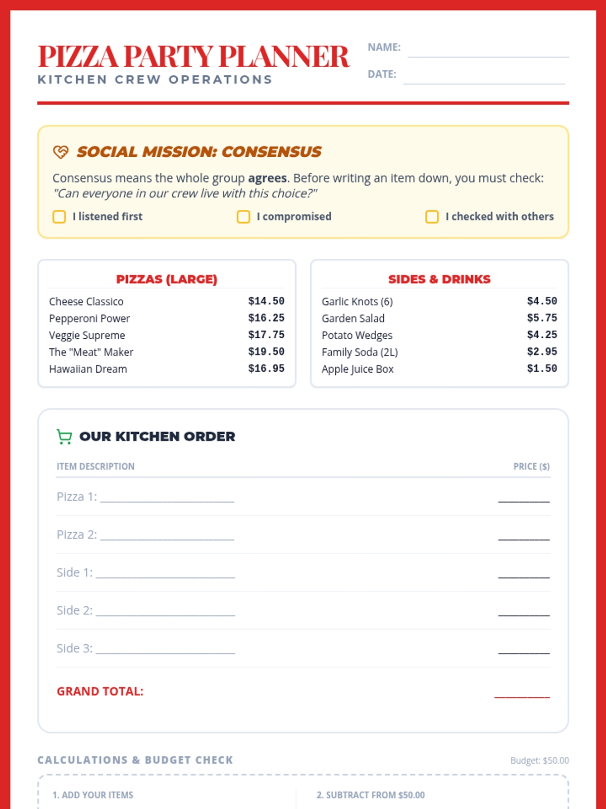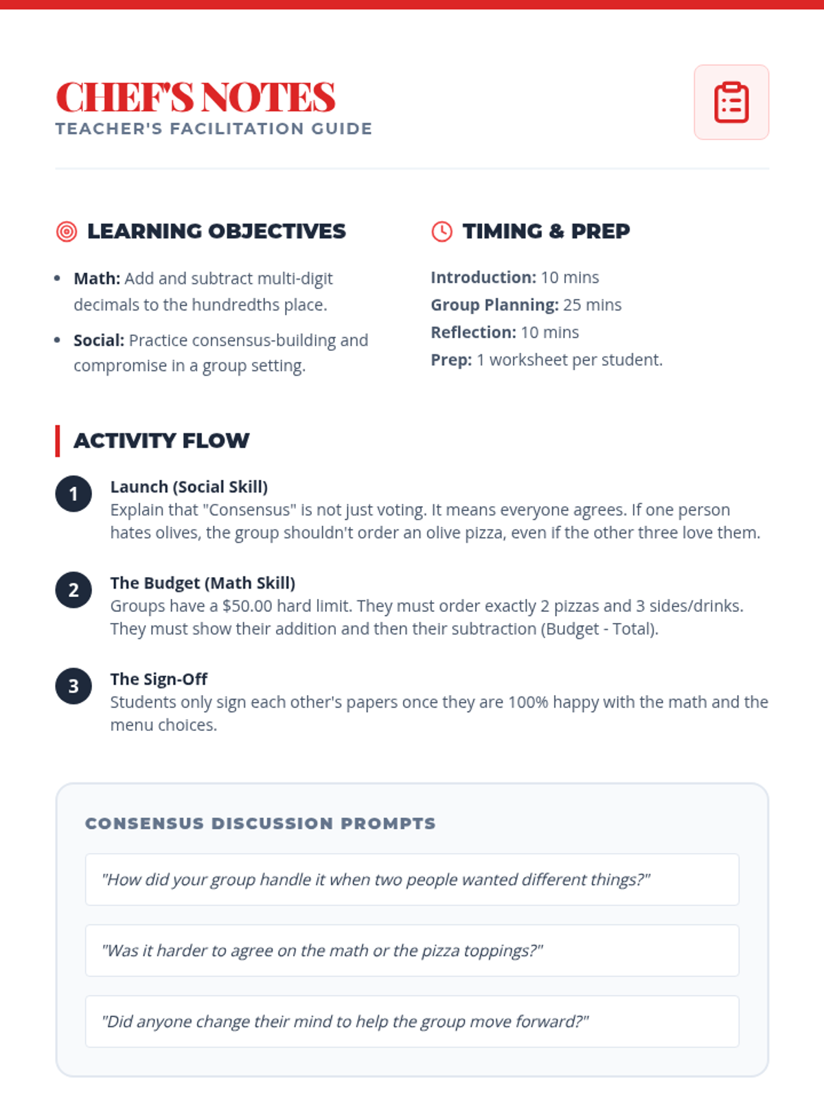 In this collaborative lesson, students work in 'Kitchen Crews' to plan a pizza party budget. They must practice consensus-building and compromise (social skills) while performing multi-step addition and subtraction with decimals (math).