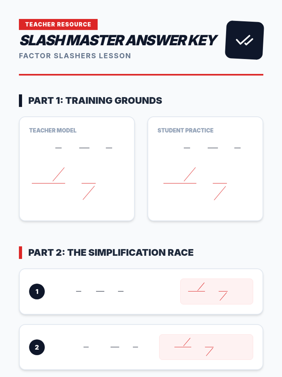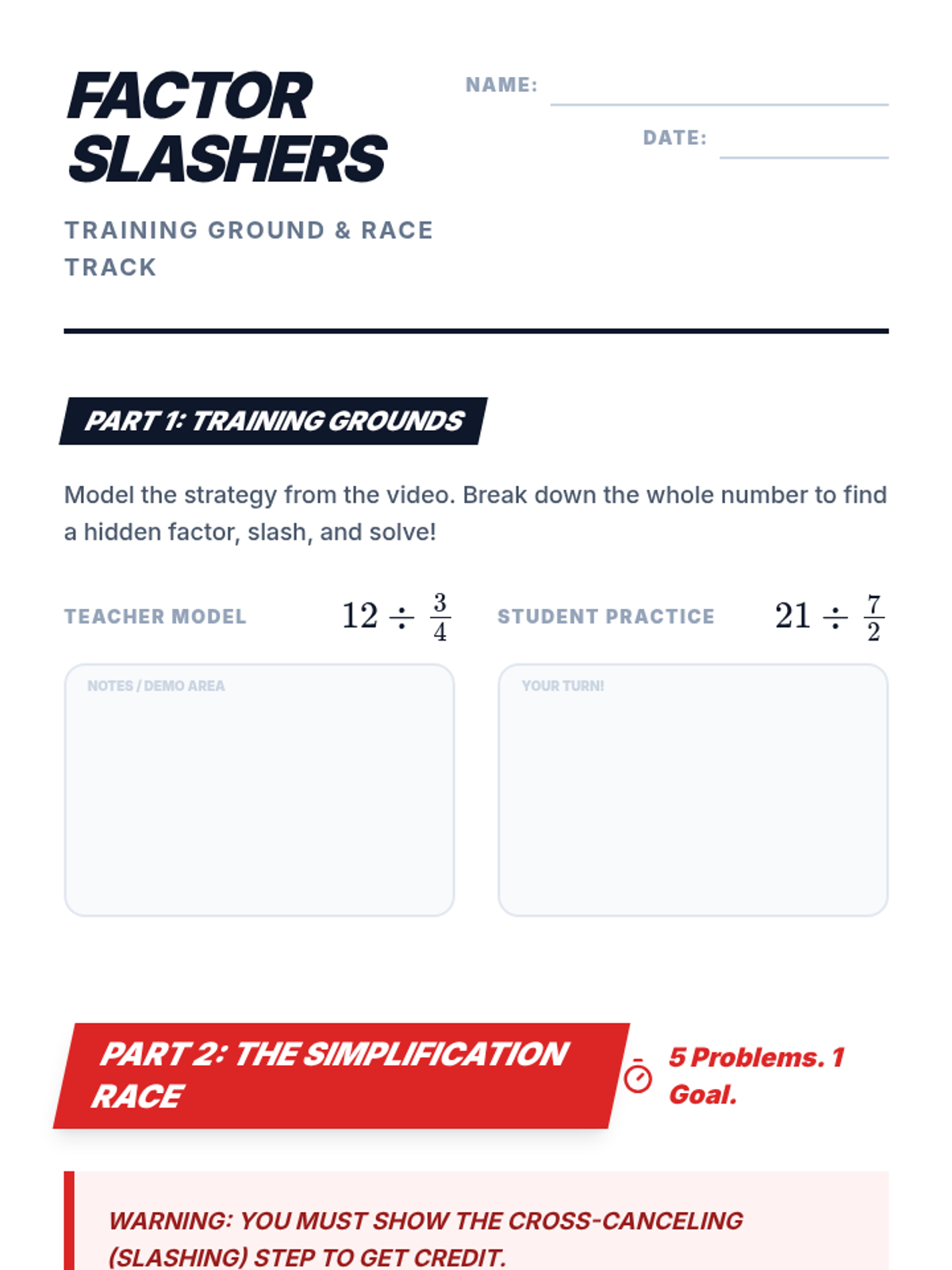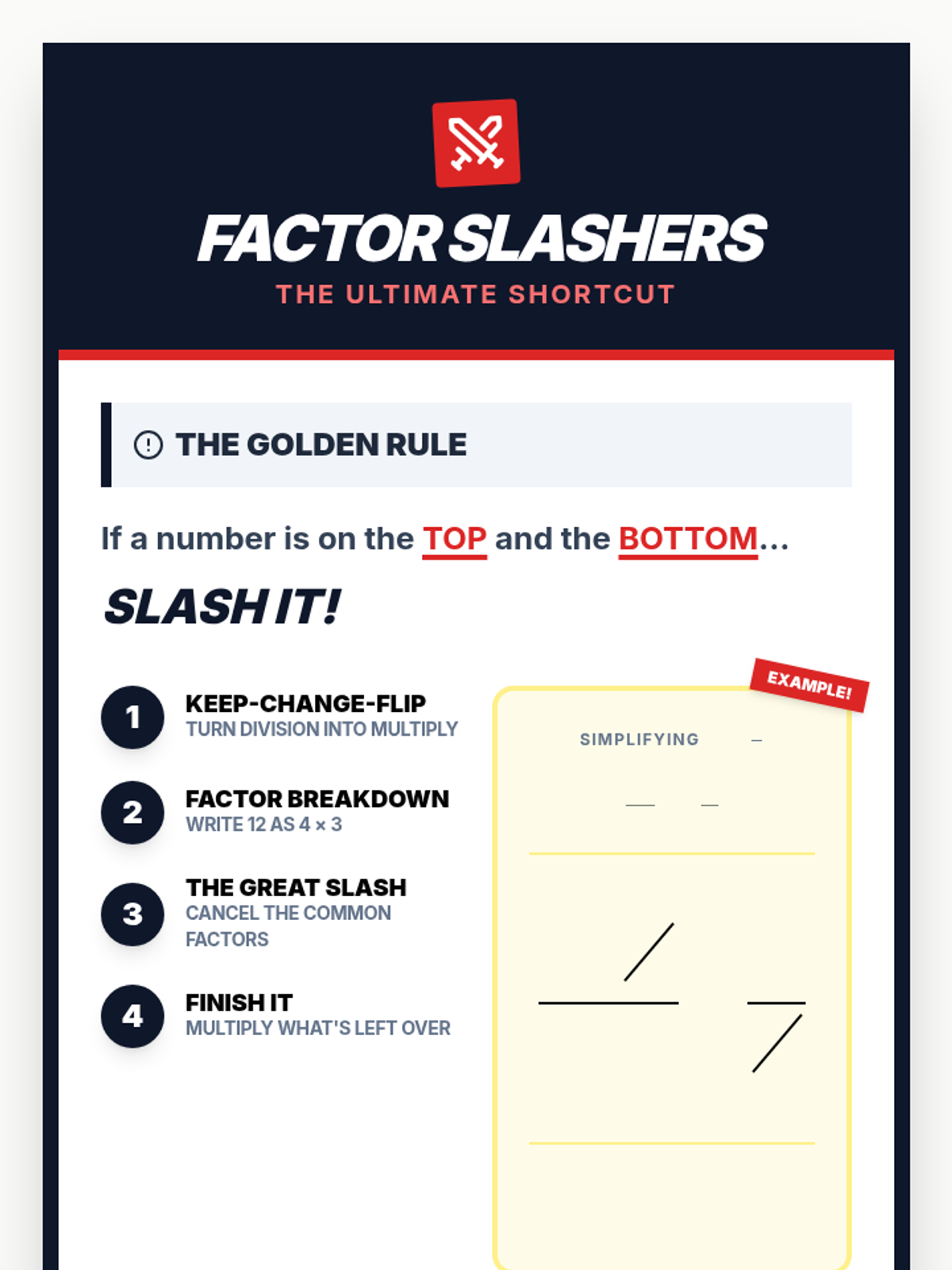 Students will learn to simplify expressions by cross-canceling factors before multiplying, using a 'Keep-Change-Flip' strategy for fraction division. The lesson features a 'Simplification Race' to build fluency in identifying common factors.