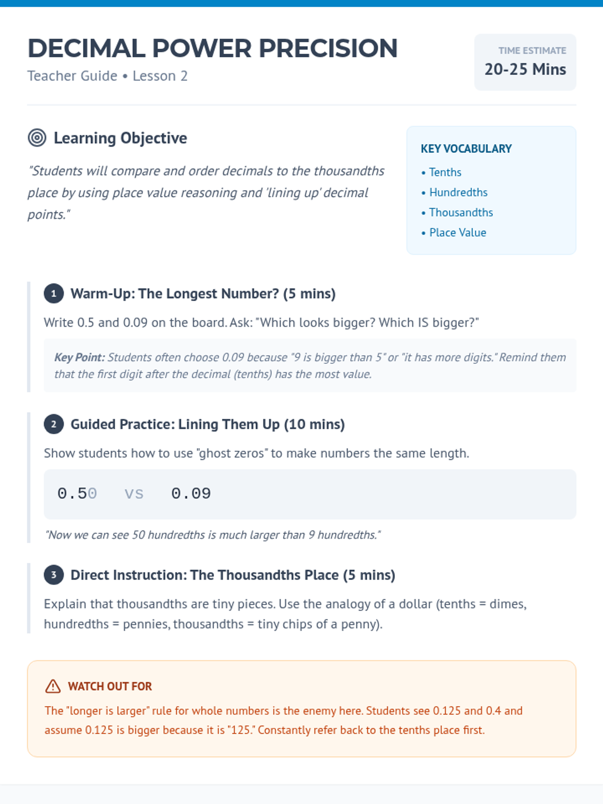 Teaches students to compare and order decimals by focusing on place value rather than string length, using visual grids and 'lining up the decimals' strategies.
