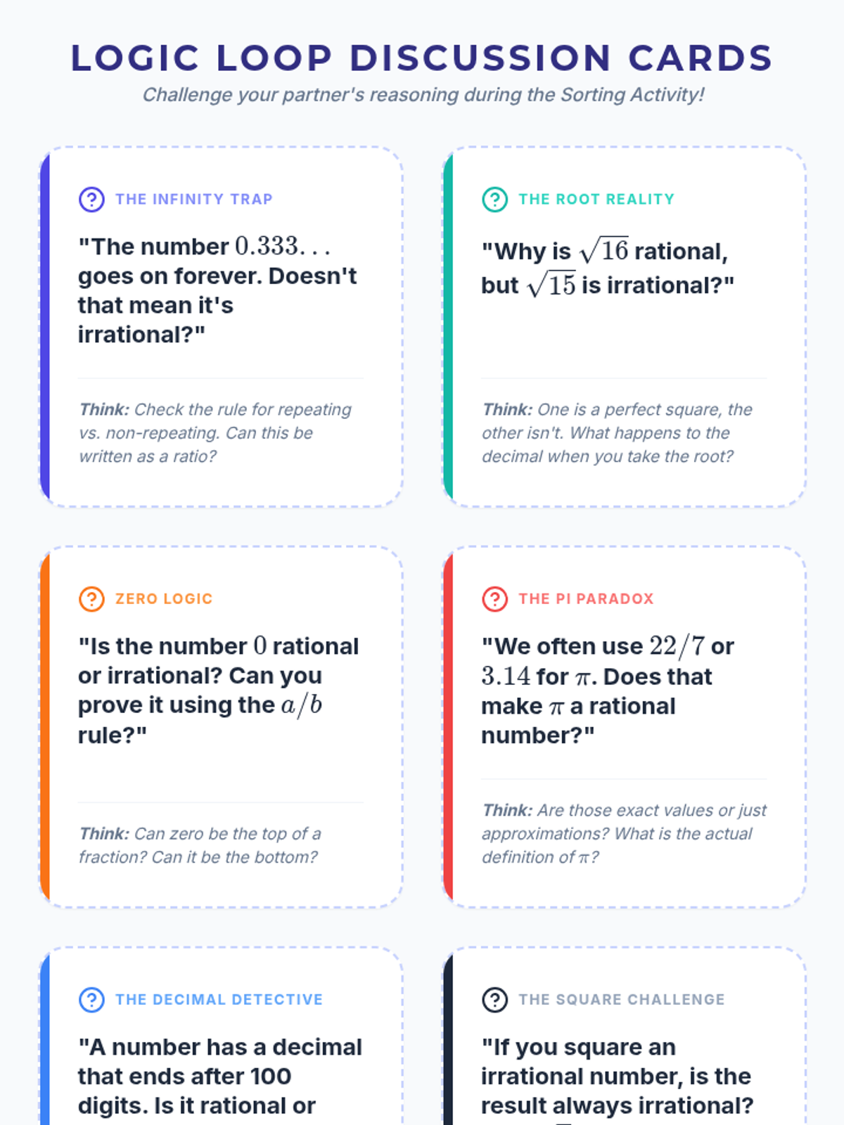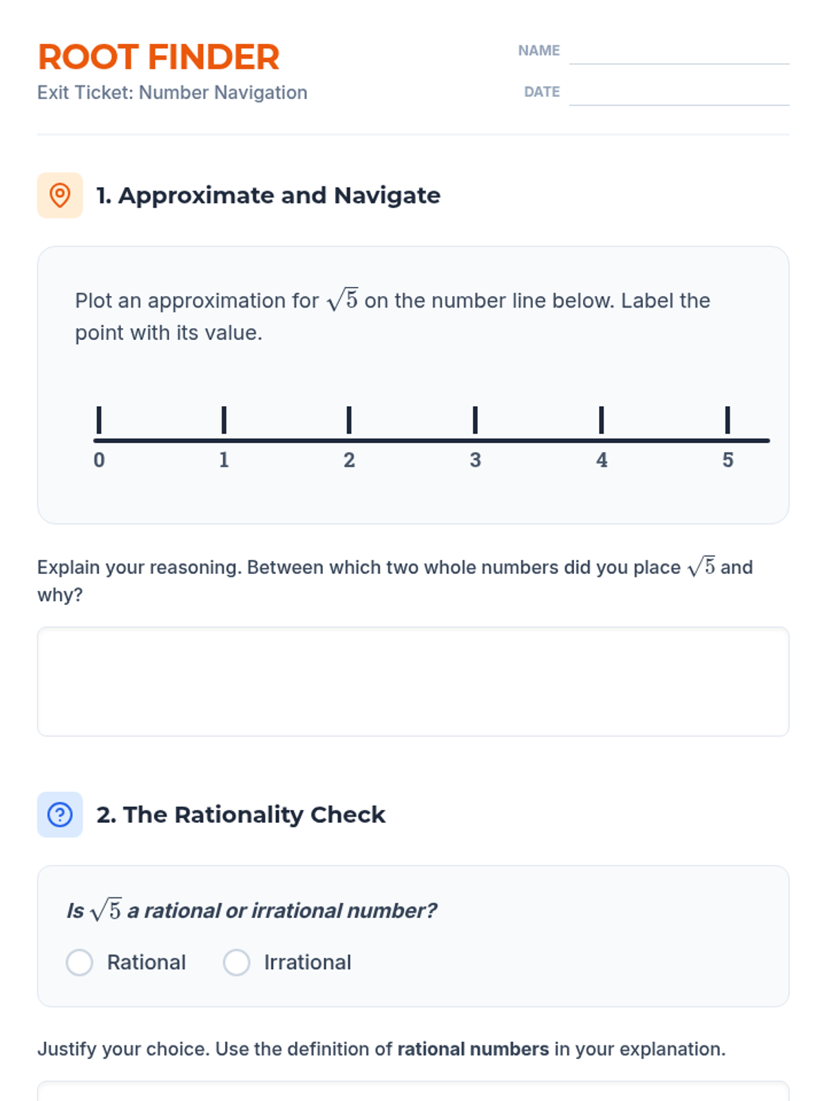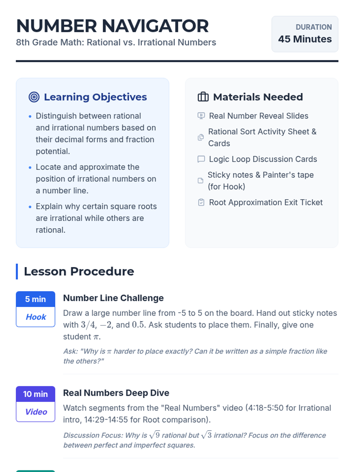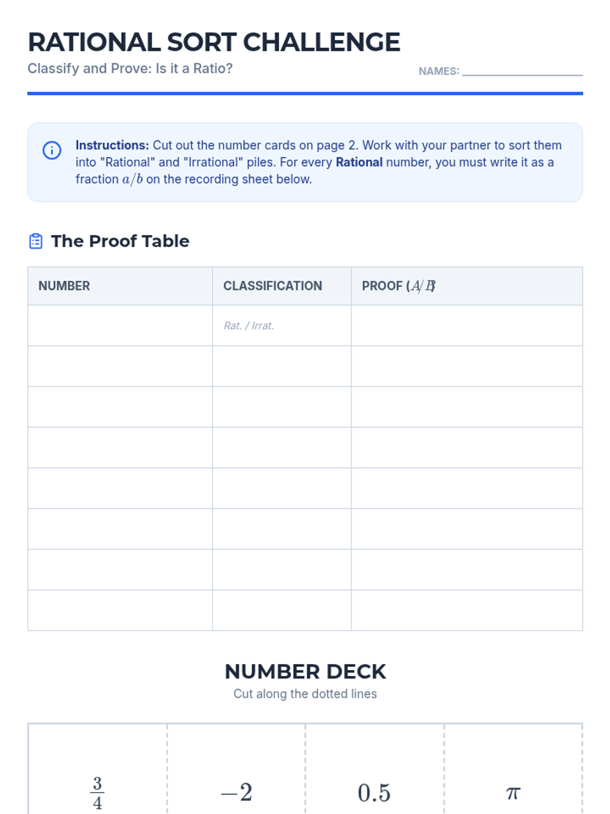 An 8th-grade lesson focusing on distinguishing between rational and irrational numbers, featuring a hands-on sorting activity and number line placement.