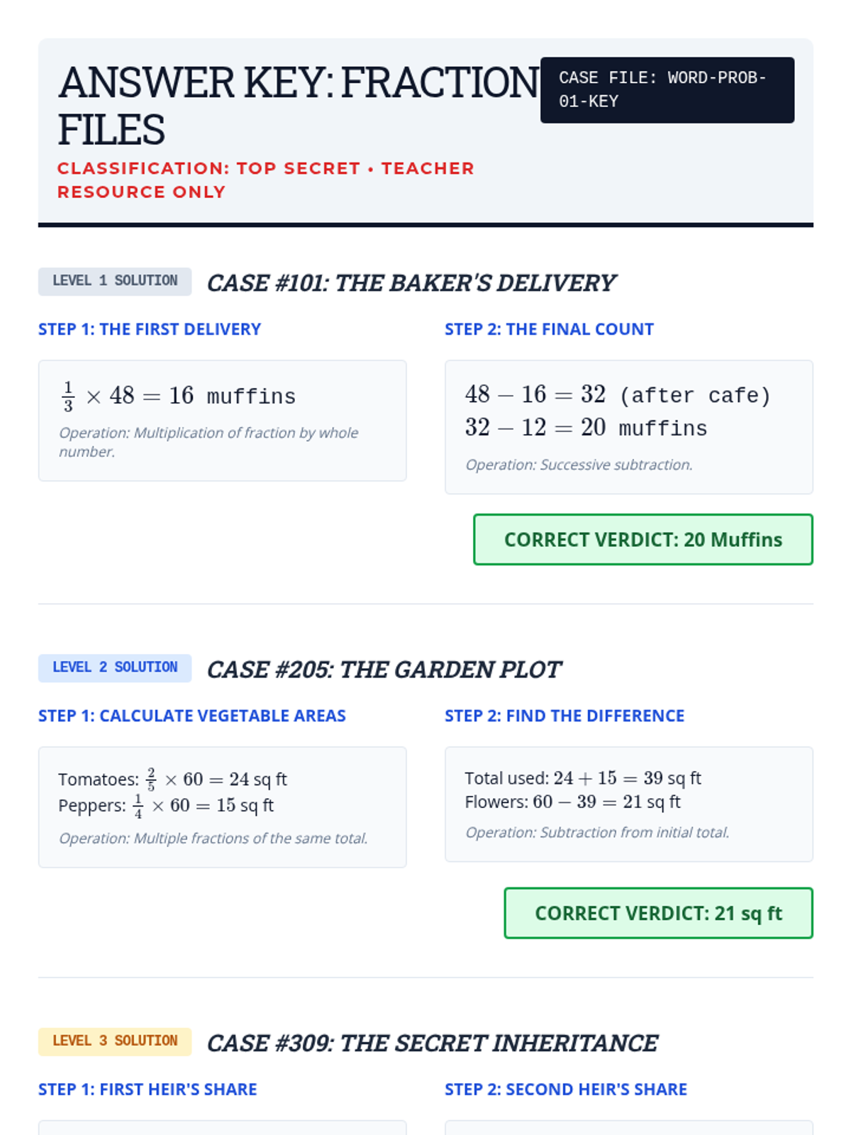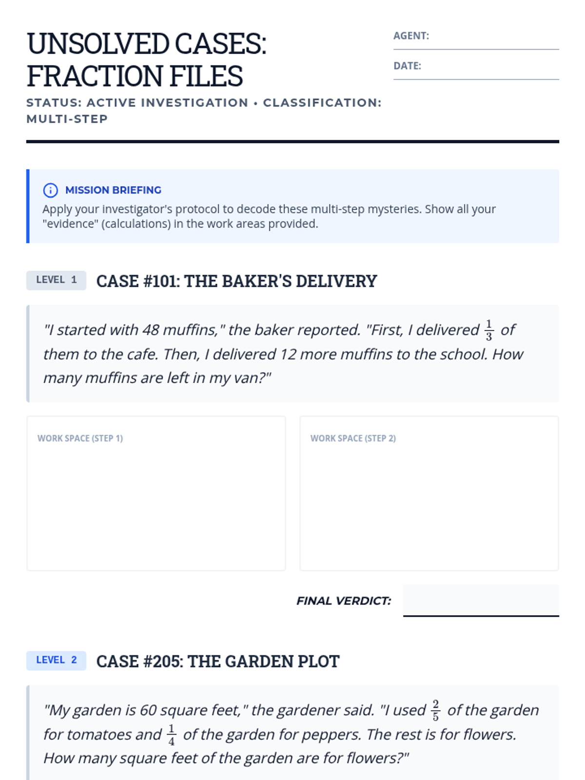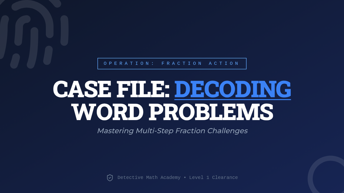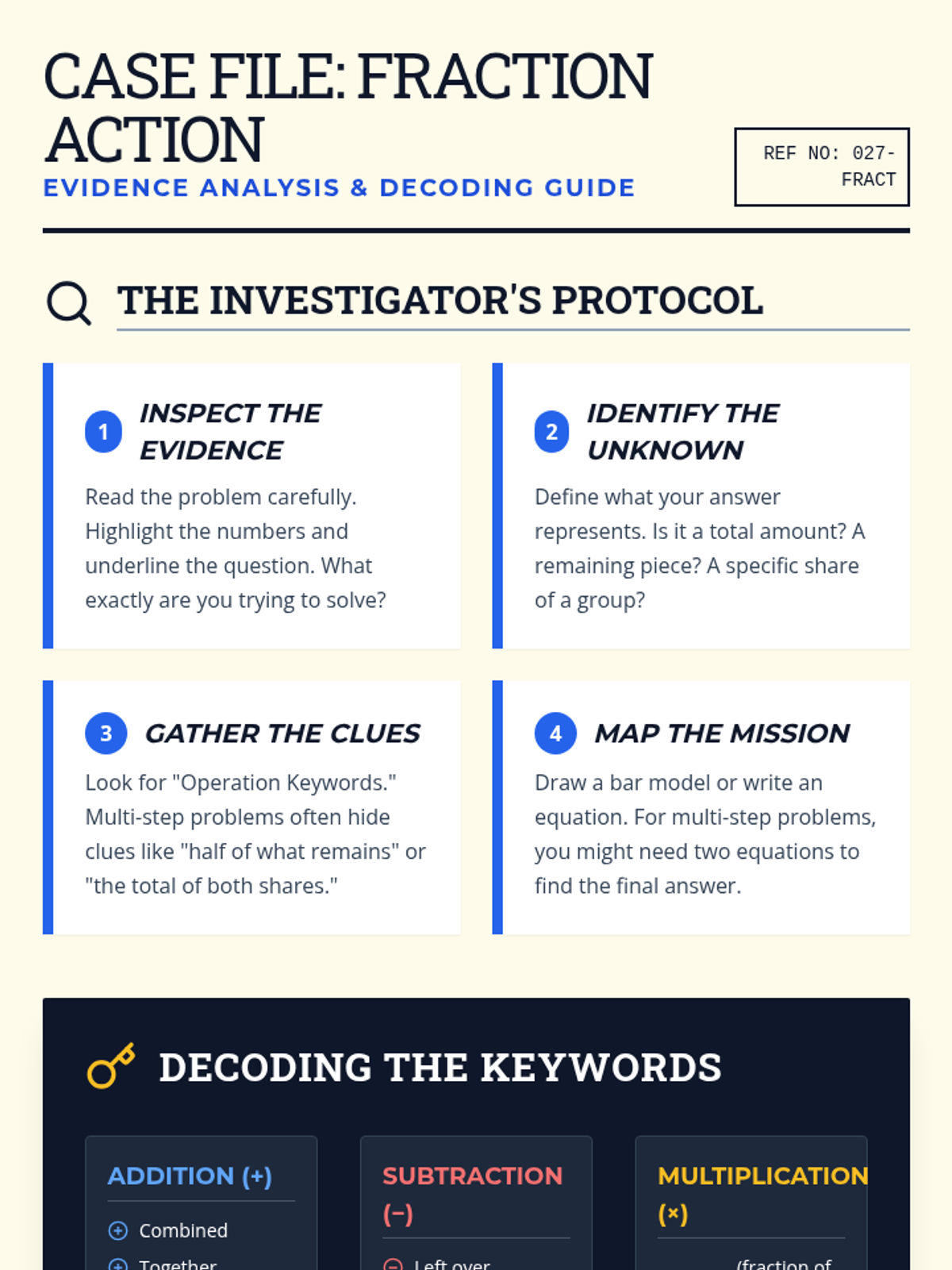 A comprehensive lesson on solving multi-step word problems involving fractions, using a detective-themed approach to decode complex scenarios.