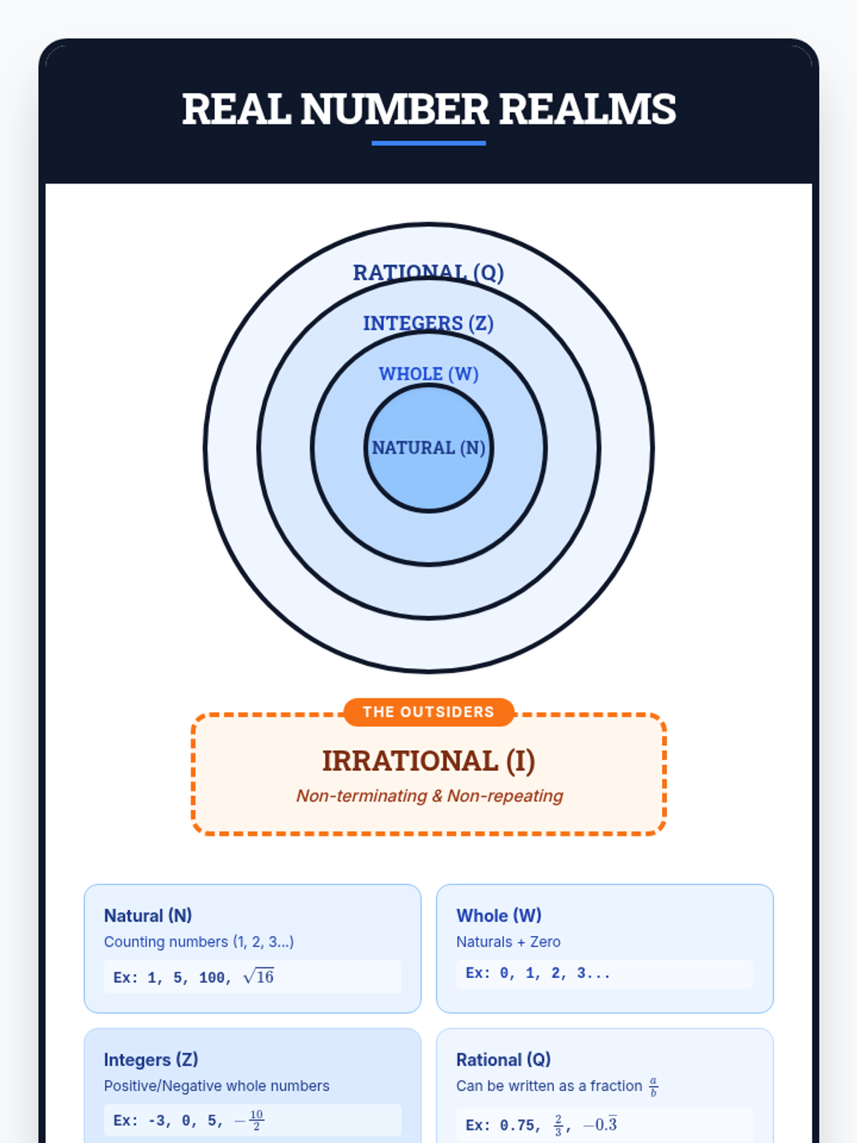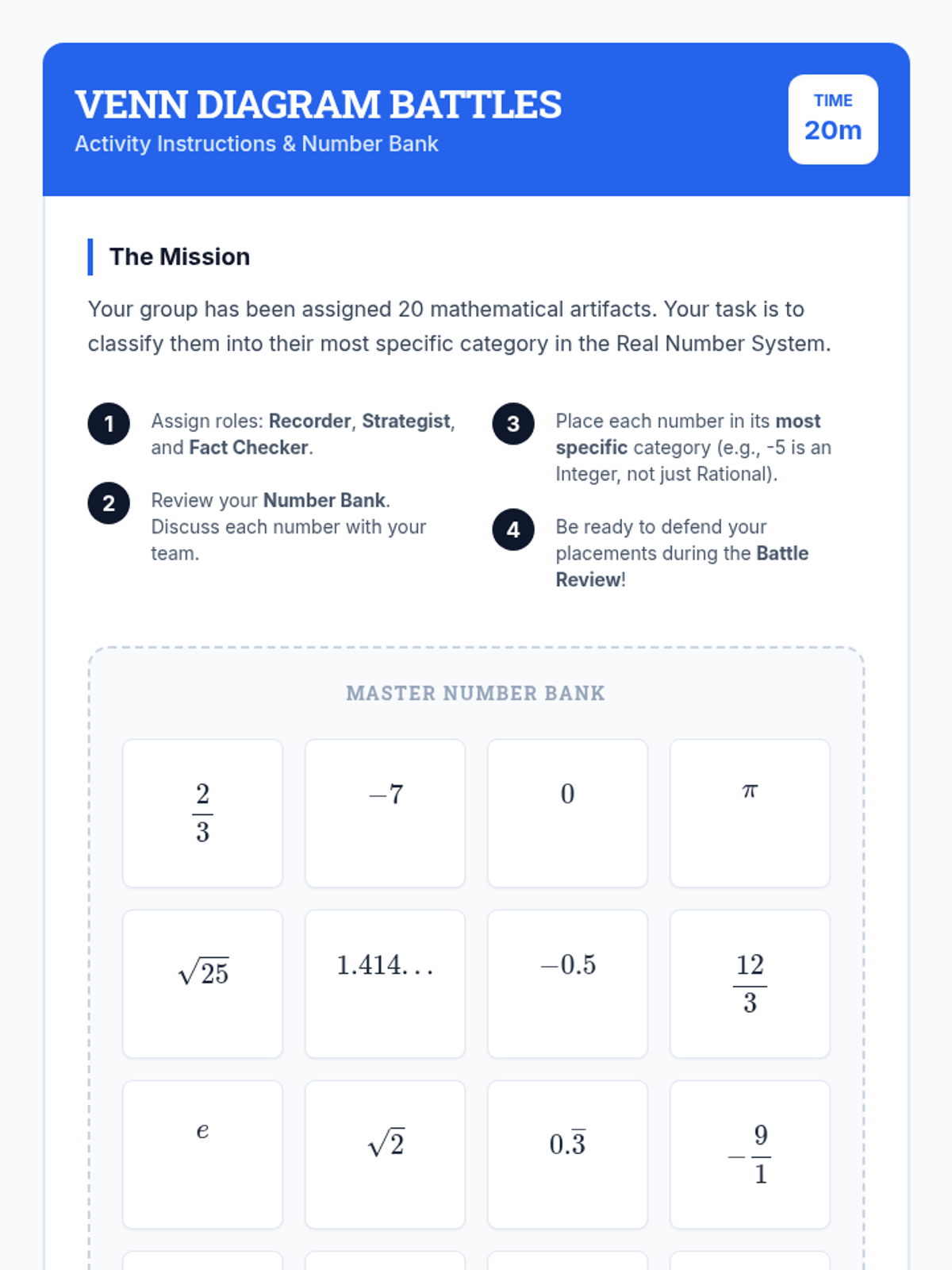 A 9th Grade Algebra 1 lesson focusing on the classification and hierarchy of the real number system using a nested 'Russian Doll' model. Students explore subsets from Natural numbers to Irrational numbers through video analysis, a collaborative sorting activity, and reflective writing.