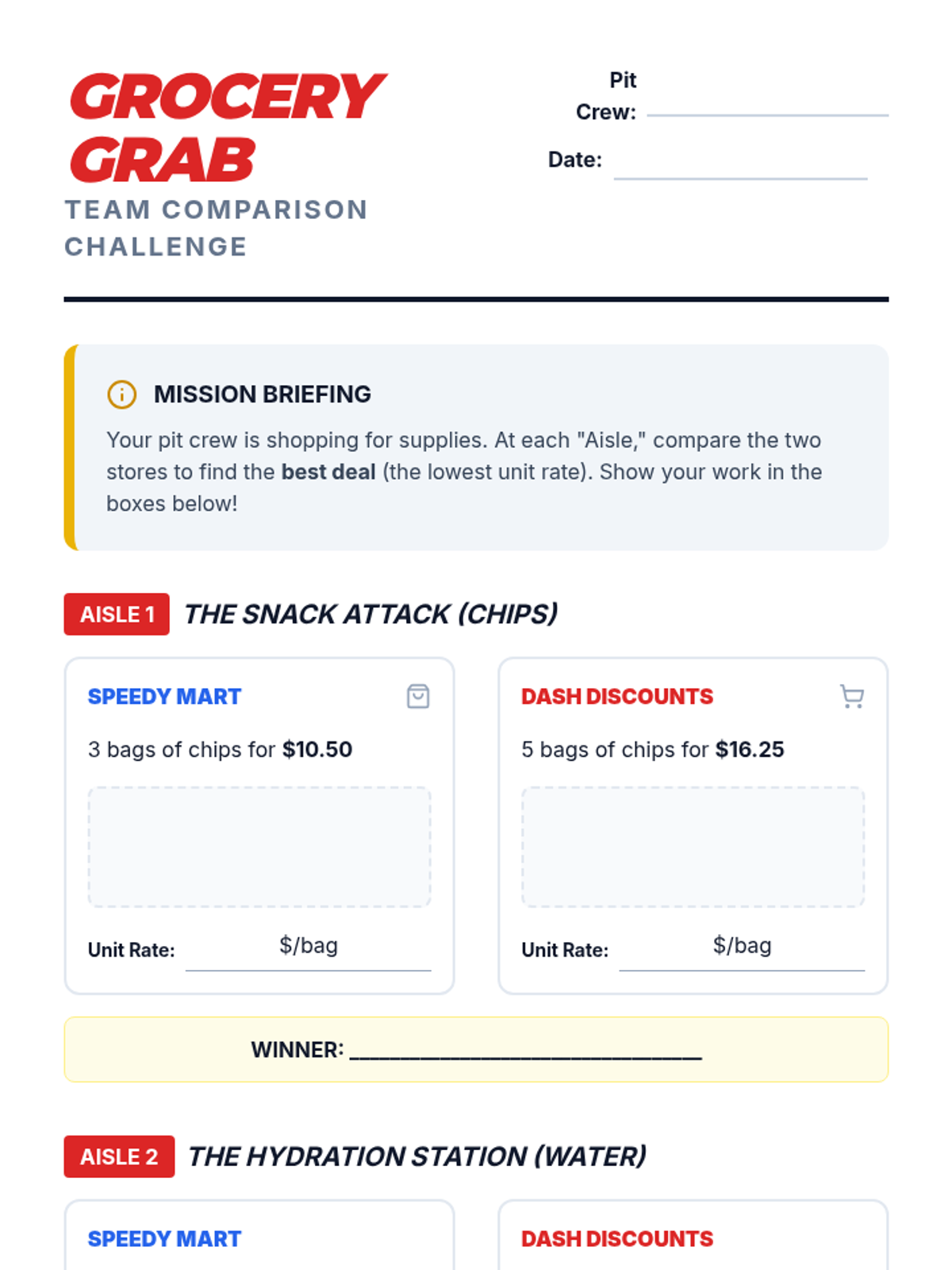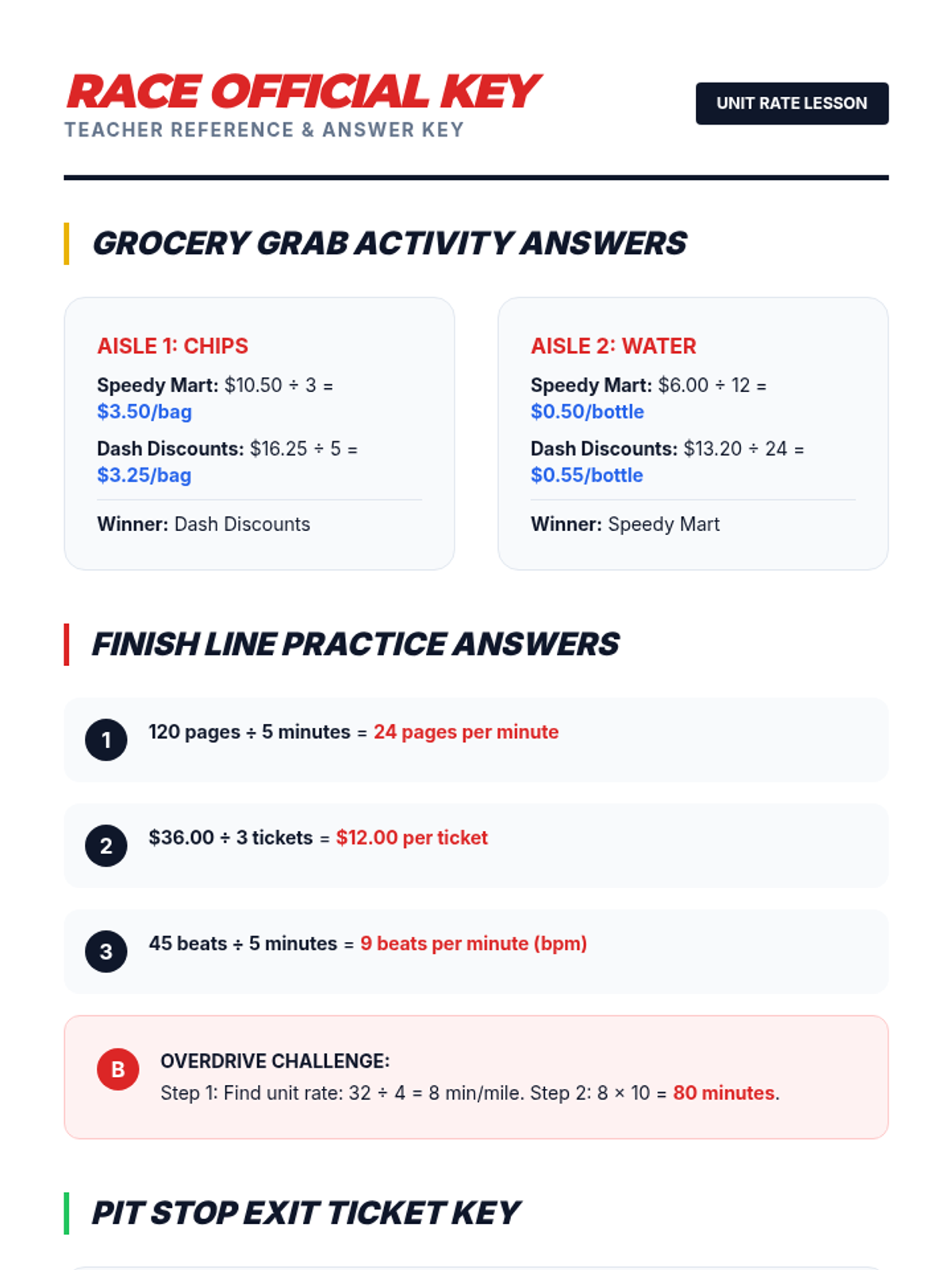 A 45-minute lesson focusing on identifying and calculating unit rates from real-world word problems using a high-energy 'Rate Race' theme. Students will engage with visual examples, a group comparison activity, and independent practice.