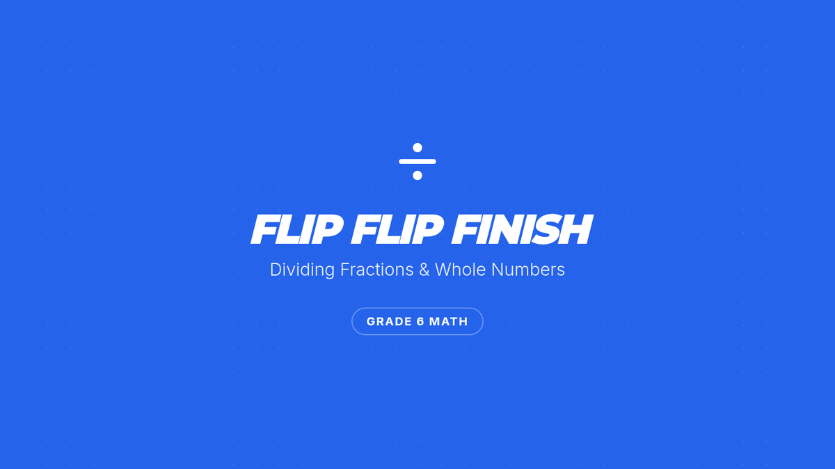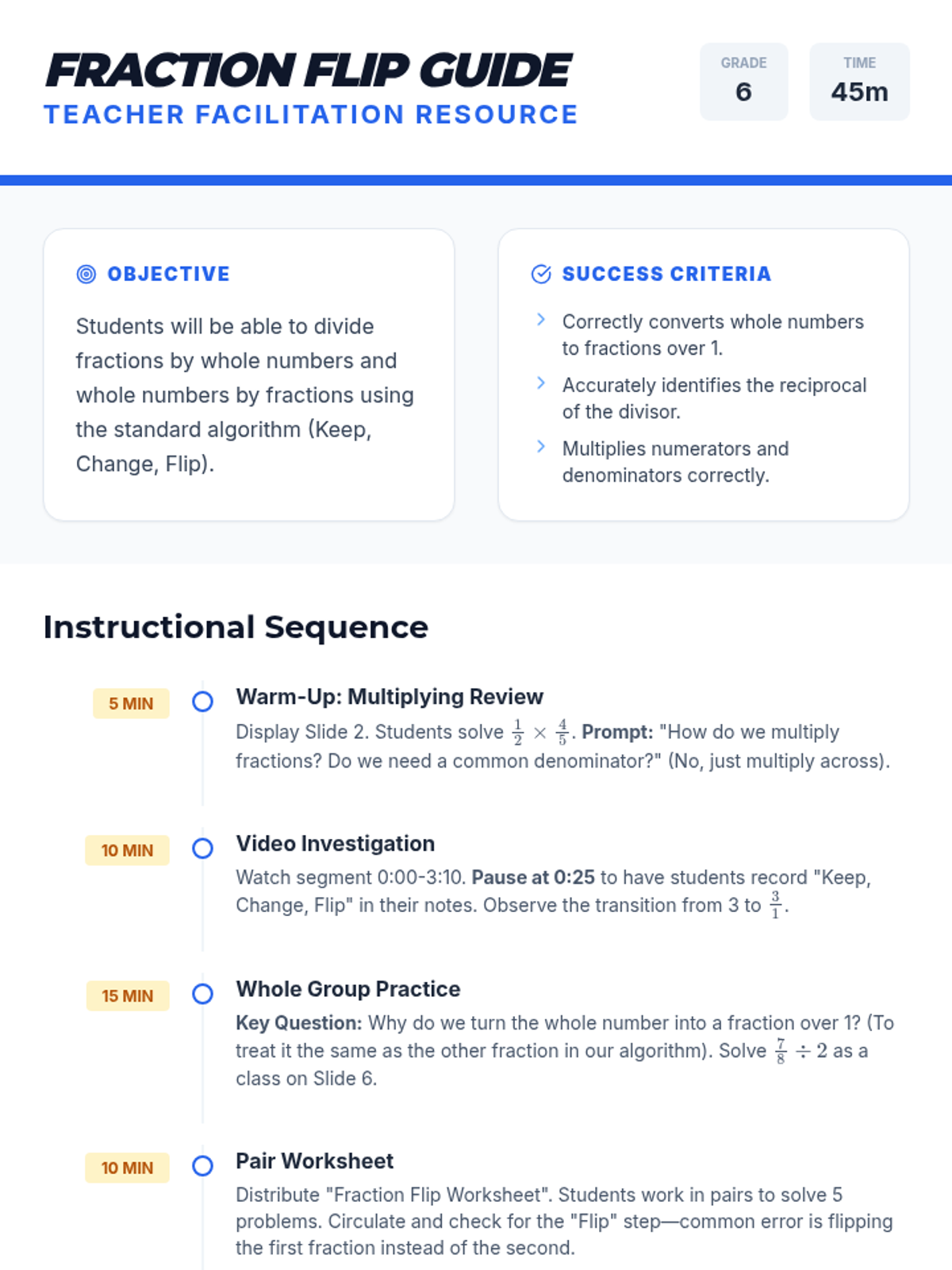 A comprehensive 6th-grade math lesson on dividing fractions and whole numbers using the 'Keep, Change, Flip' algorithm, featuring a guided video tutorial and hands-on practice.