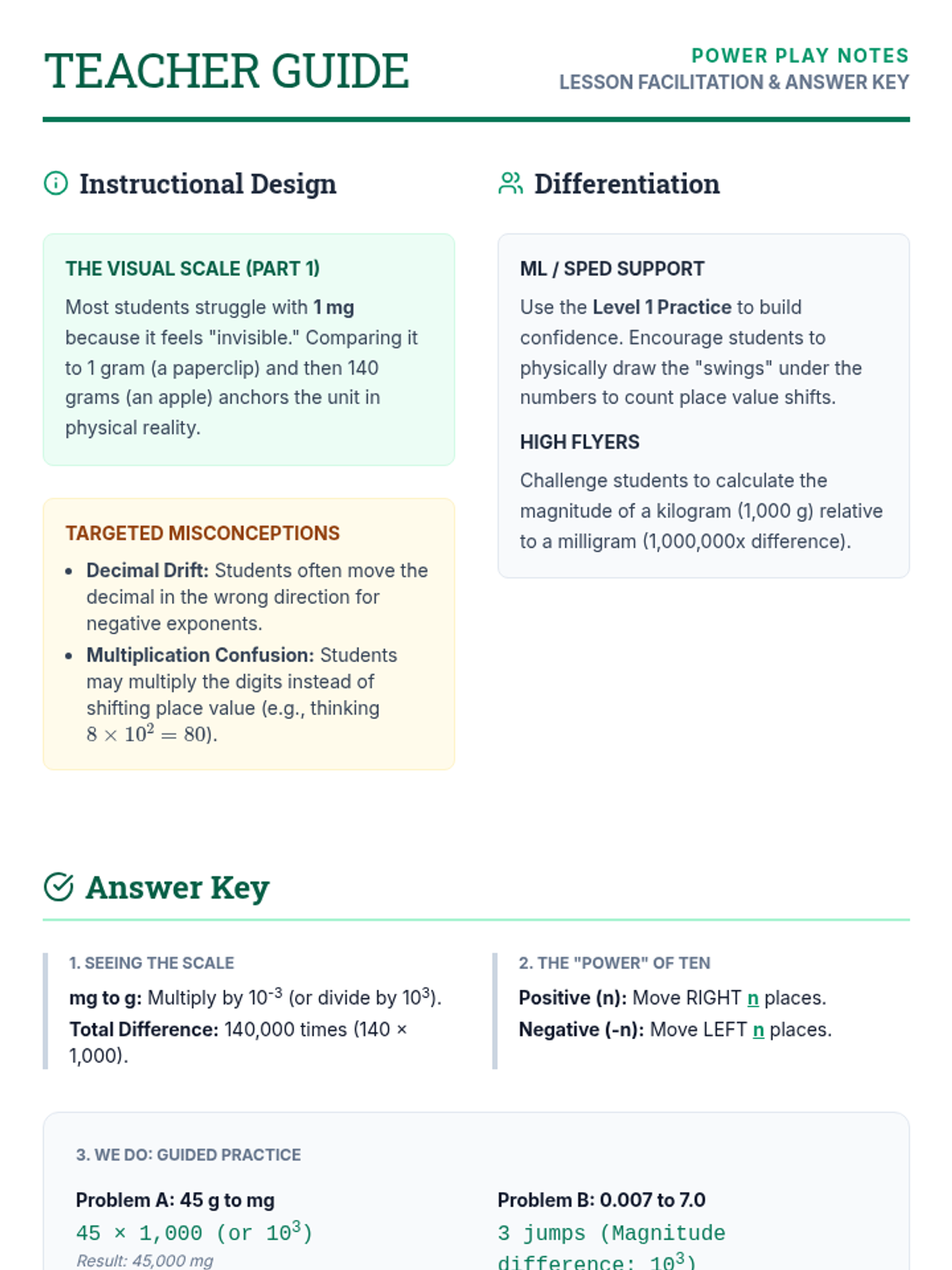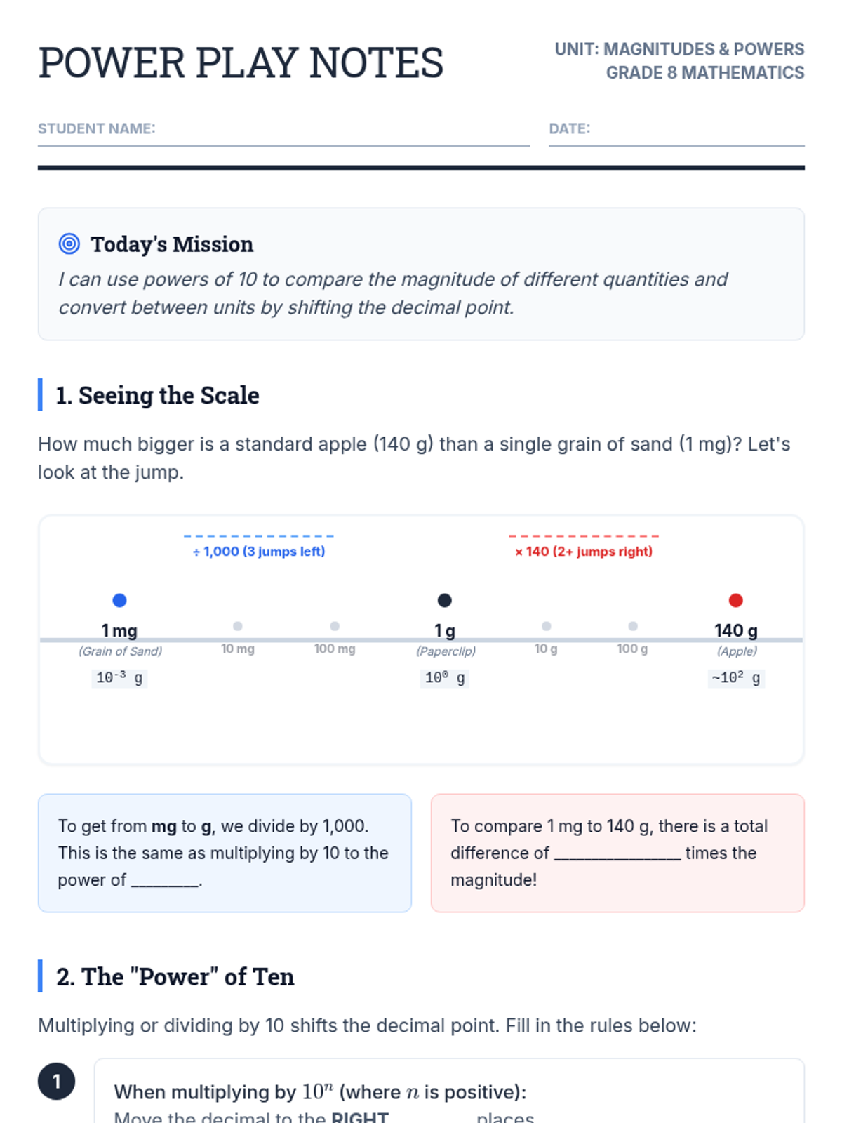 A lesson focused on understanding the magnitude of numbers through powers of 10, comparing small units like milligrams to larger quantities like grams using visual scales and scaffolded practice.