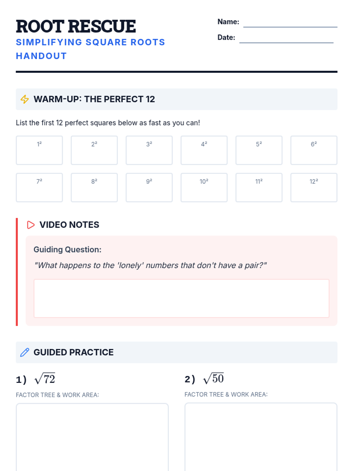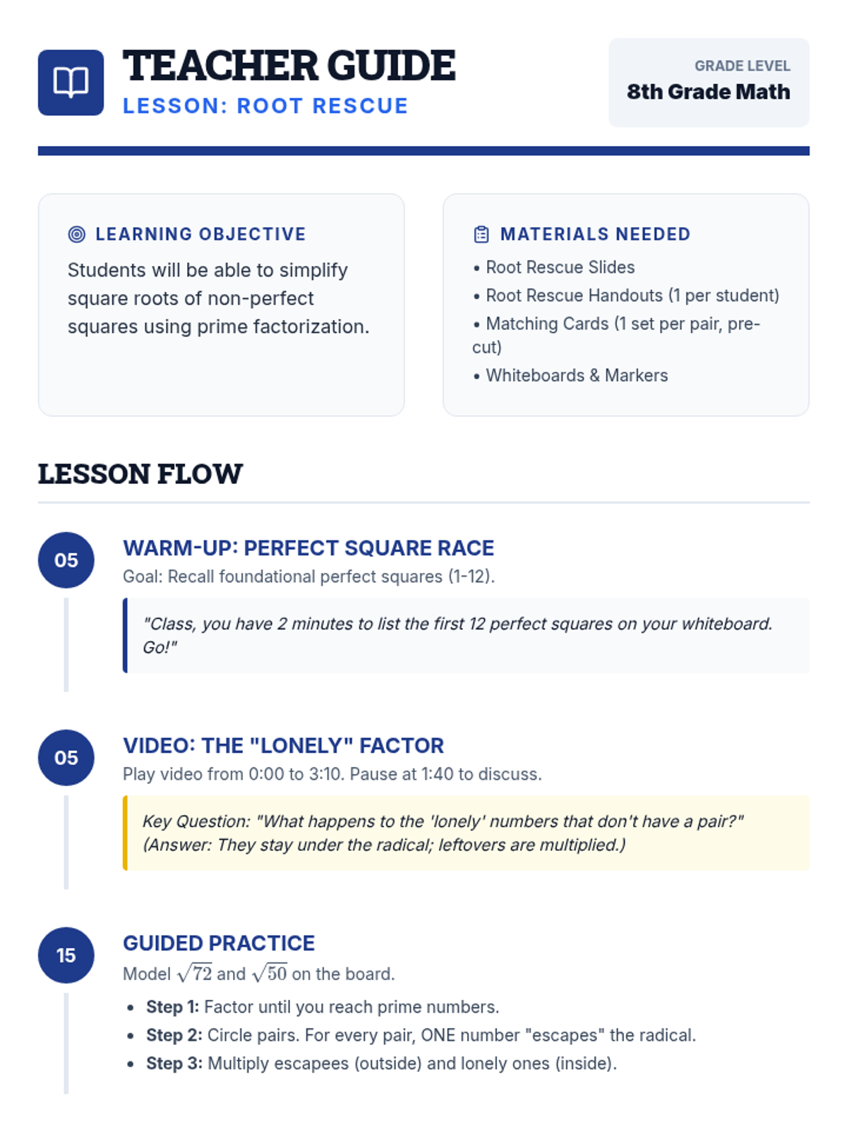 A comprehensive lesson teaching students how to simplify square roots of non-perfect squares using the prime factorization 'tree' method. Includes a slide presentation with video integration, a student practice handout, matching activity cards, and a teacher facilitation guide.