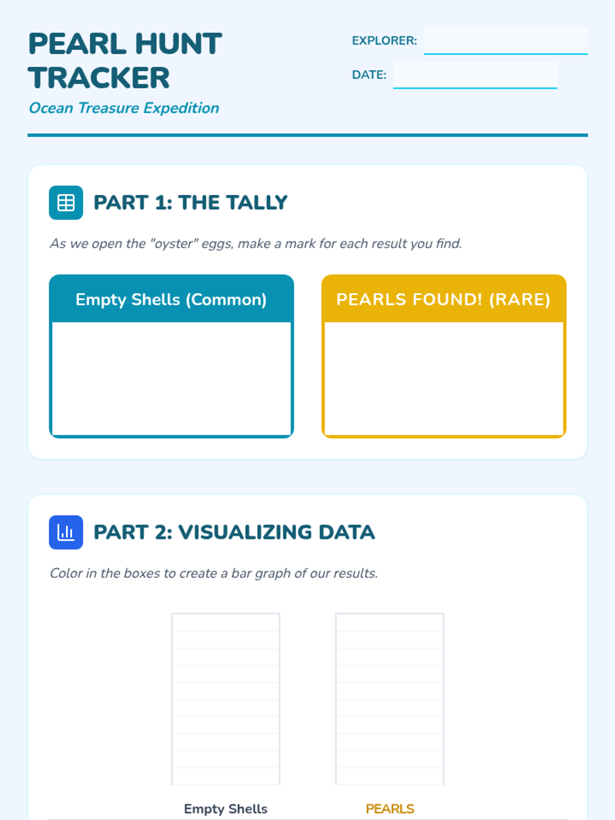 A hands-on exploration of rarity and simple probability through the lens of pearl formation in oysters. Students simulate a pearl hunt and use data to understand why rare items are valued.