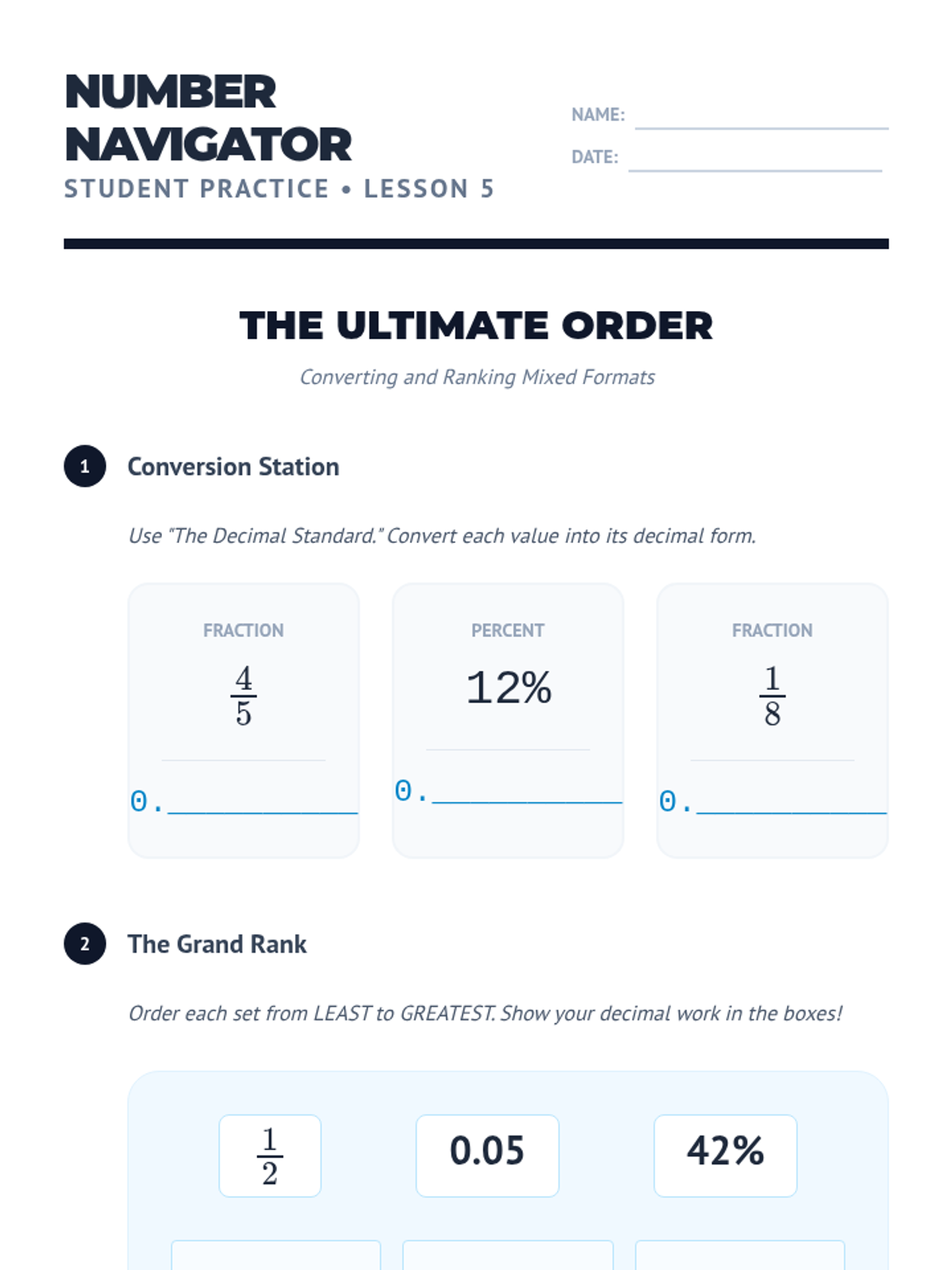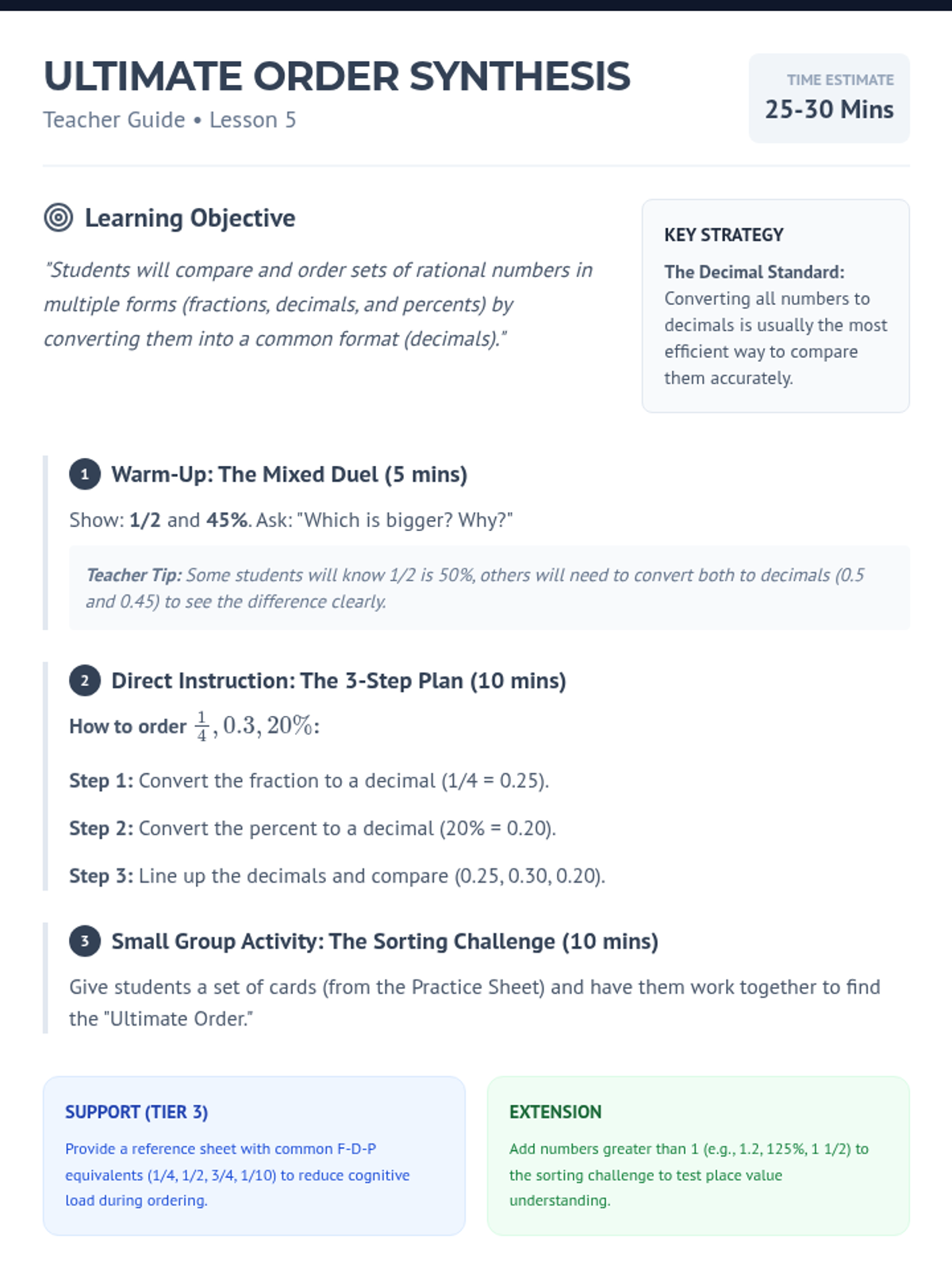 The cumulative lesson where students synthesize all previous skills to compare and order mixed sets of fractions, decimals, and percentages by converting them to a common format.