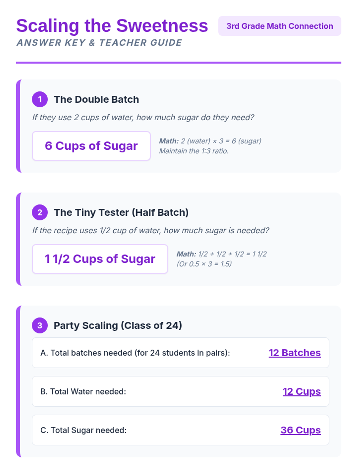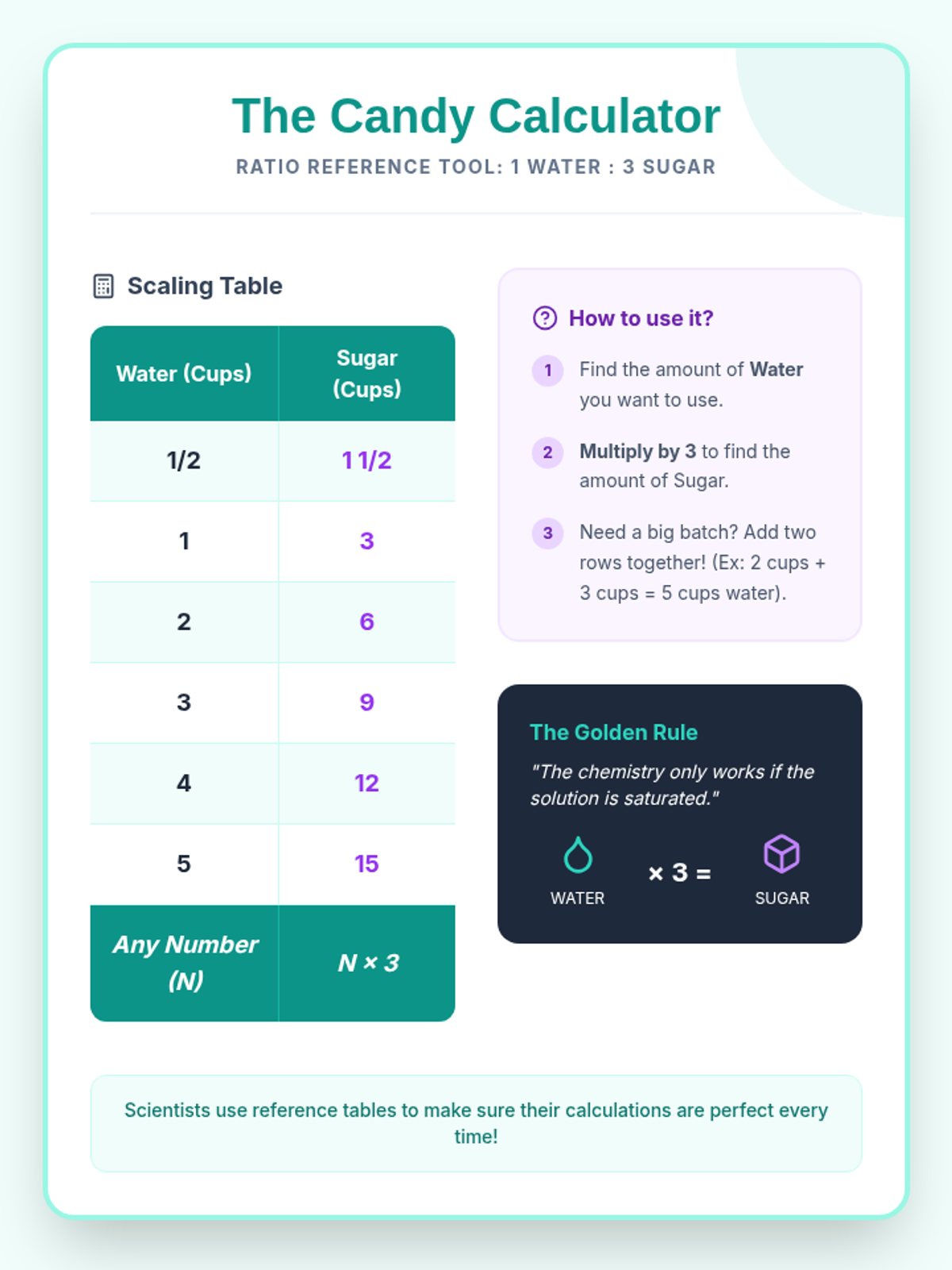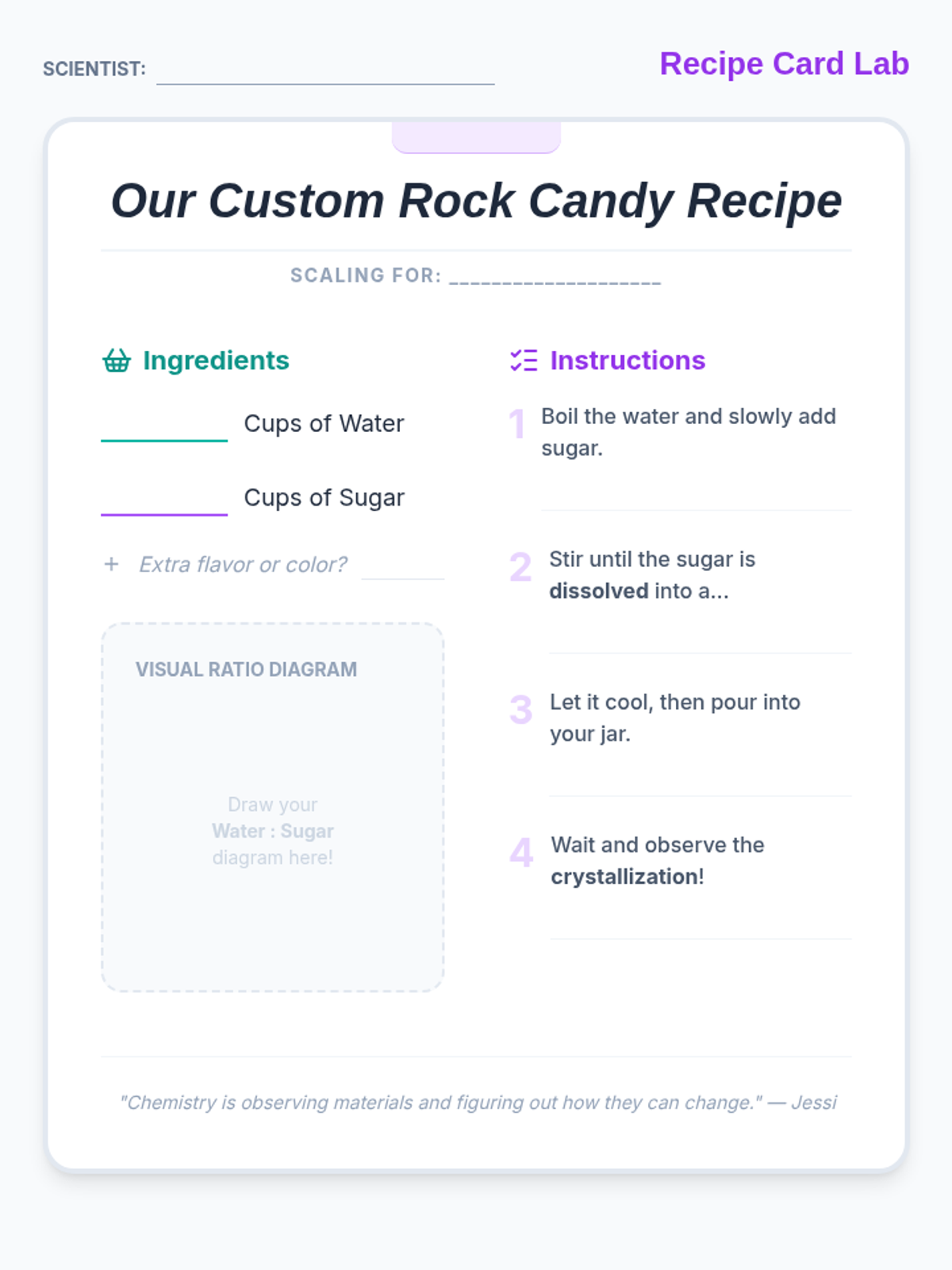 Students explore the math and science of making rock candy, focusing on the 1:3 ratio of water to sugar. They practice scaling recipes for different group sizes and create visual instructional guides.