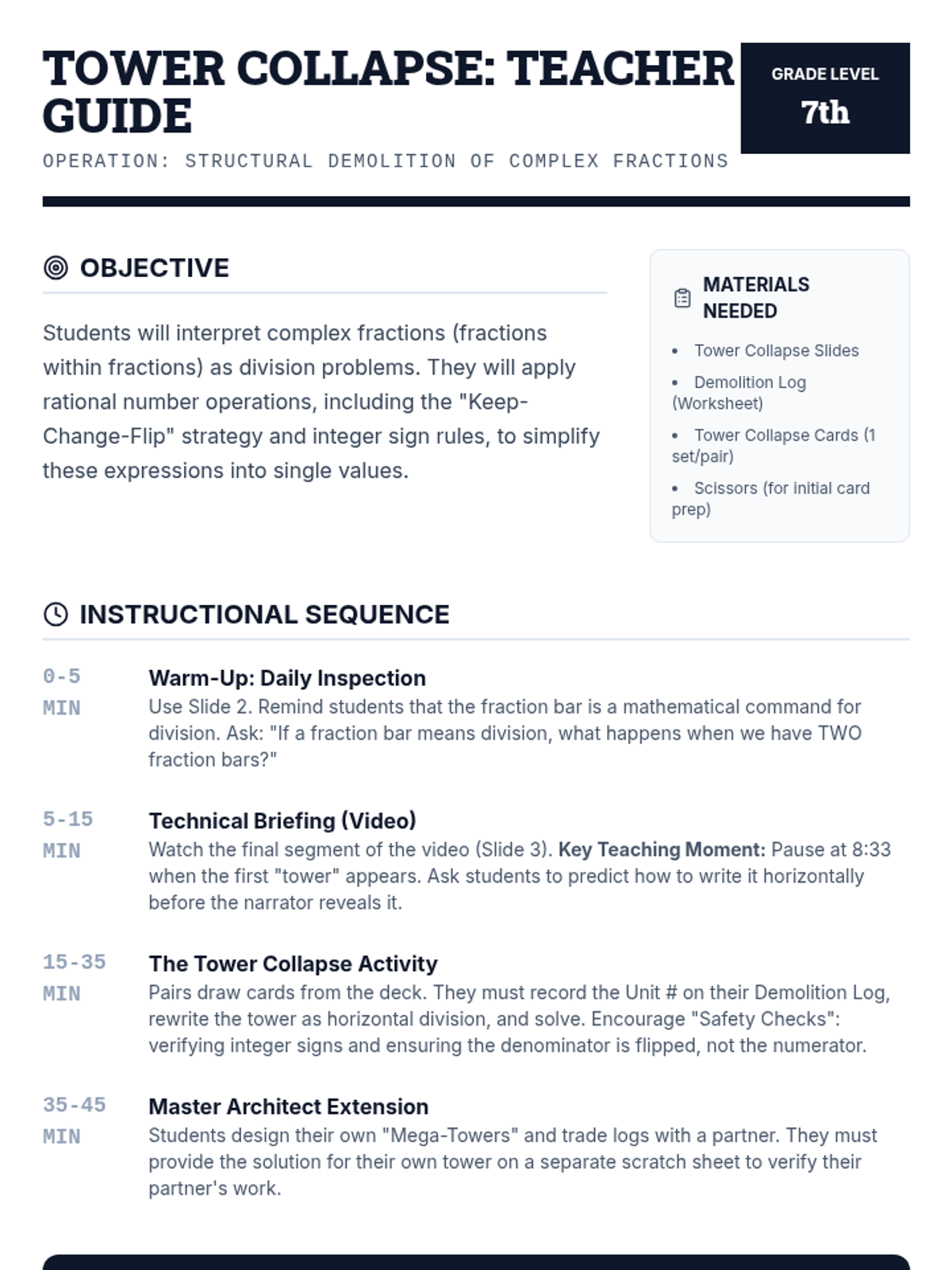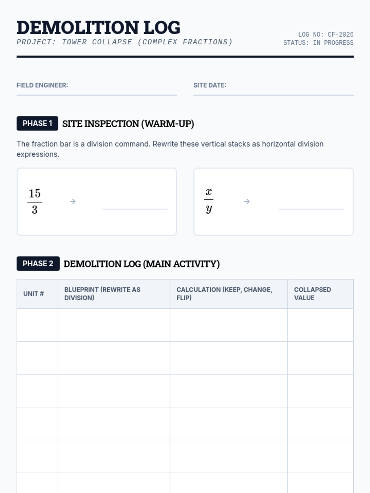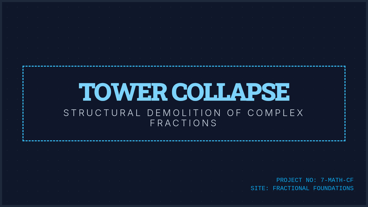 Students master complex fractions by 'collapsing' vertical towers into horizontal division problems. This lesson uses a blueprint-inspired aesthetic to help students visualize the structure of fractions within fractions.