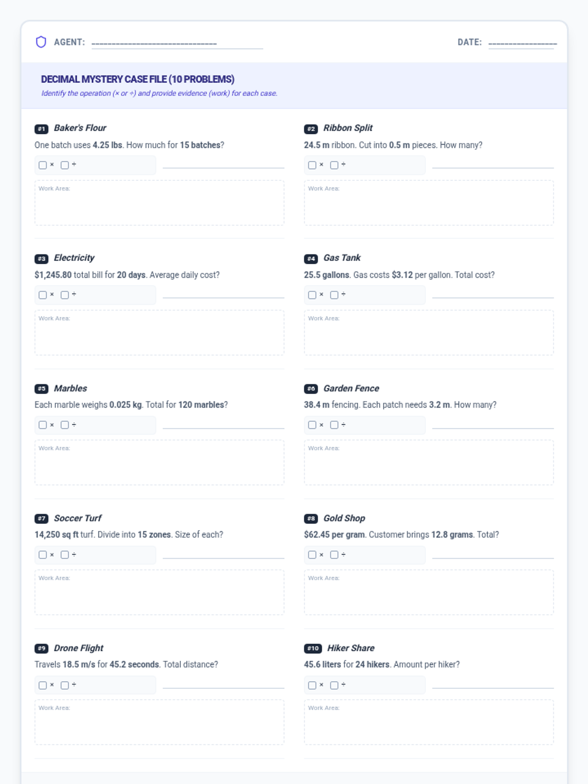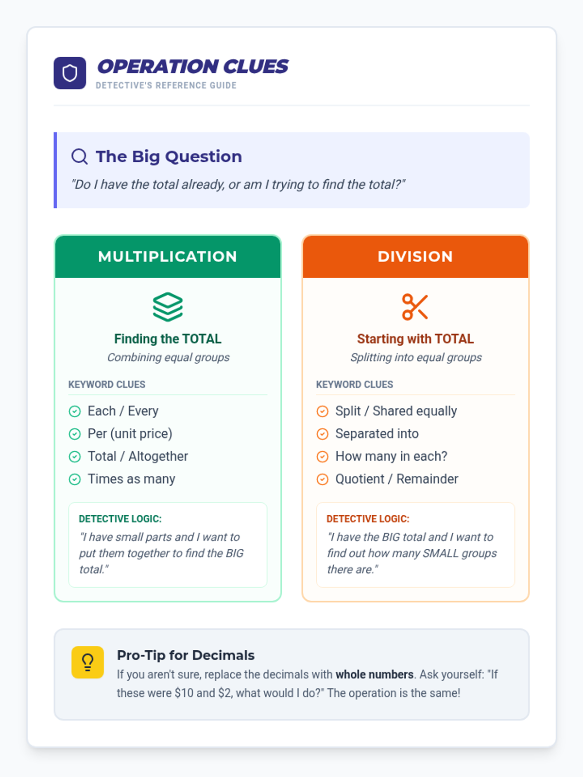 A 5th-grade math lesson focused on distinguishing between multiplication and division in multi-digit and decimal word problems using a 'Math Detective' framework.
