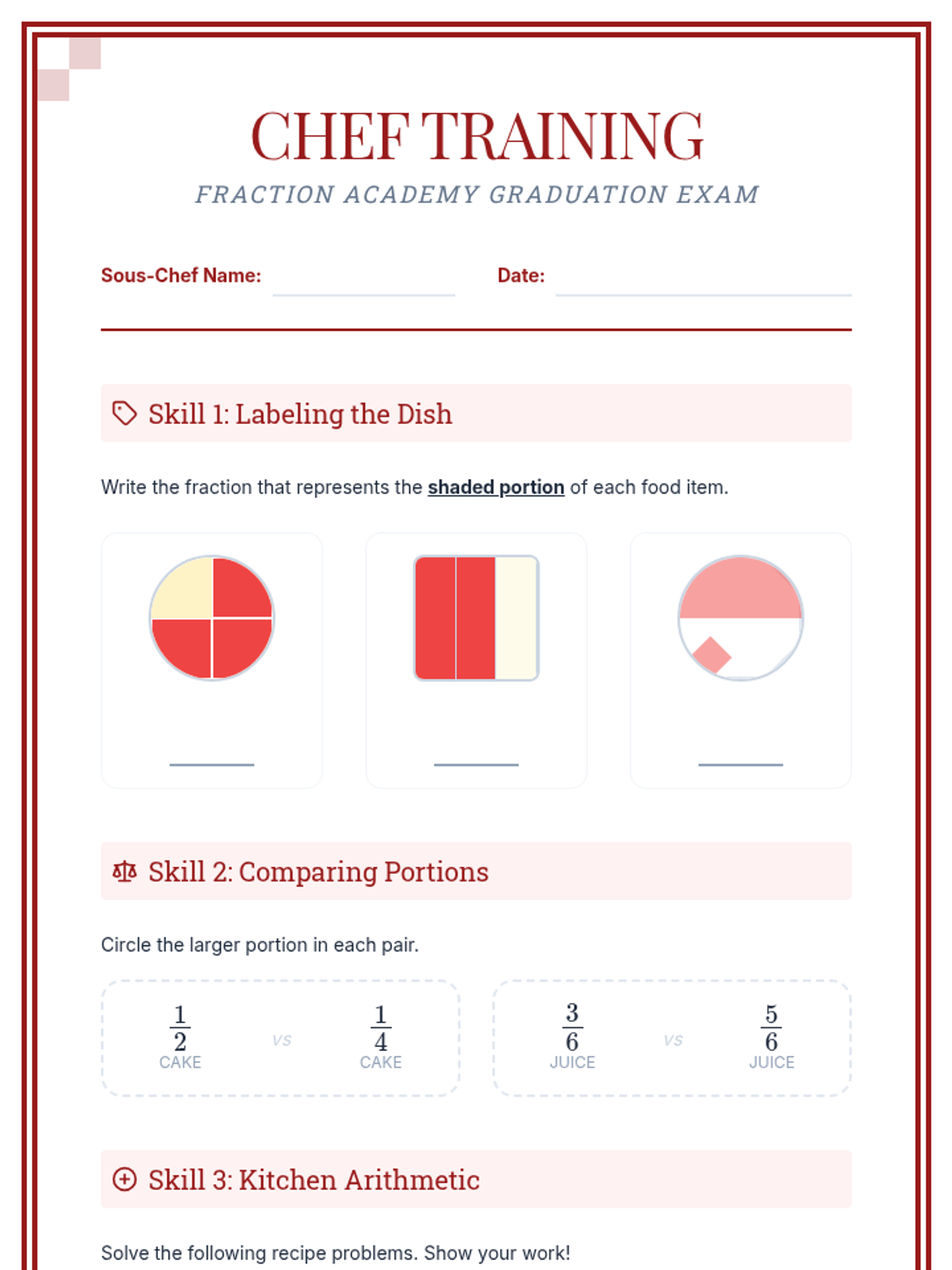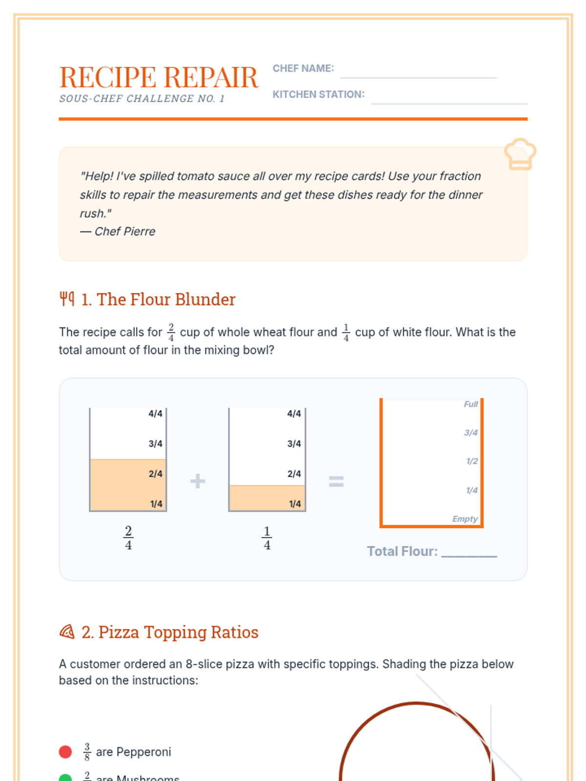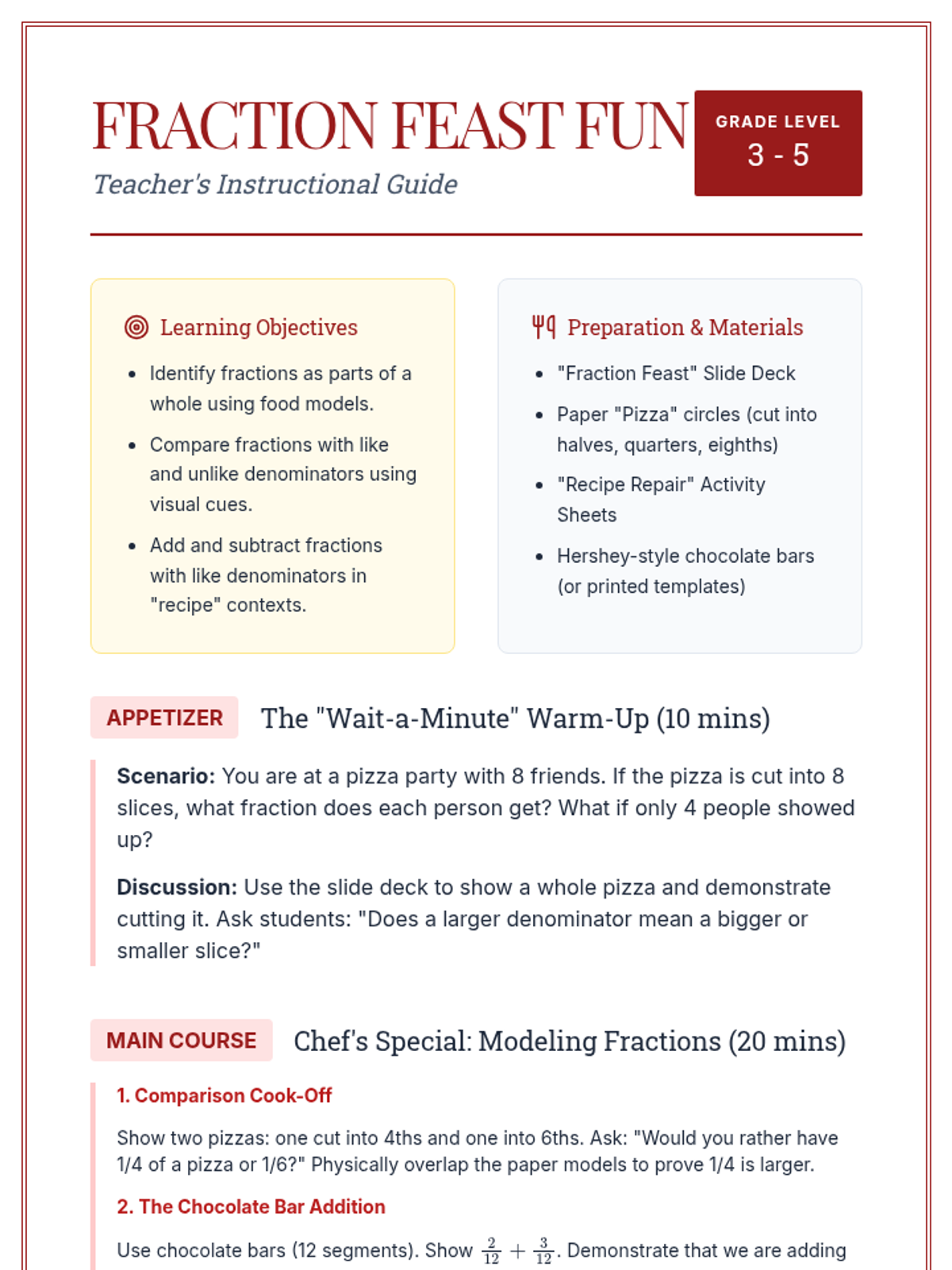 A culinary-themed lesson where students explore identifying, comparing, adding, and subtracting fractions using food analogies and hands-on activities.