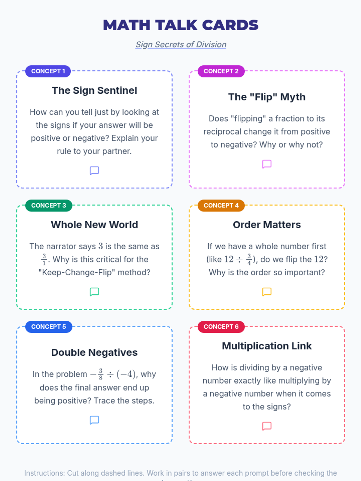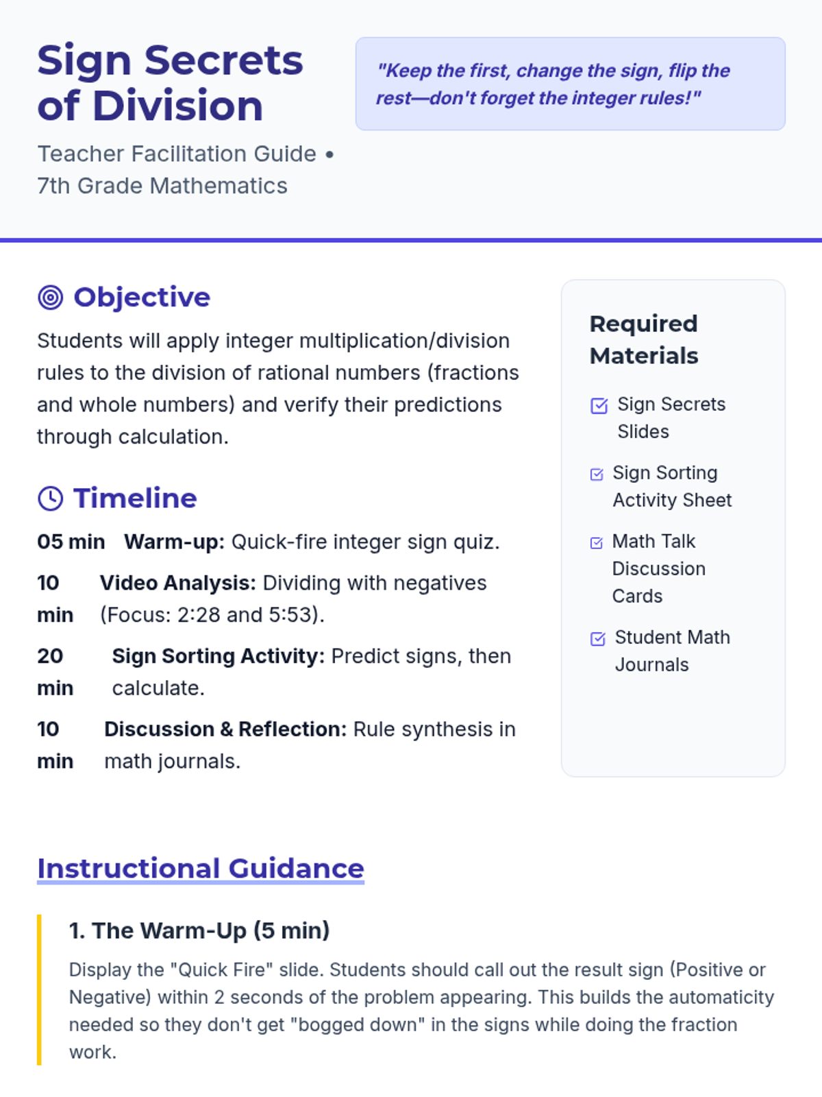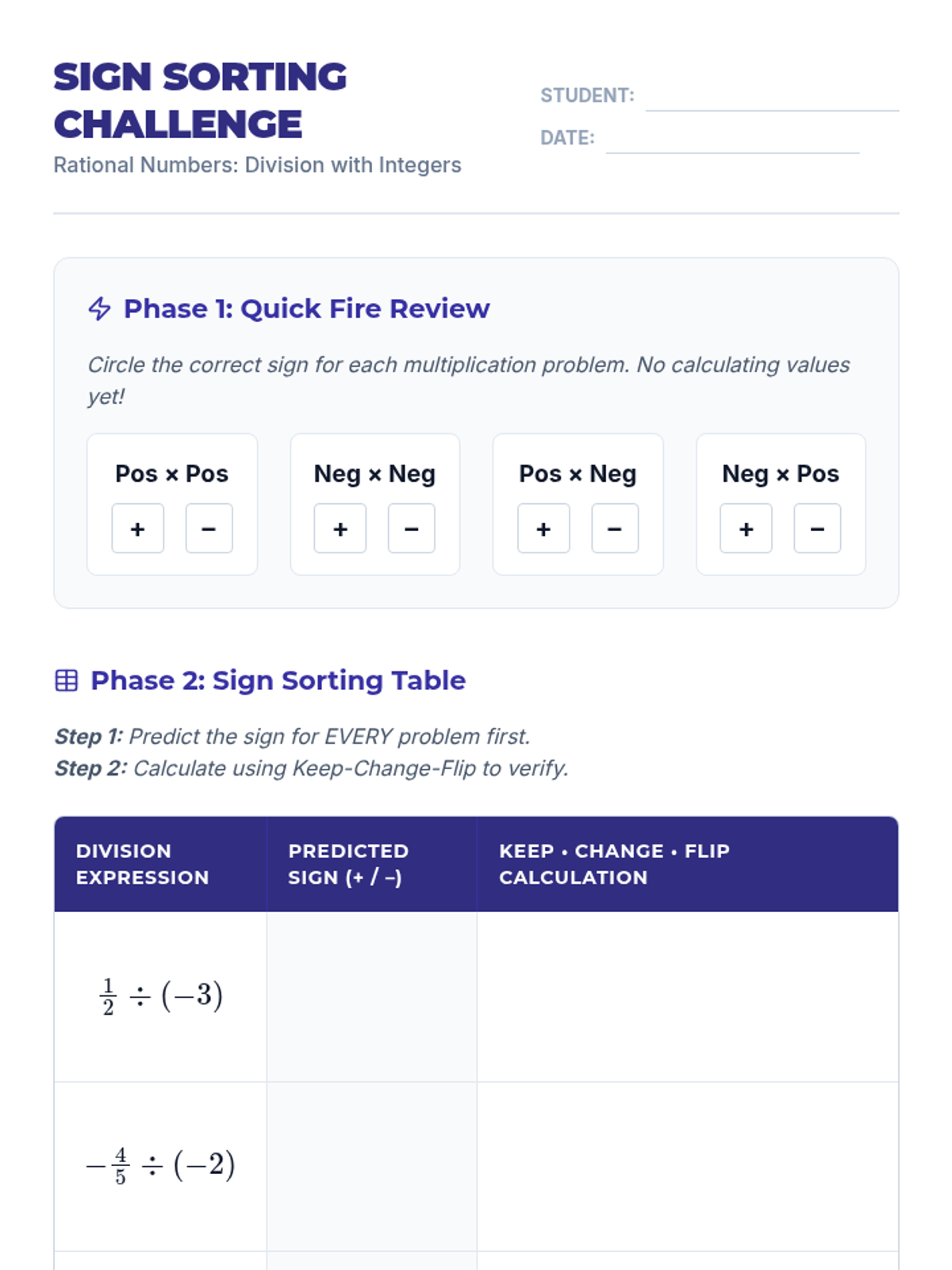 Students will apply integer rules (positive/negative signs) to the division of rational numbers, focusing on fractions and whole numbers using the Keep-Change-Flip method.