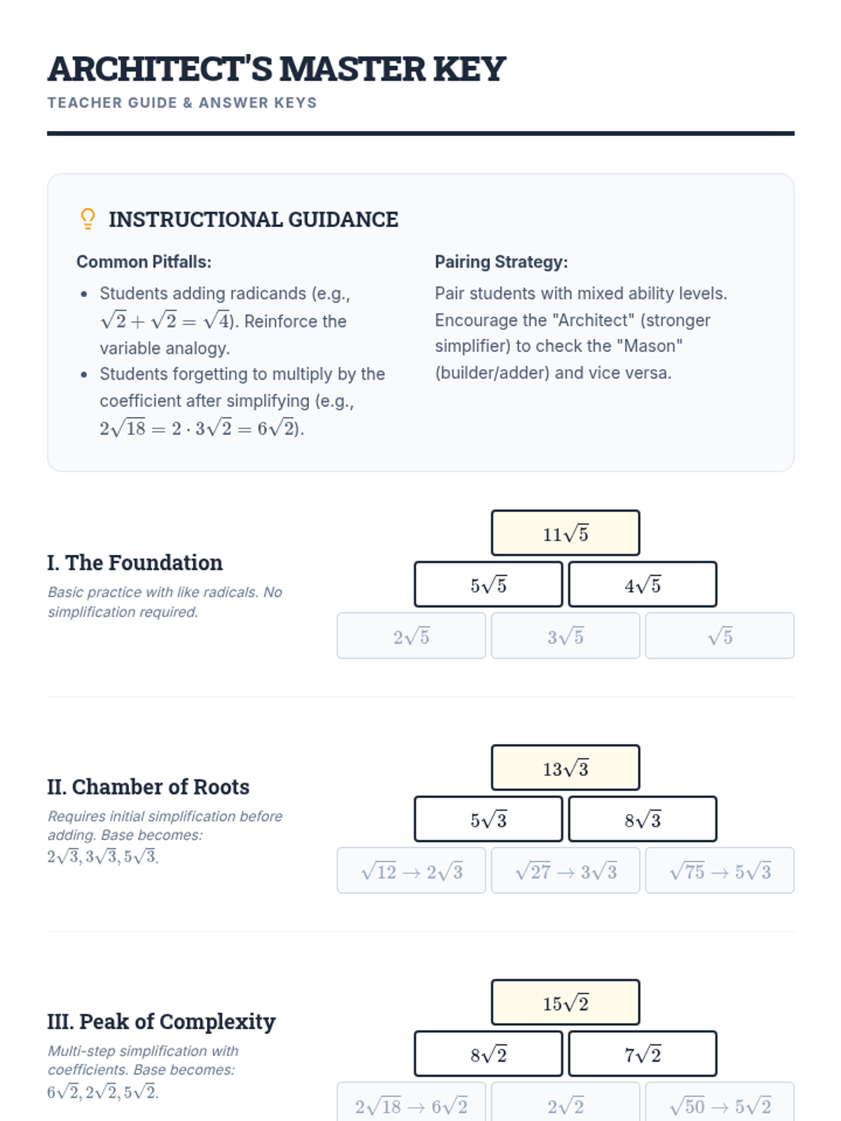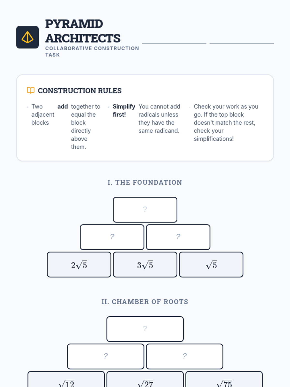 Students learn to simplify radicals with coefficients and perform addition and subtraction of like radicals using a variable analogy. The lesson culminates in a collaborative 'Radical Pyramids' puzzle activity.