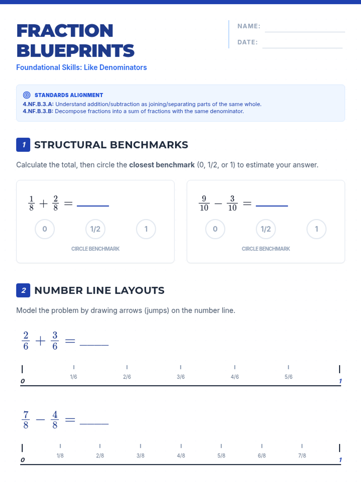 A focused 20-minute lesson on adding and subtracting fractions with like denominators using visual benchmarks and number lines to build conceptual understanding.