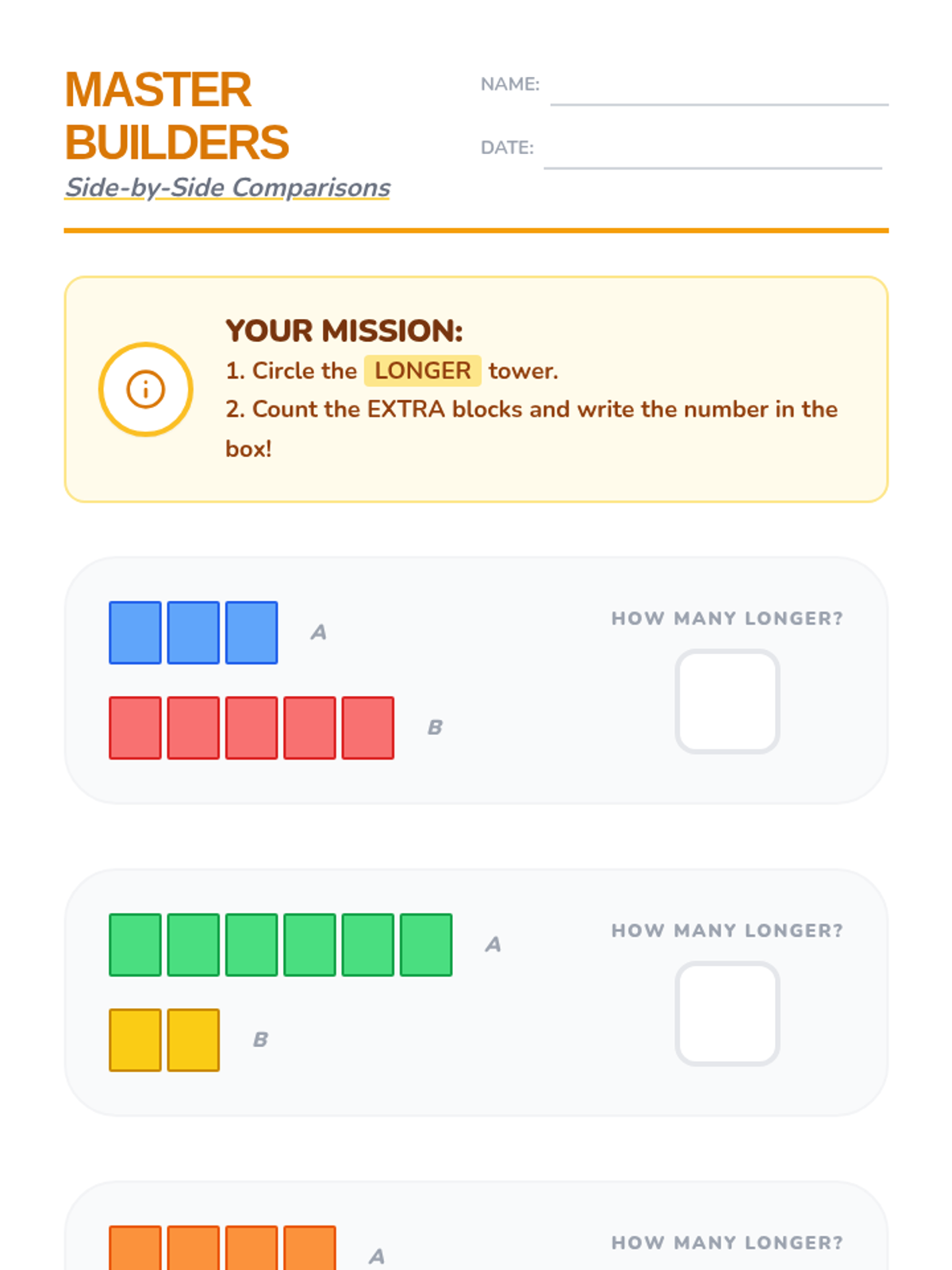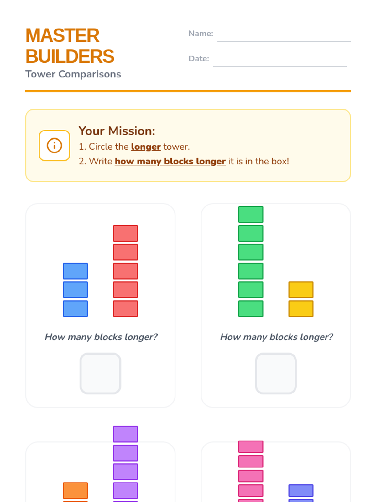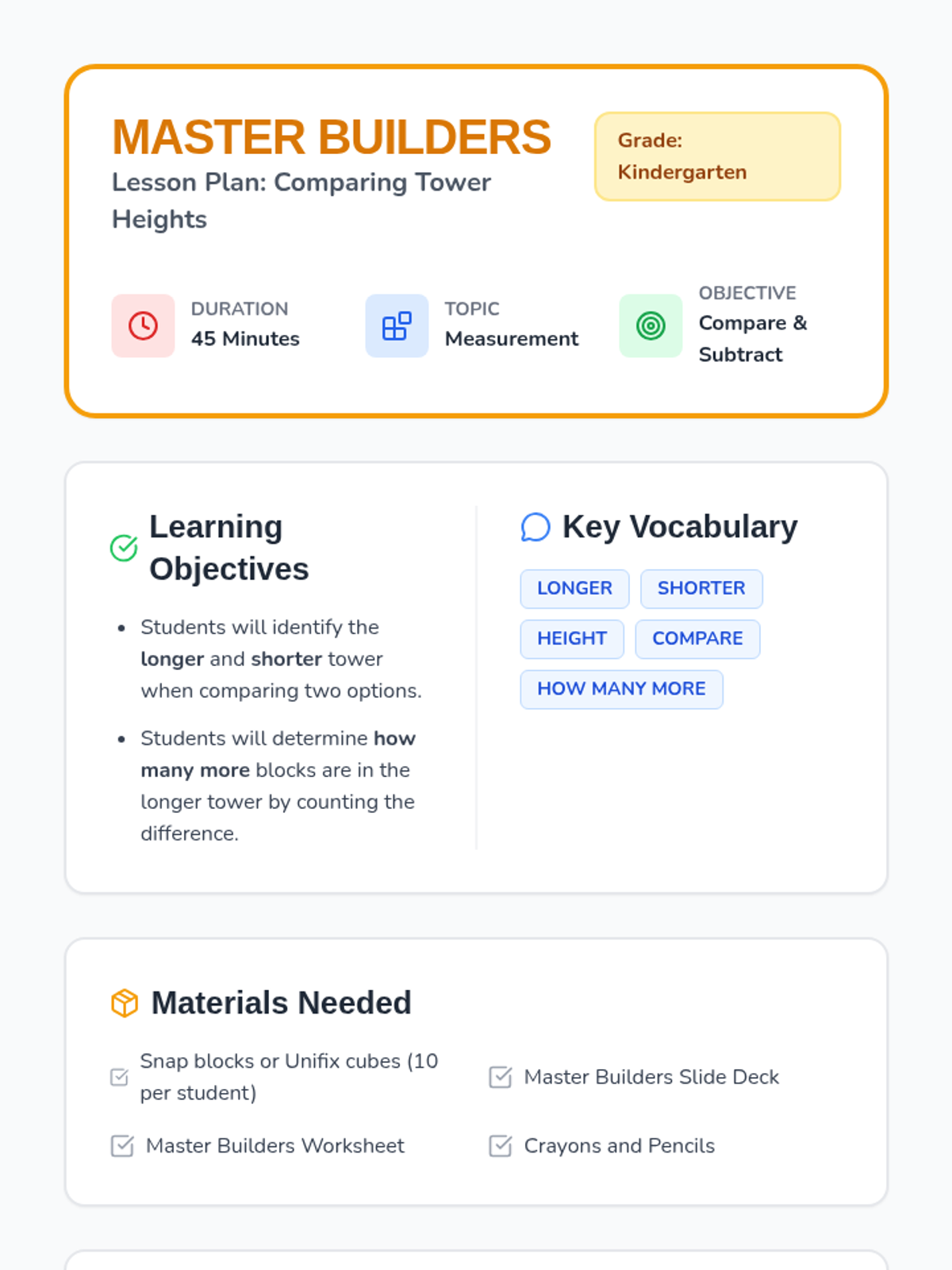 A Kindergarten lesson focused on comparing the length (height) of block towers and determining the difference in length by counting individual block units.