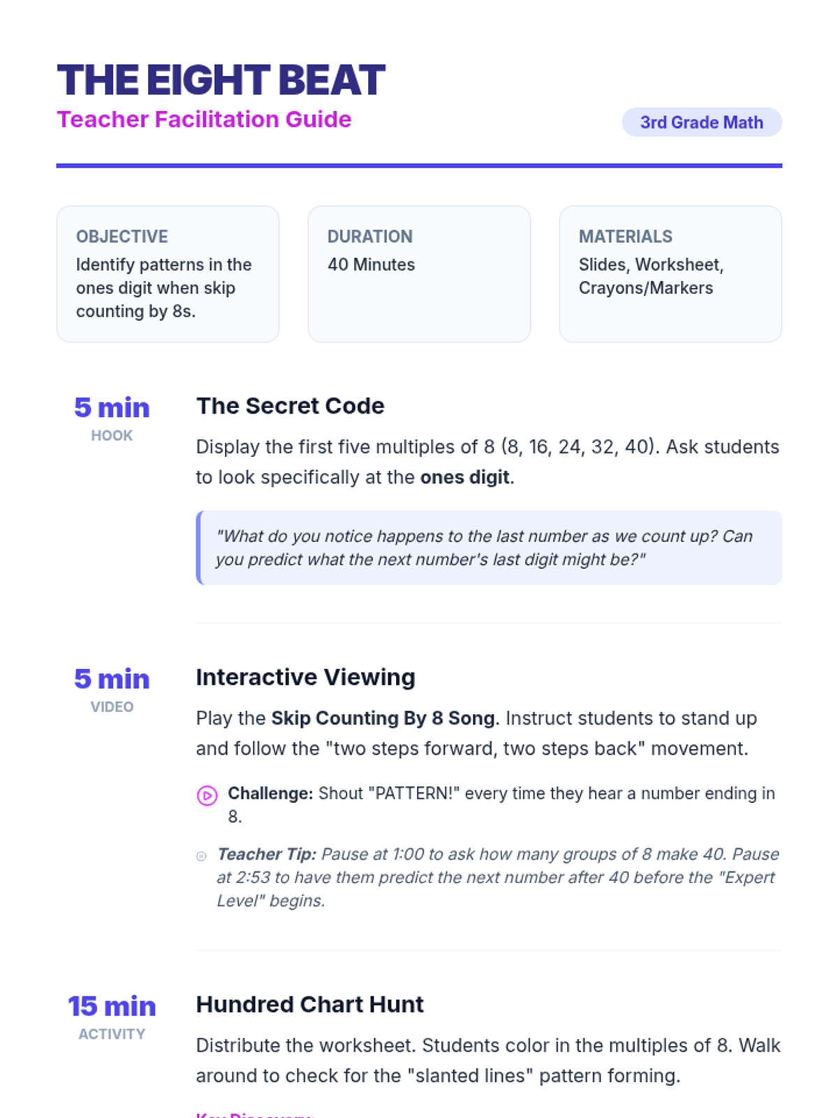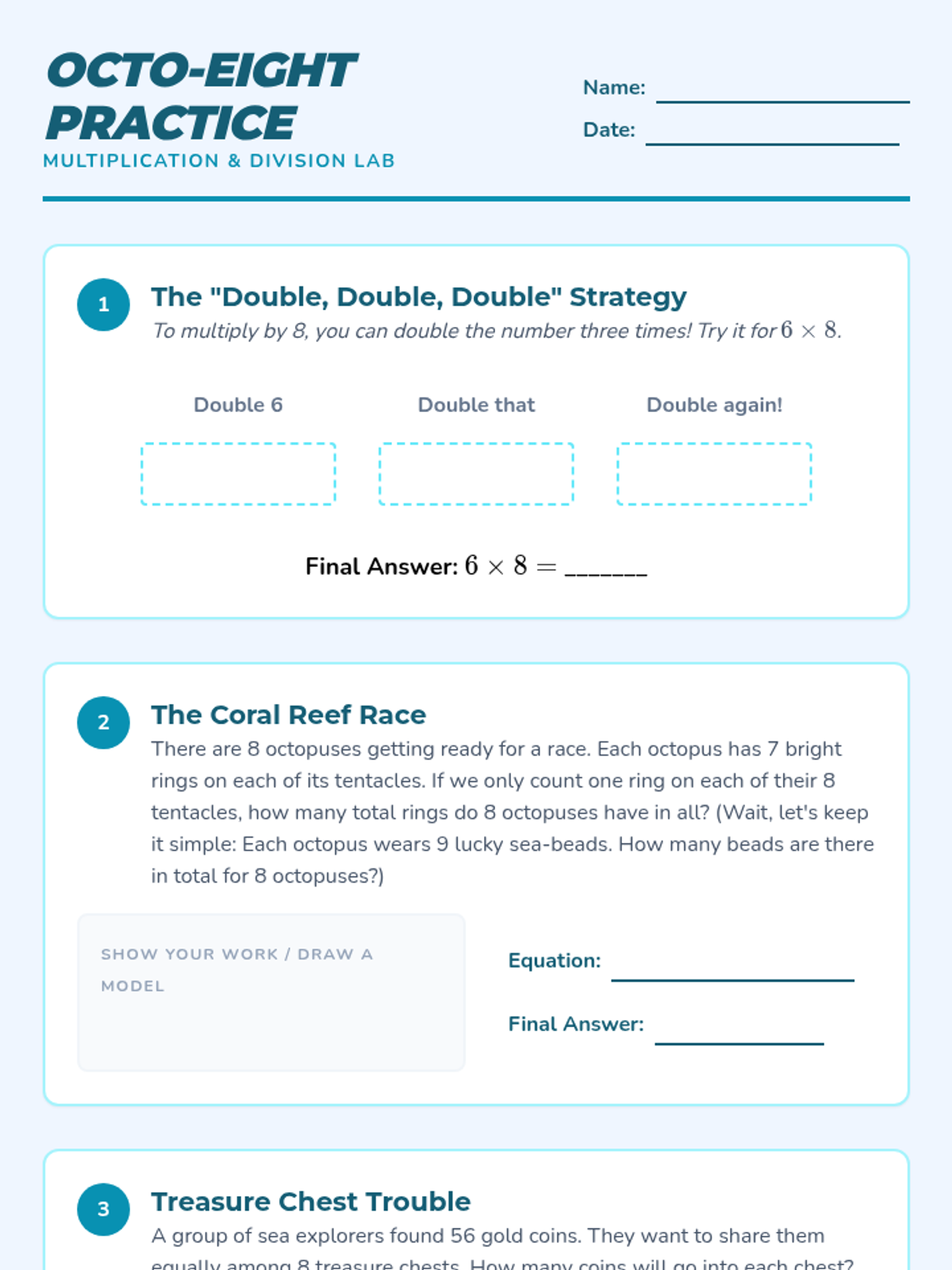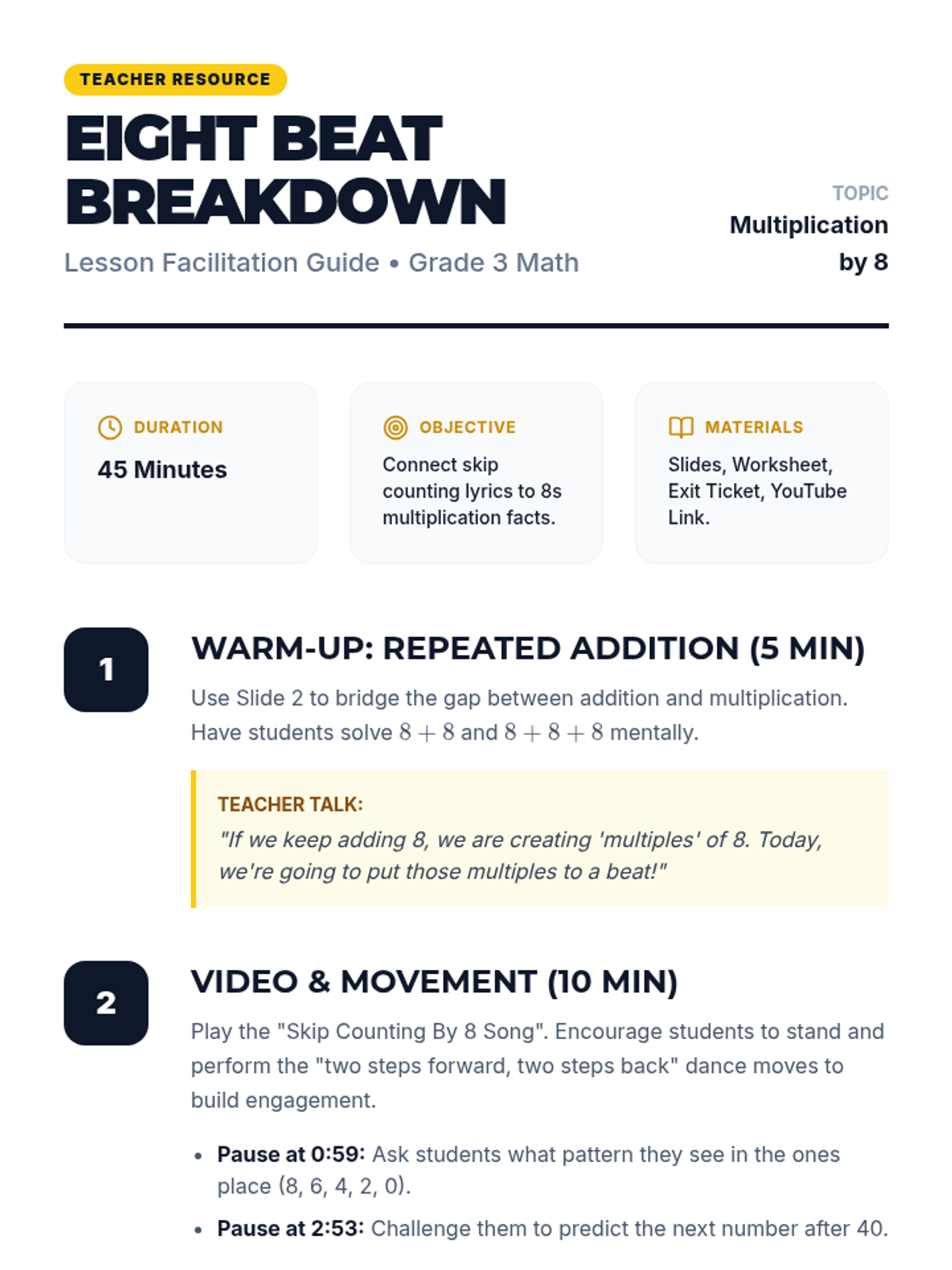 A lesson focused on mastering multiplication and division by 8 using the 'double-double-double' strategy and real-world word problems.