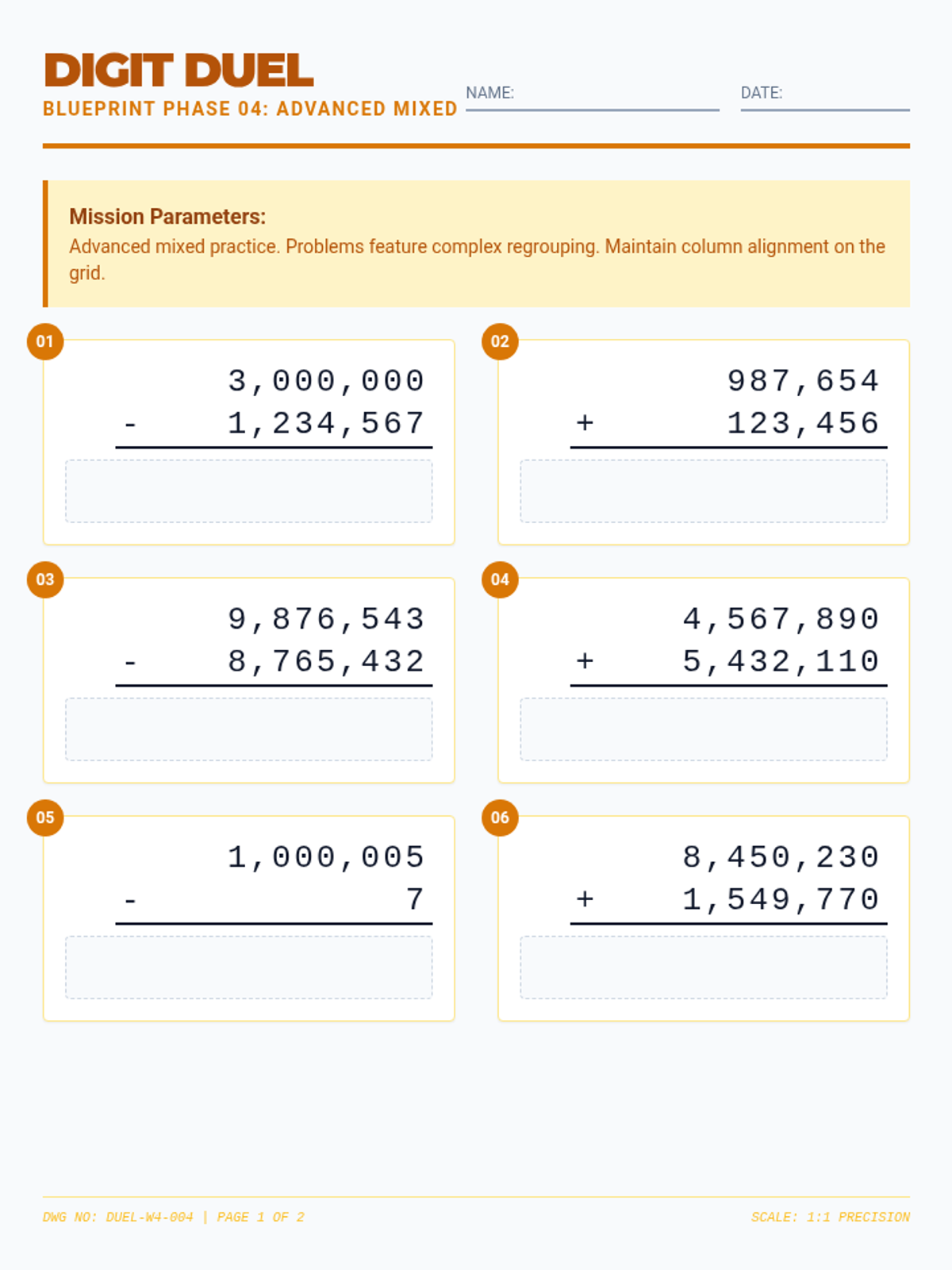 Continued mixed practice with slightly more complex regrouping scenarios and larger digit counts.