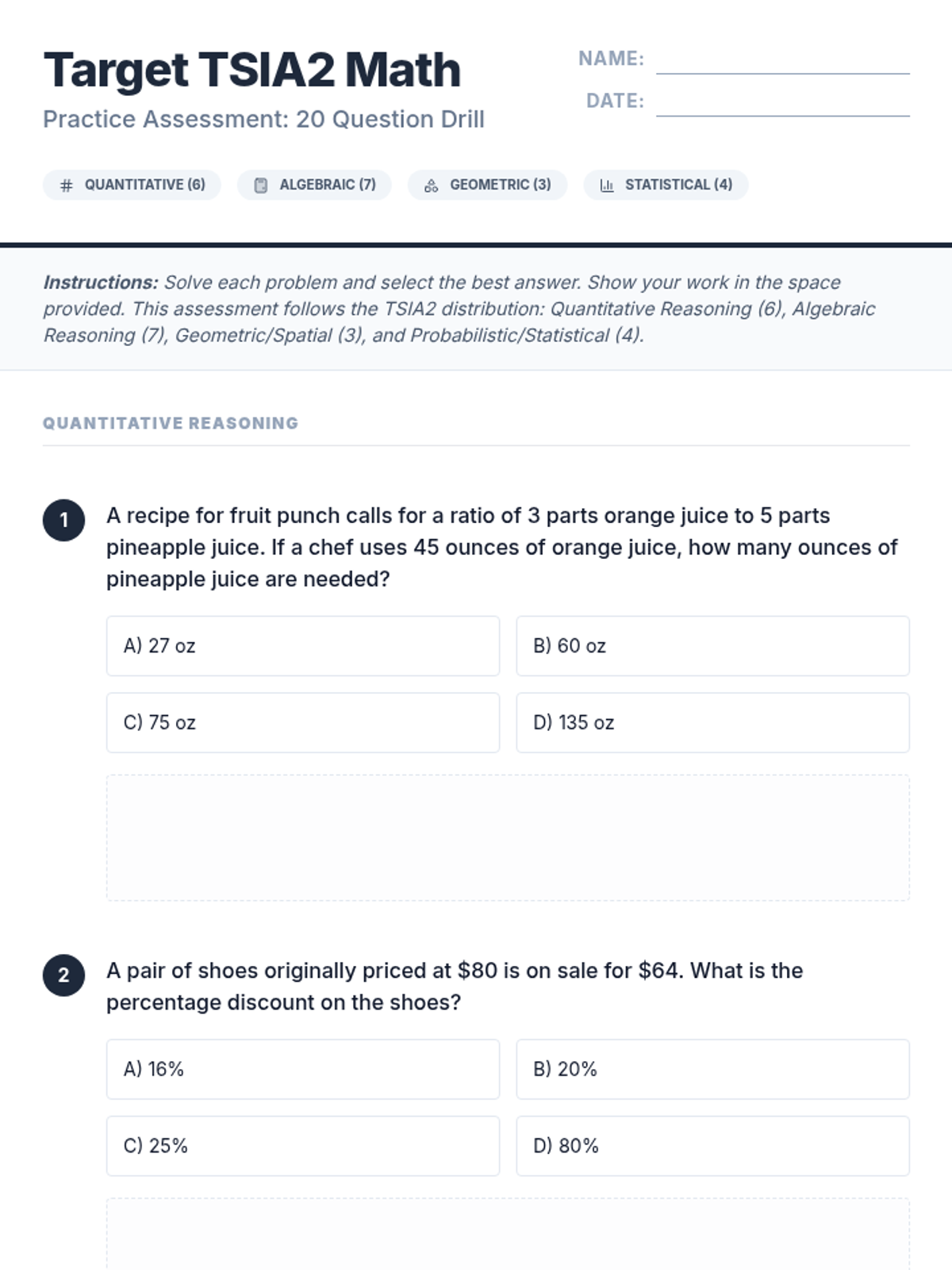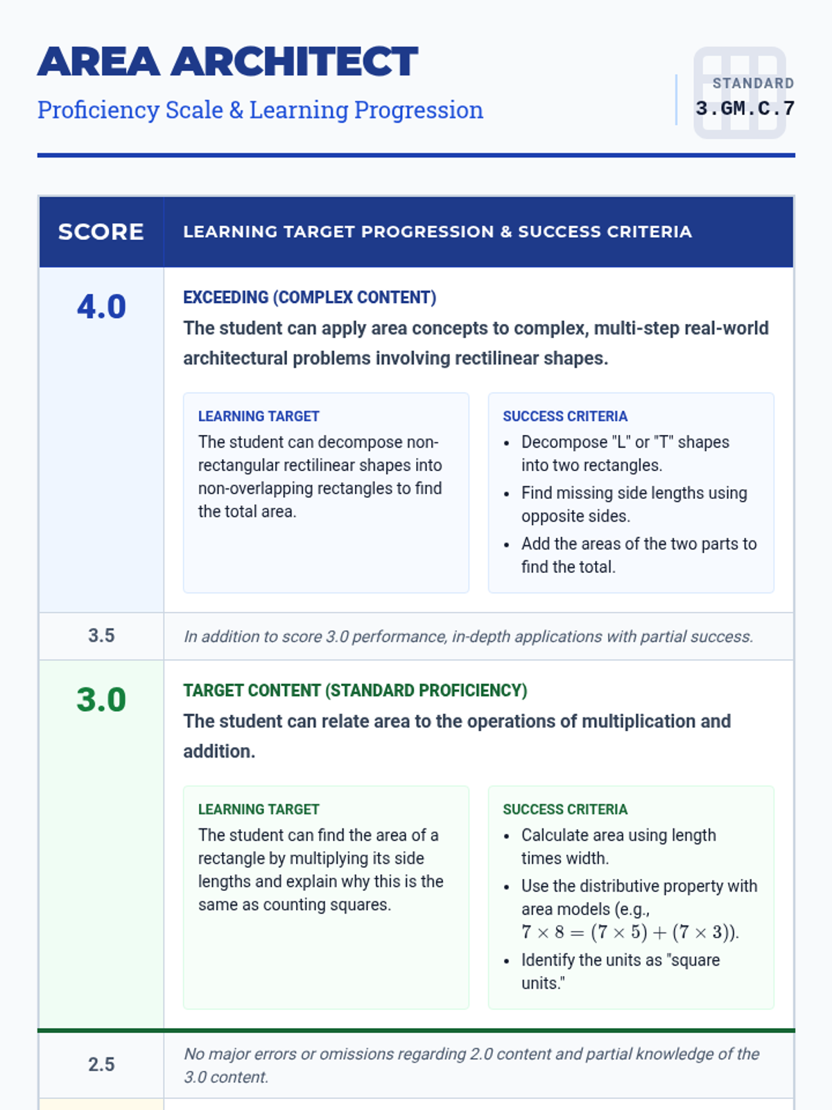 MathNumbers & CountingCounting ObjectsNumber NamesComparing NumbersNumber OperationsCounting SequenceNumbers 0-10Place Value Understanding and SystemAdd and Subtract Within 20Addition and Subtraction ConceptsAddition and Subtraction EquationsAddition and Subtraction ProblemsFoundations for MultiplicationMultiplication and Division PropertiesMultiply and Divide Within 100Multiplication and Division ProblemsFactors and MultiplesProperties of OperationsPatterns and RelationshipsGenerate and Analyze PatternsMulti-Digit ArithmeticPlace Value OperationsMulti-Digit and Decimal OperationsNumerical ExpressionsFour Operations and PatternsFour Operations Problem SolvingMeasurement & DataMeasurable AttributesMeasuring LengthsMeasure and Estimate Lengths in Standard UnitsRelate Addition and Subtraction to LengthClassifying and Counting ObjectsTime and MoneyArea Concepts and MeasurementPerimeter and Area MeasuresAngle Concepts and MeasurementTime, Volume, and MassMeasurement Unit ConversionsGeometryIdentifying ShapesShapes and AttributesShape Attributes and ReasoningShapes and CompositionClassifying 2D FiguresGeometric Figures and RelationshipsLines, Angles, and ShapesAngle, Area, and VolumeGeometric MeasurementVolume of 3D ShapesCoordinate Plane ApplicationsTransformations in the PlaneCongruence and SimilarityUnderstand congruence in terms of rigid motionsSimilarity and TransformationsProve Theorems Involving SimilarityPythagorean TheoremTrigonometry for General TrianglesMake Geometric ConstructionsProve Geometric TheoremsTheorems About CirclesFind Arc Lengths And Areas of Sectors of CirclesVolume FormulasRelationships Between Two-Dimensional and Three-Dimensional ObjectsProve Simple Geometric Theorems AlgebraicallyTranslate Between Geometric Description and Equation for Conic SectionApply Geometric Concepts in Modeling SituationsFractions & DecimalsFractions as NumbersBuilding FractionsFraction Equivalence and OrderingAdding and Subtracting FractionsMultiplying and Dividing FractionsDividing FractionsDecimal FractionsMulti-Digit Computation and FactorsAdd, Subtract, Multiply, and Divide Rational NumbersRational Number SystemIrrational Numbers and ApproximationsRatiosRatios and ProportionsProportional RelationshipsUnit RateAlgebraAlgebraic ExpressionsGenerate Equivalent ExpressionsQuantitative RelationshipsProportional Relationships and Linear EquationsEquations and InequalitiesEquation Solving and ReasoningLinear Equations and SystemsGraph Equations and InequalitiesSystems of EquationsReal-World Algebraic ProblemsQuantitative Reasoning with UnitsExpression StructureEquivalent Expression FormsRadicals and Integer ExponentsRational ExponentsRational and Irrational NumbersPolynomial OperationsPolynomial IdentitiesPolynomial Zeros and FactorsRational ExpressionsComplex Number OperationsComplex Numbers in PolynomialsComplex Numbers on PlaneStatistics & ProbabilityRepresent and Interpret DataData DistributionsStatistical VariabilityProbability ModelsCompound Event ProbabilitiesStatistical SamplingInterpret Categorical and Quantitative DataBivariate Data PatternsInterpret Linear ModelsComparing Two PopulationsRandom Processes in StatisticsIndependence and Conditional ProbabilityExpected ValuesProbability-Based Decision MakingStatistical Inference and ConclusionsFunctionsFunction Concepts and NotationDefine and Compare FunctionsInterpret Functions in ContextAnalyze Function RepresentationsModel Relationships with FunctionsIdentify Linear vs Exponential GrowthDistinguish Between Function TypesCompare Growth RatesInterpret Function ExpressionsBuild Functions from RelationshipsConstruct and Model FunctionsTransform and Combine FunctionsModel Comparison and SelectionSolve Exponential EquationsTrigonometryTrigonometric Ratios Involving Right TrianglesTrigonometric Functions and Unit CircleModel with Trigonometric FunctionsTrigonometric IdentitiesVectors & MatricesIntroduction to Vectors and MatricesVector QuantitiesVector OperationsMatrix OperationsCalculusLimits and ContinuityDerivative Concepts and NotationDerivative Rules and TechniquesApplications of DerivativesOptimization ProblemsRelated RatesCurve Sketching and AnalysisIntegration Concepts and NotationAntiderivatives and Indefinite IntegralsDefinite Integrals and AreaFundamental Theorem of CalculusIntegration TechniquesApplications of IntegrationDifferential EquationsSequences and SeriesParametric and Polar FunctionsVector-Valued Functions
