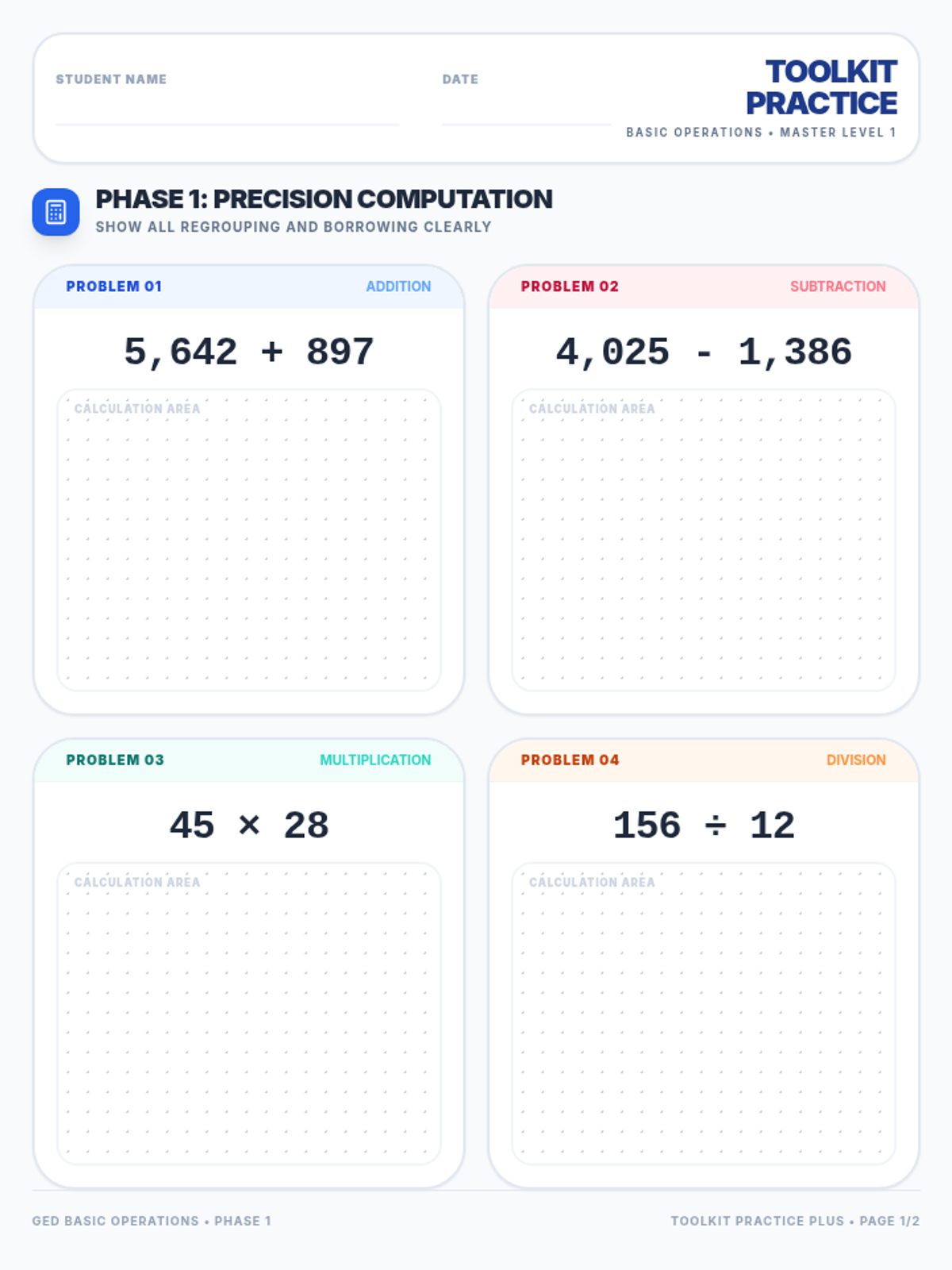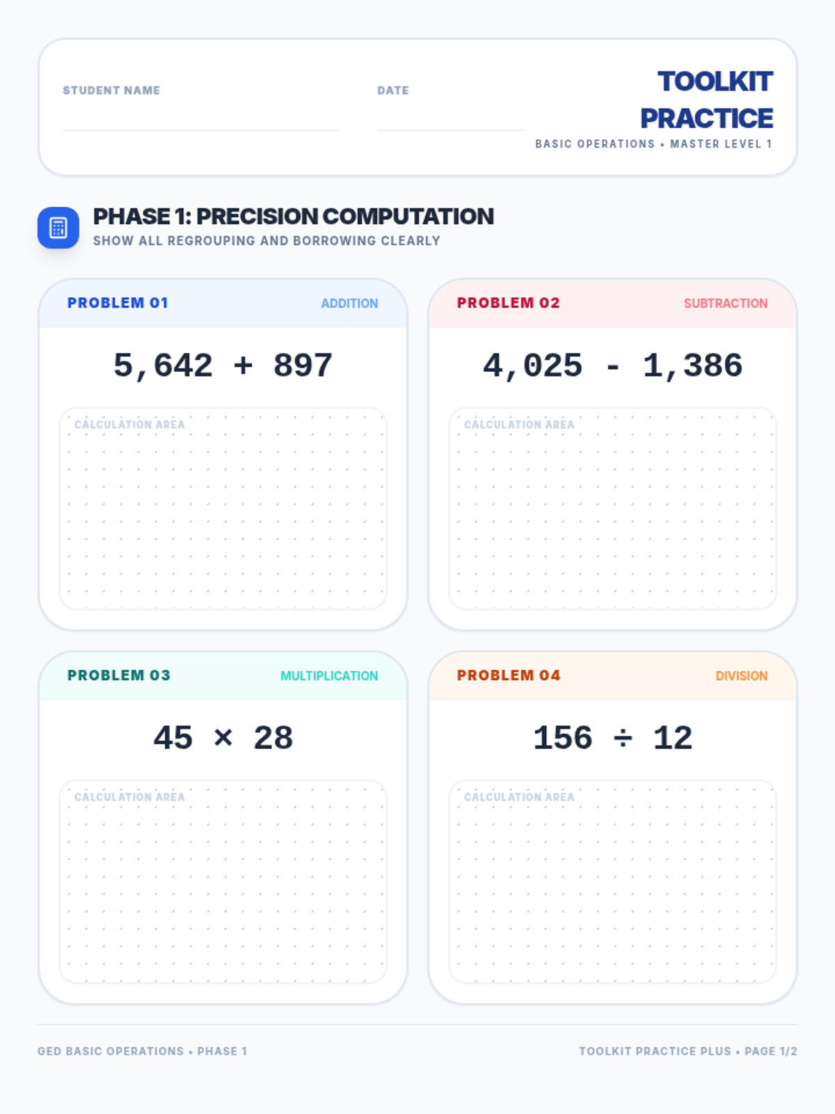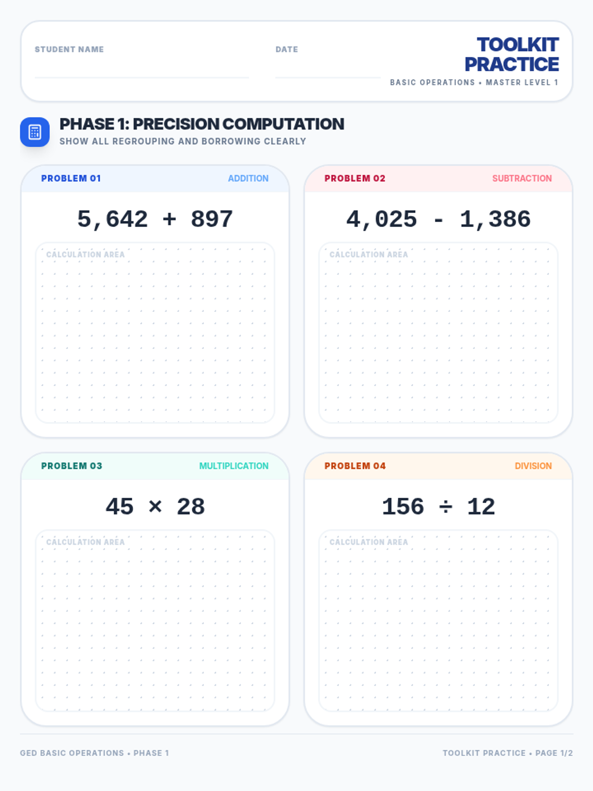 Addition and Subtraction ConceptsMental math strategies, regrouping techniques, and the inverse relationship between operations. Builds computational fluency through visual models, number lines, and real-world word problems.