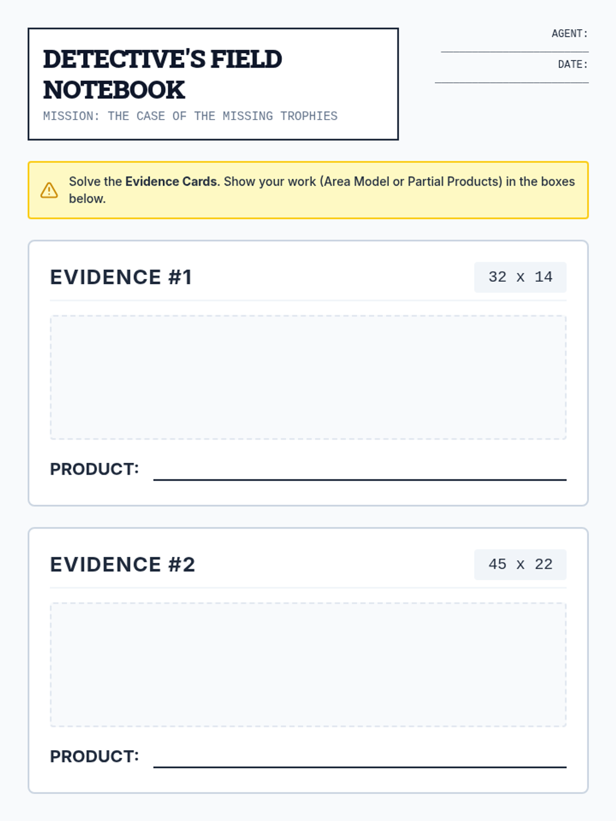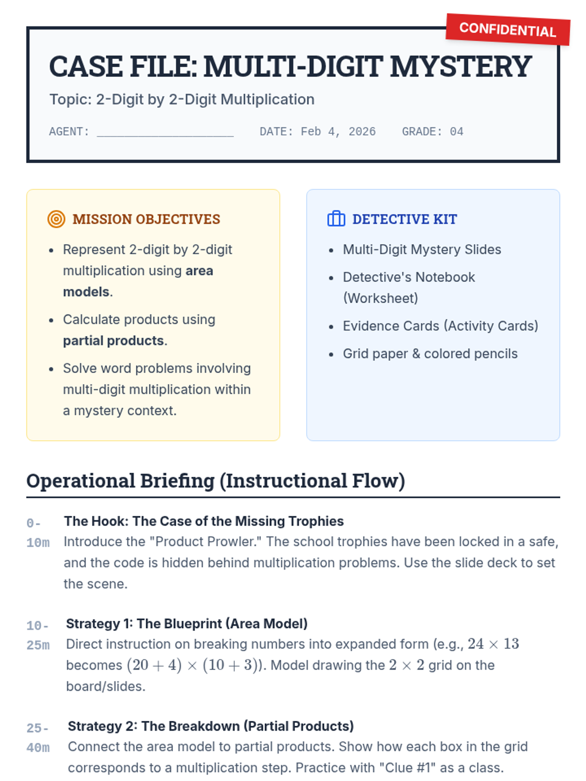 A 4th-grade math lesson that uses a detective mystery theme to teach 2-digit by 2-digit multiplication strategies, including area models and partial products. Students become 'Math Detectives' to solve a case by decoding multi-digit clues.