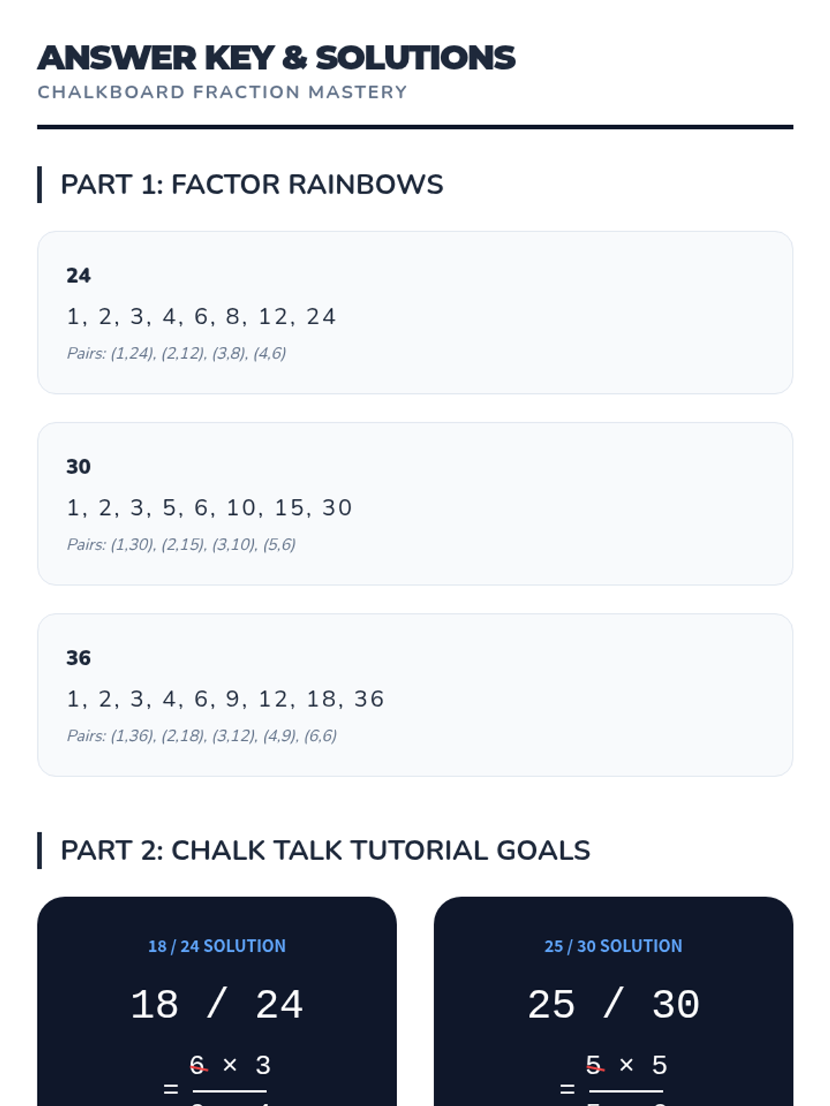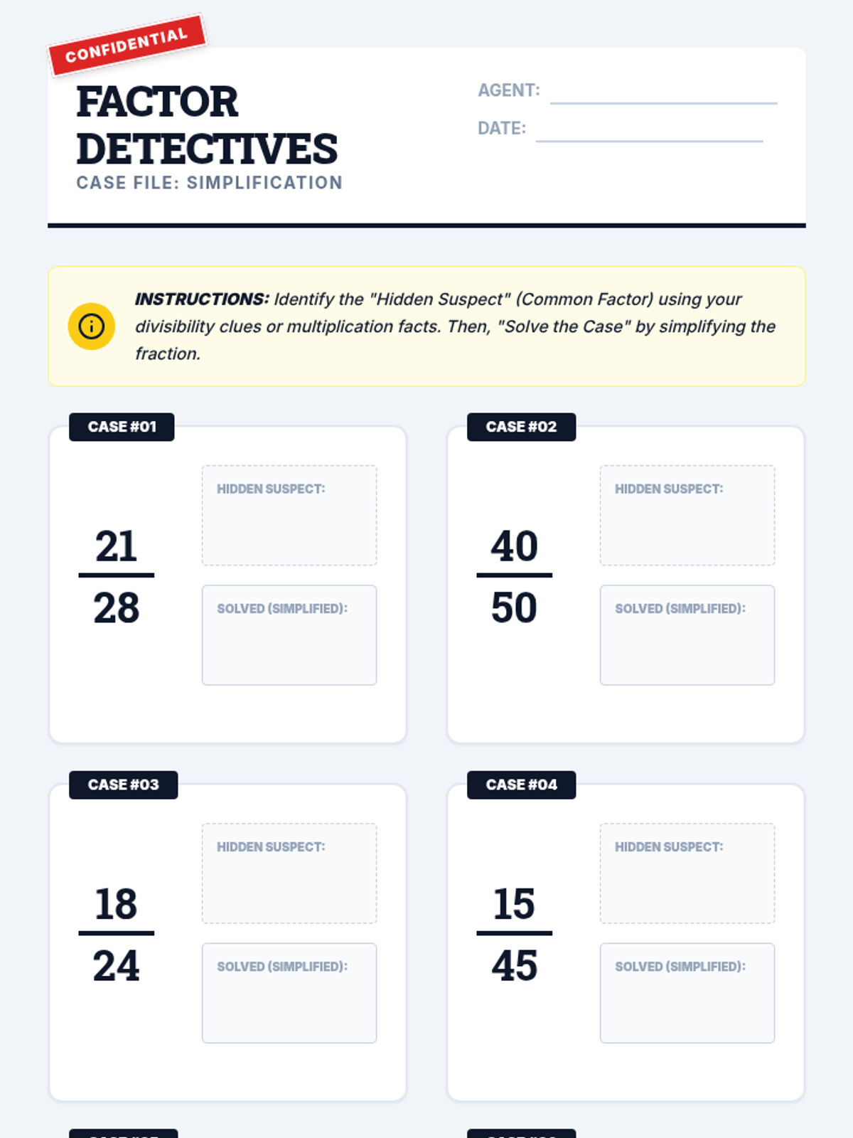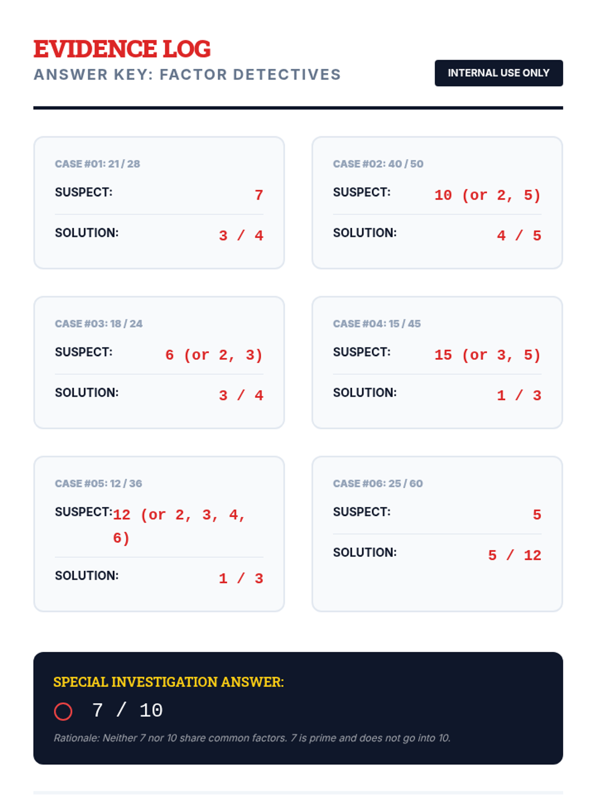 Factors and MultiplesPrime and composite numbers, divisibility rules, and the relationship between multiplication and division. Strengthens skills in identifying greatest common factors and least common multiples for fraction operations.
