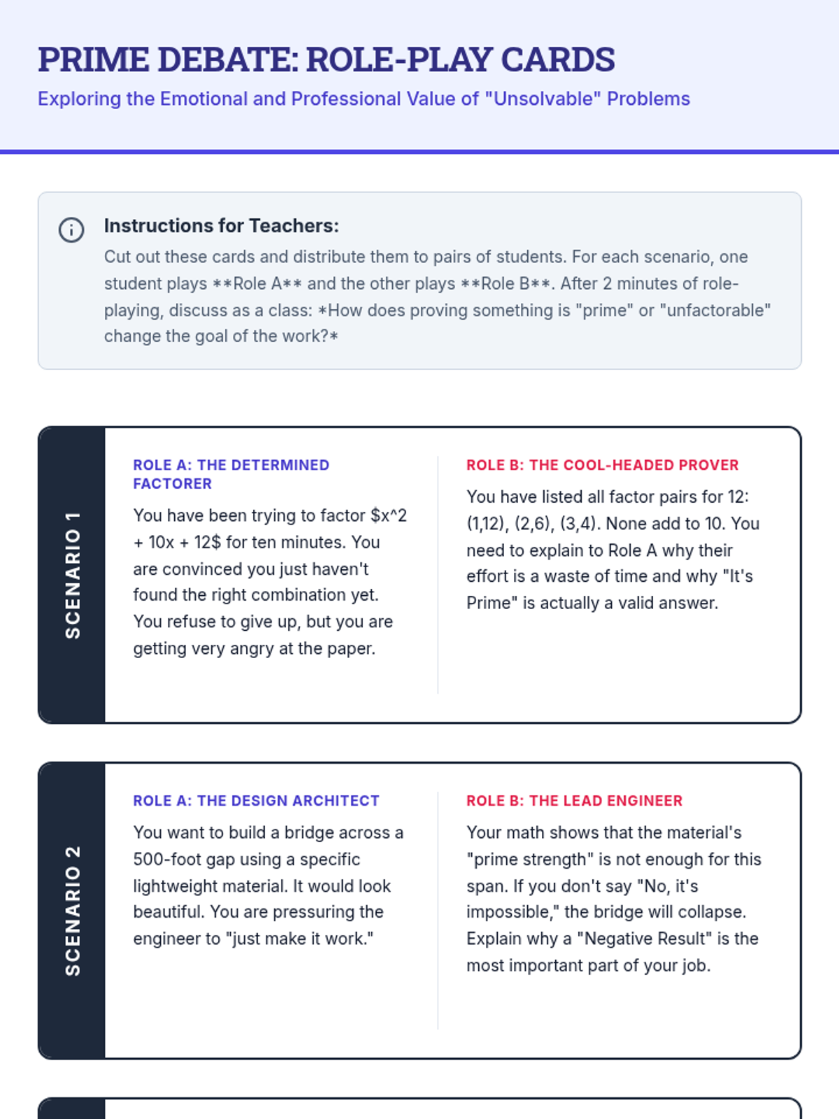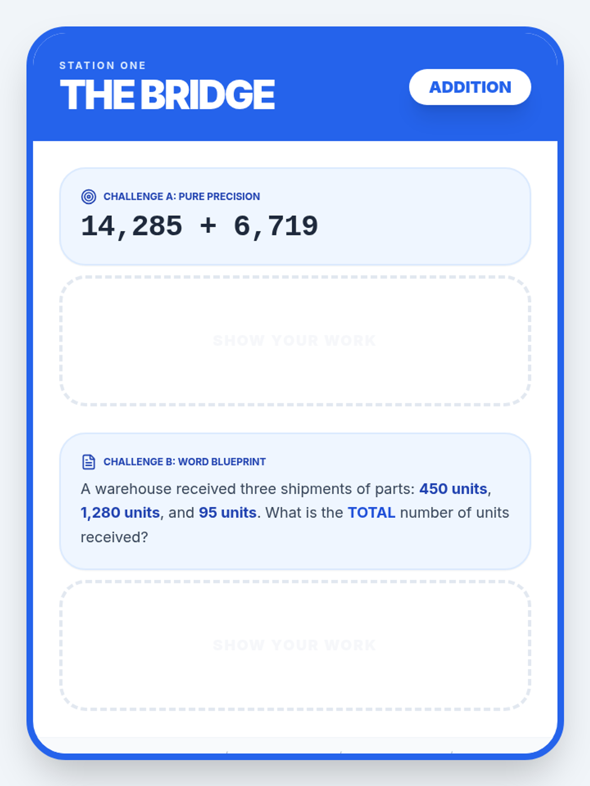 Applying both addition and subtraction to multi-step real-world scenarios using a set of interactive scenario cards.